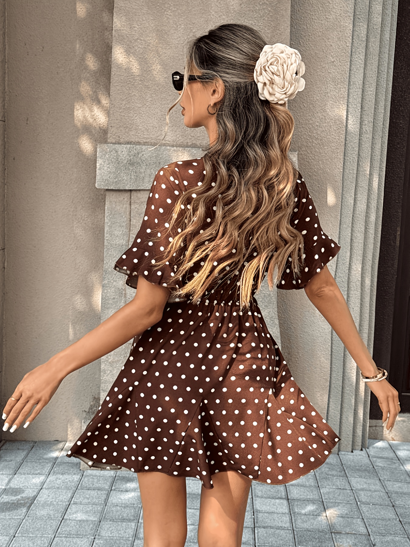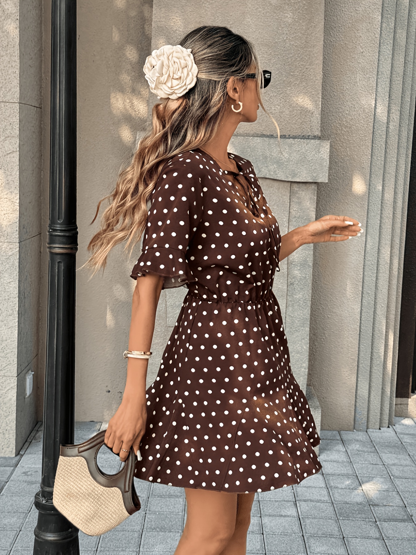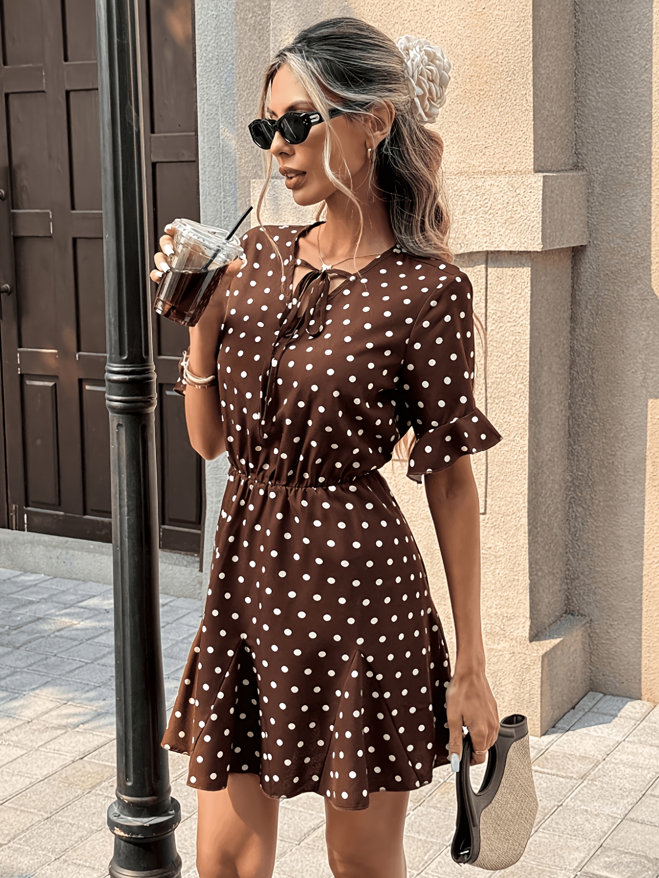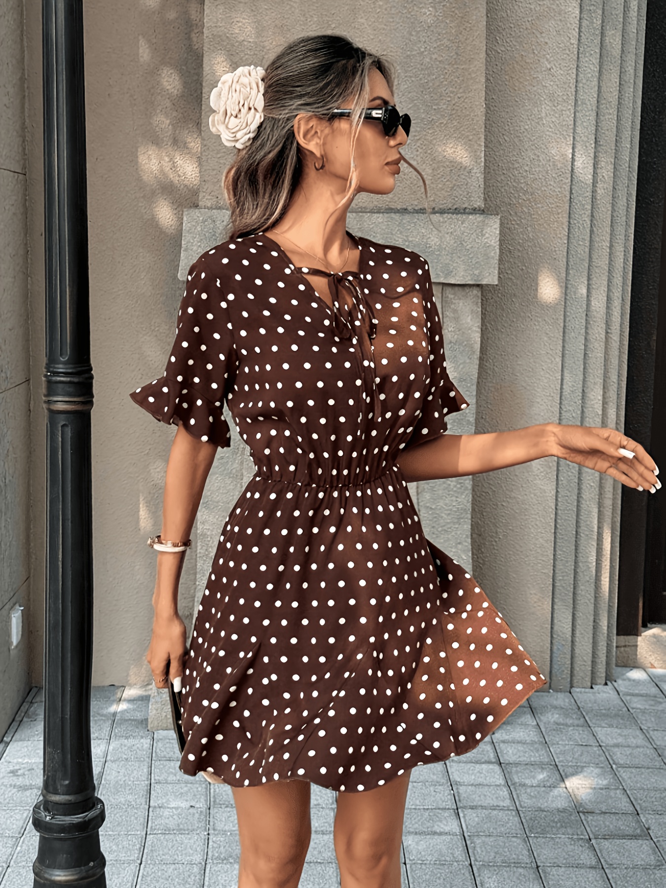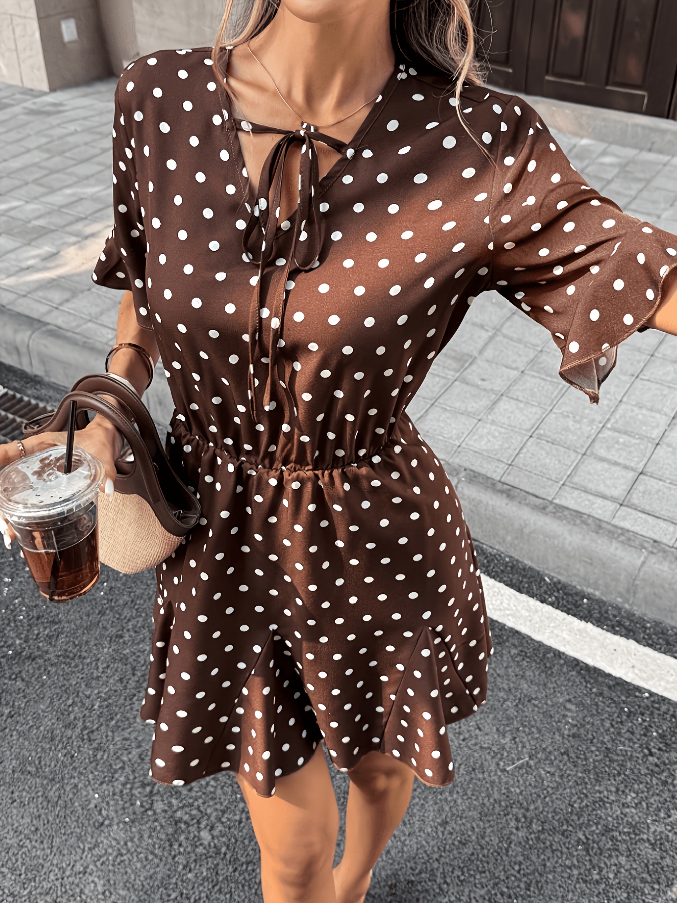 16 Aprile 2026Abito corto elegante da donna, stile francese, scollo a V, maniche corte, legatura in vita, orlo a balze, stampa a pois, collezione primavera/estate
