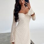 Abito Vestito body corto a girocollo, vita alta, tinta unita, con maniche lunghe e motivo a traforo intrecciato