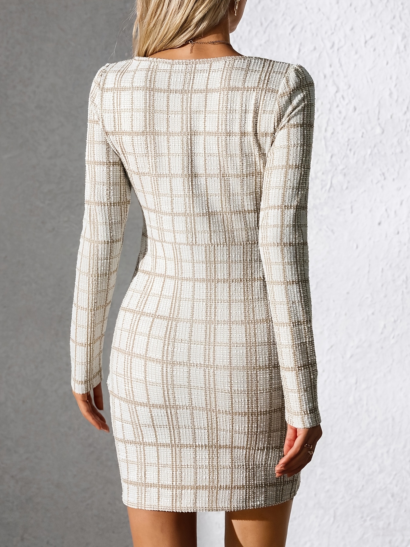 25 Febbraio 2026Vestito elegante donna con scollo quadrato, maniche lunghe e motivo a quadri beige e bianco, aderente con dettaglio incrociato sul davanti, lavabile in lavatrice, abbigliamento autunno inverno per feste e look casual, silhouette modellante