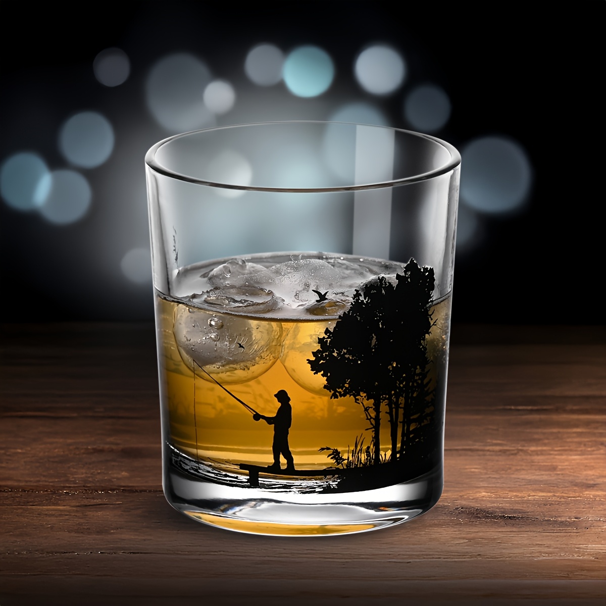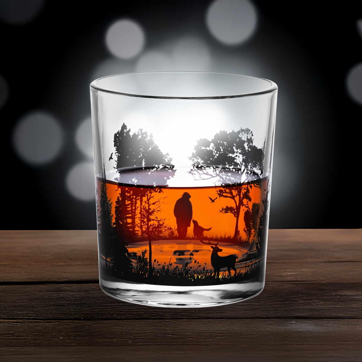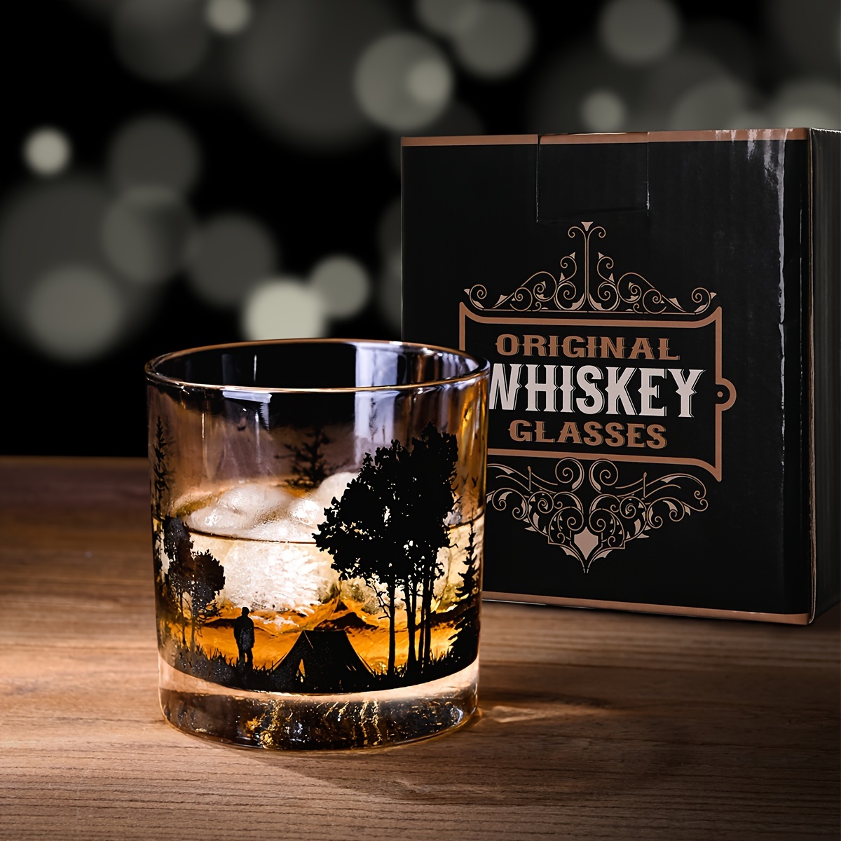 28 Febbraio 2026Bicchiere Una confezione regalo contenente un bicchiere da whiskey classico in vetro con un design a paesaggio forestale.