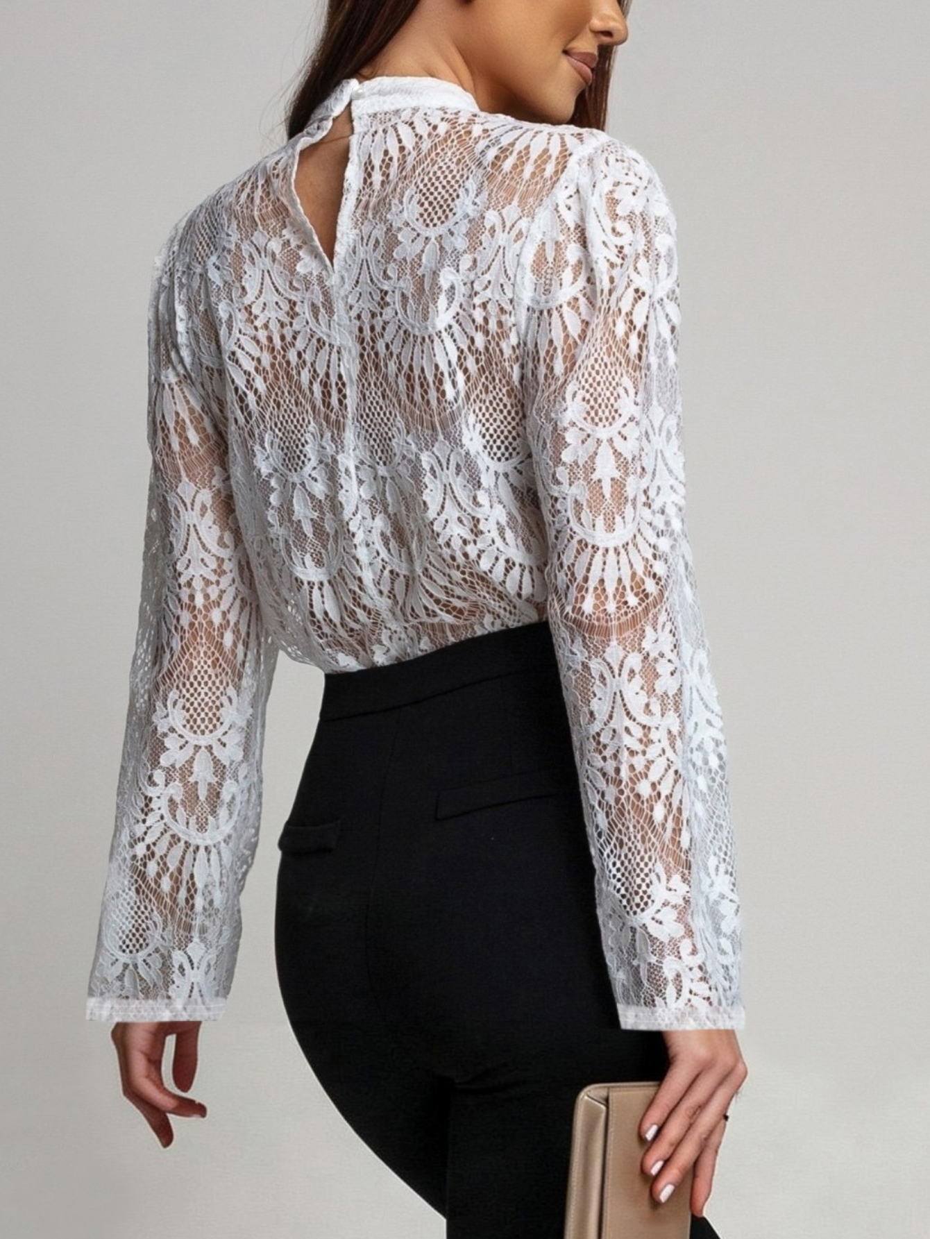 16 Aprile 2026Camicetta da donna a maniche lunghe in pizzo bianco con collo alto, design floreale trasparente e stile casual elegante e romantico