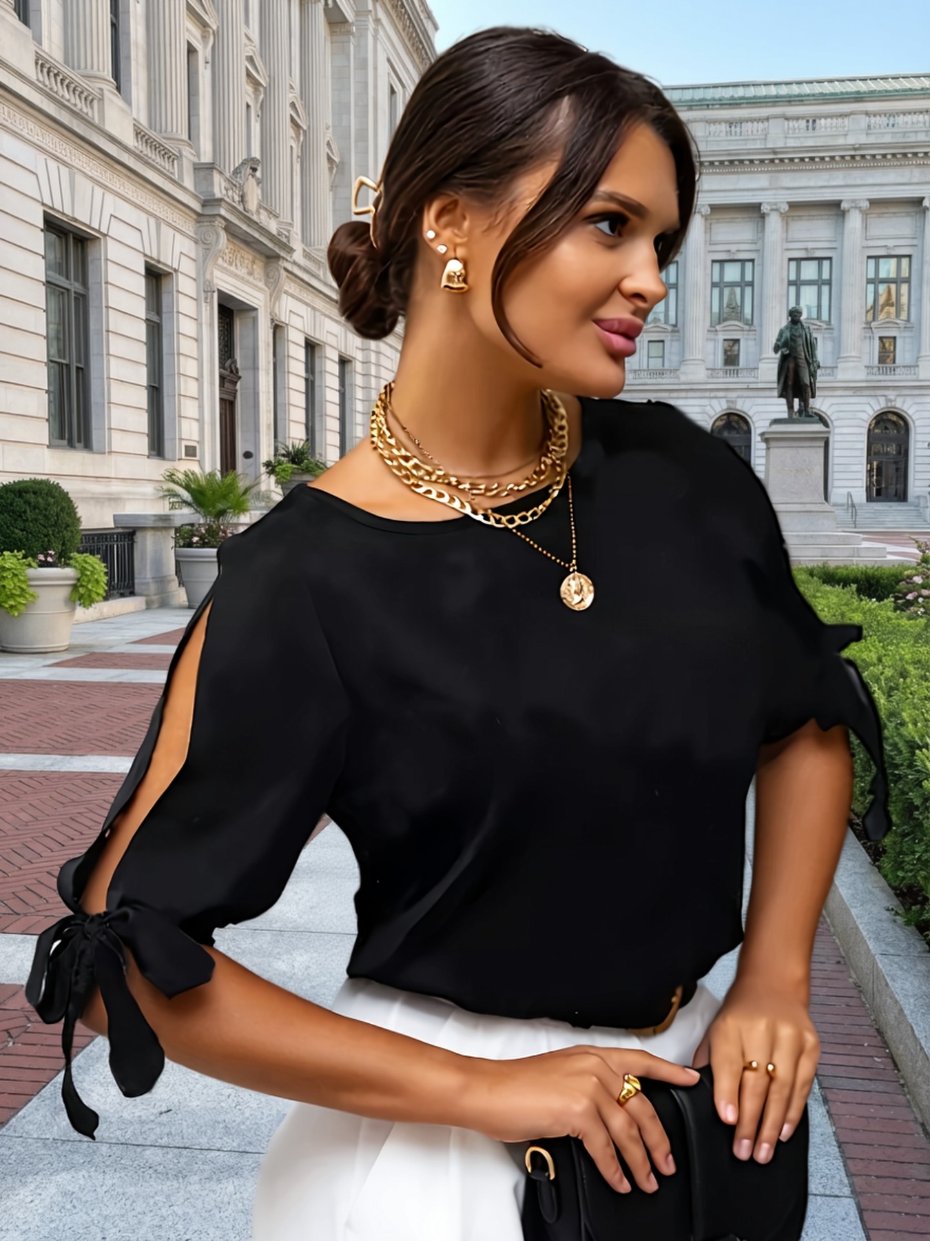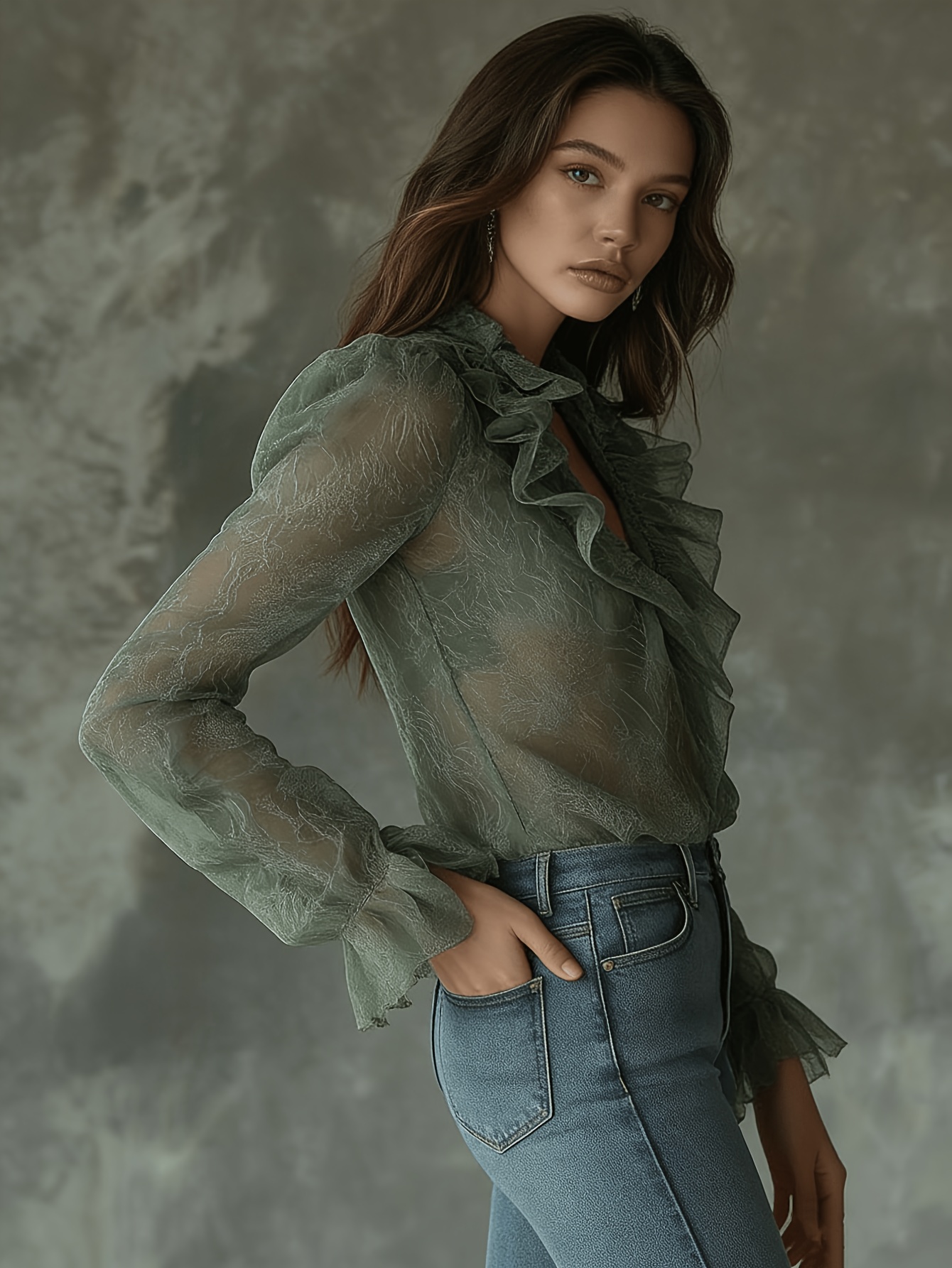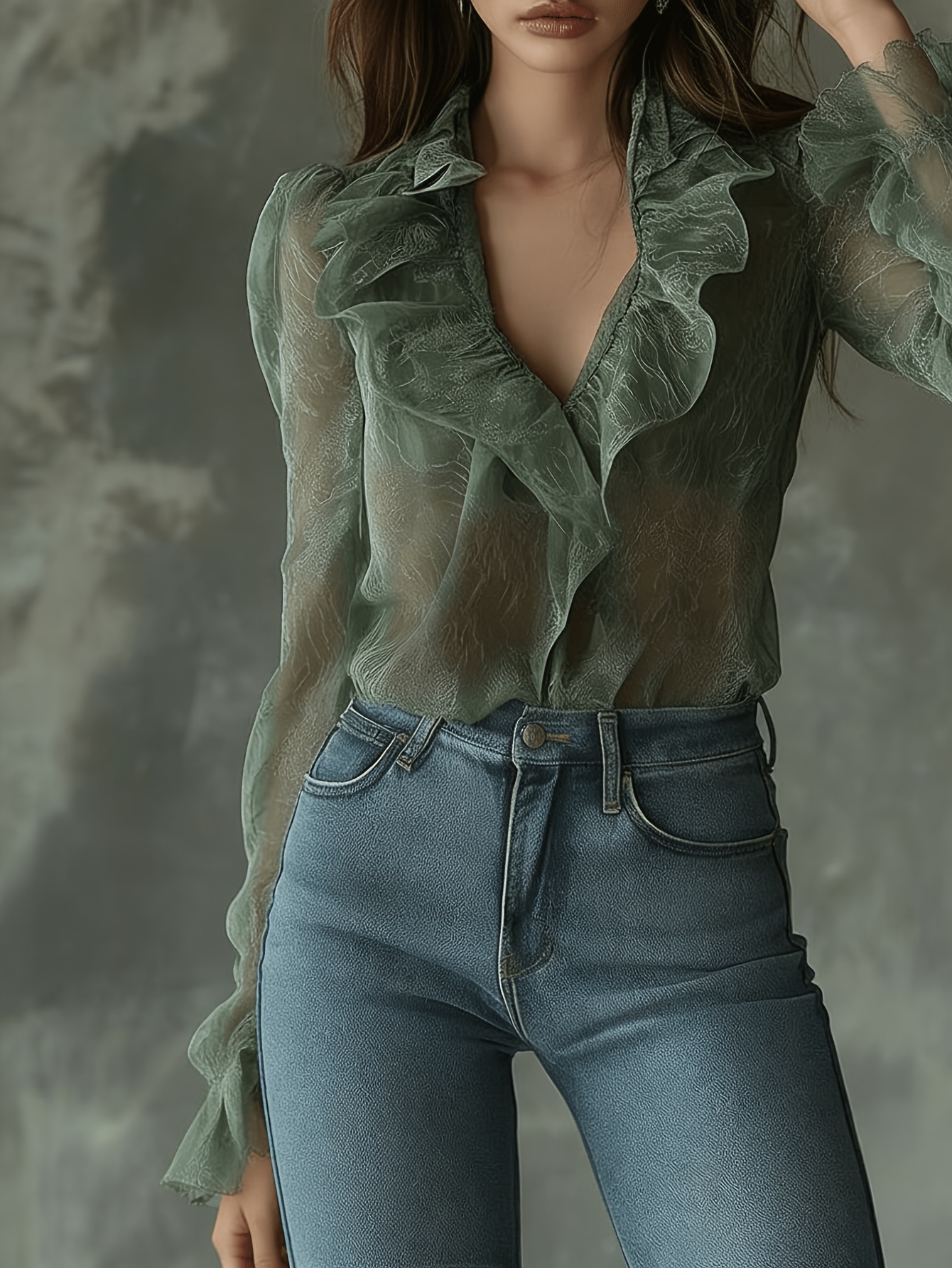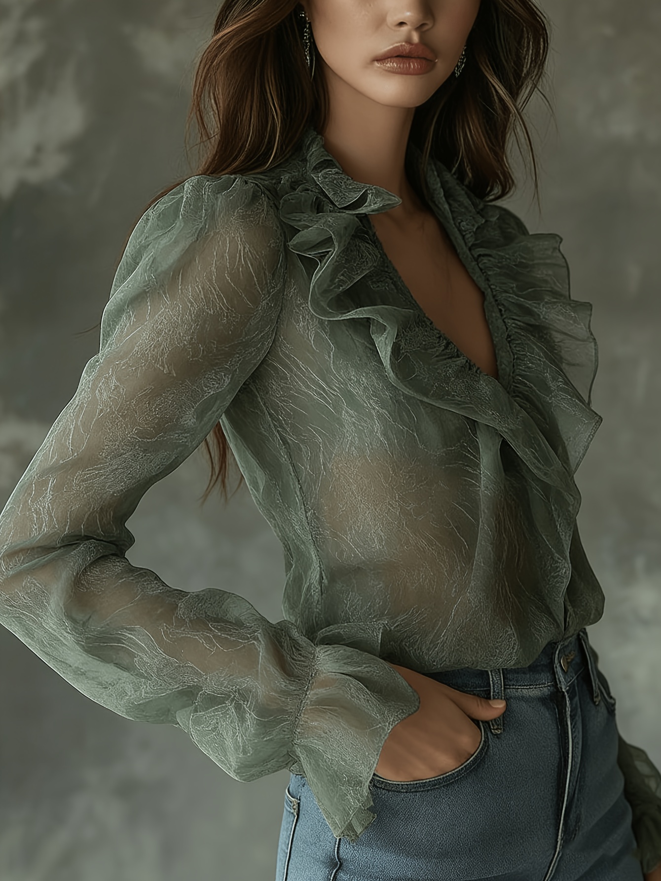 16 Aprile 2026Camicetta da donna in chiffon stile vintage con bordi arricciati e maniche lunghe trasparenti, progettata con maniche svasate, che la rende un top elegante e versatile