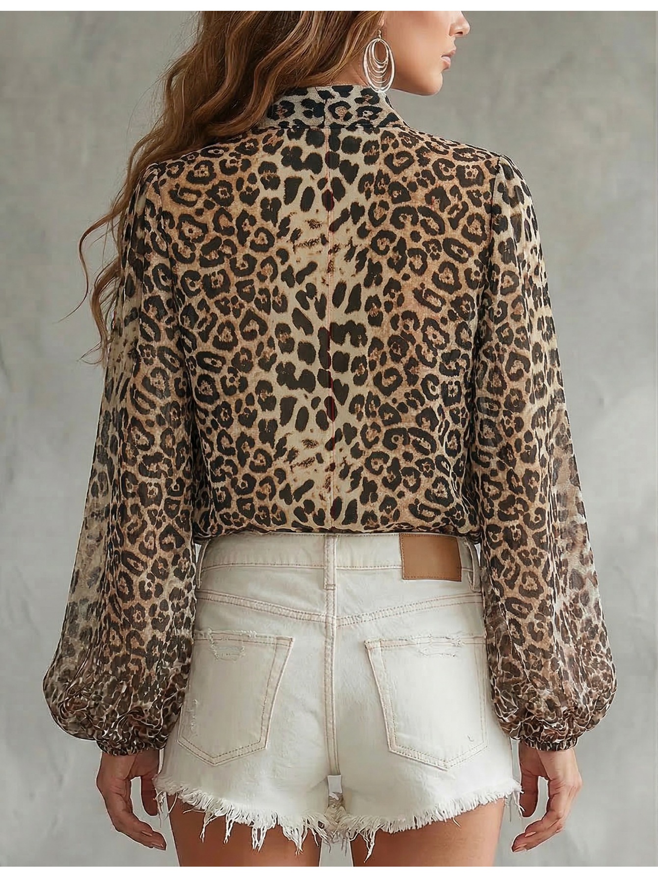 16 Aprile 2026Camicetta in chiffon con stampa leopardata e lacci, scollo a V, top retrò da donna, elegante camicia casual per il pendolarismo e orientamento all’aria aperta