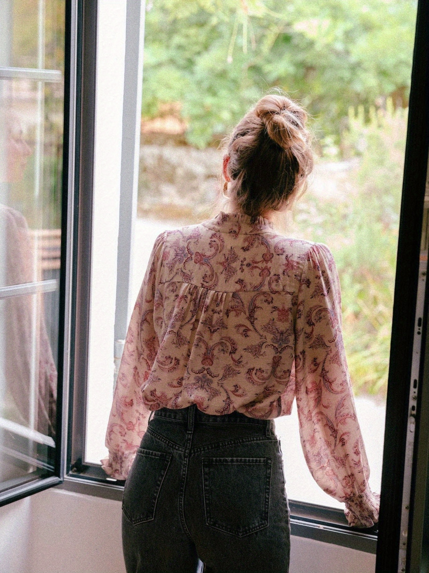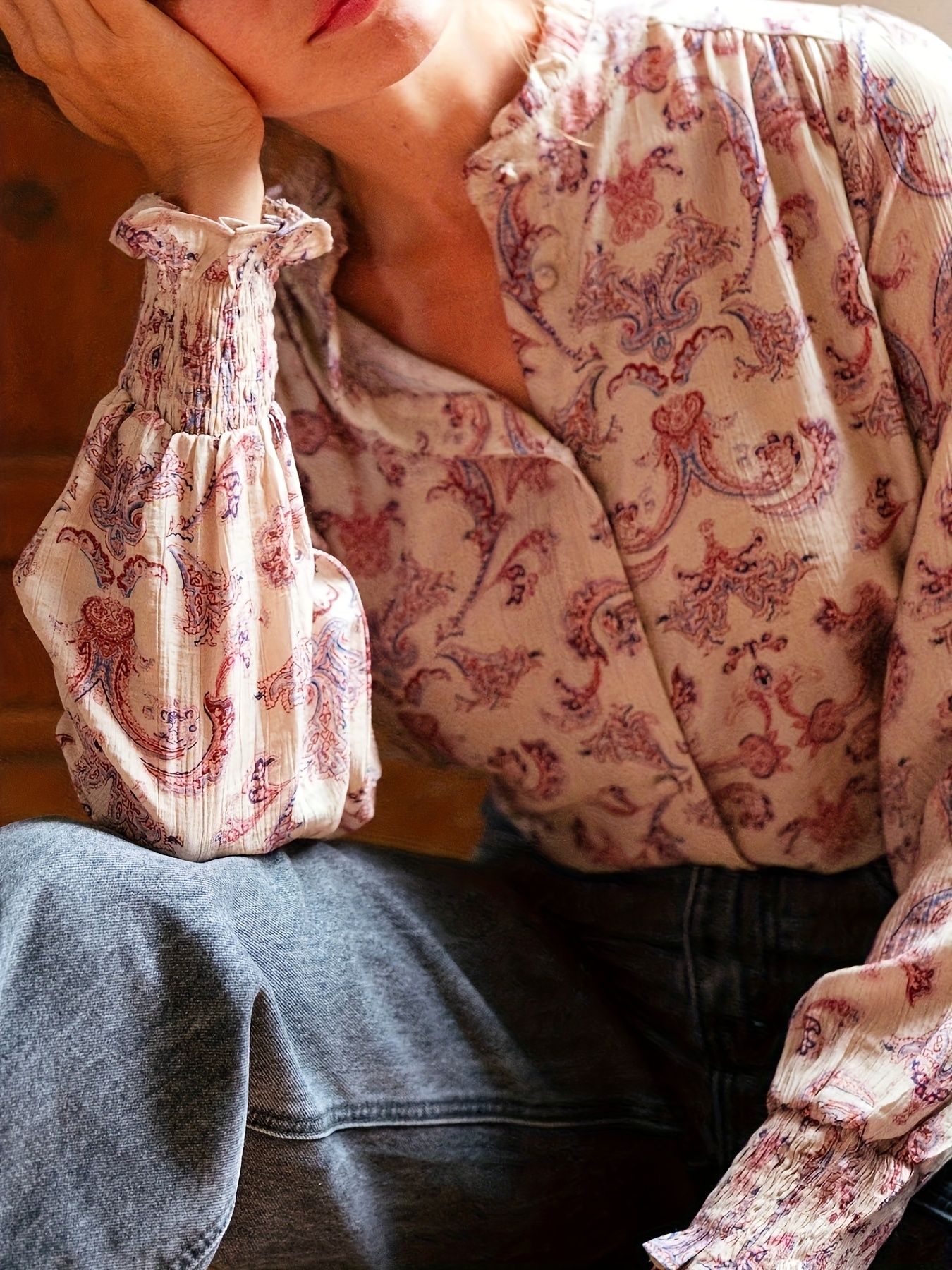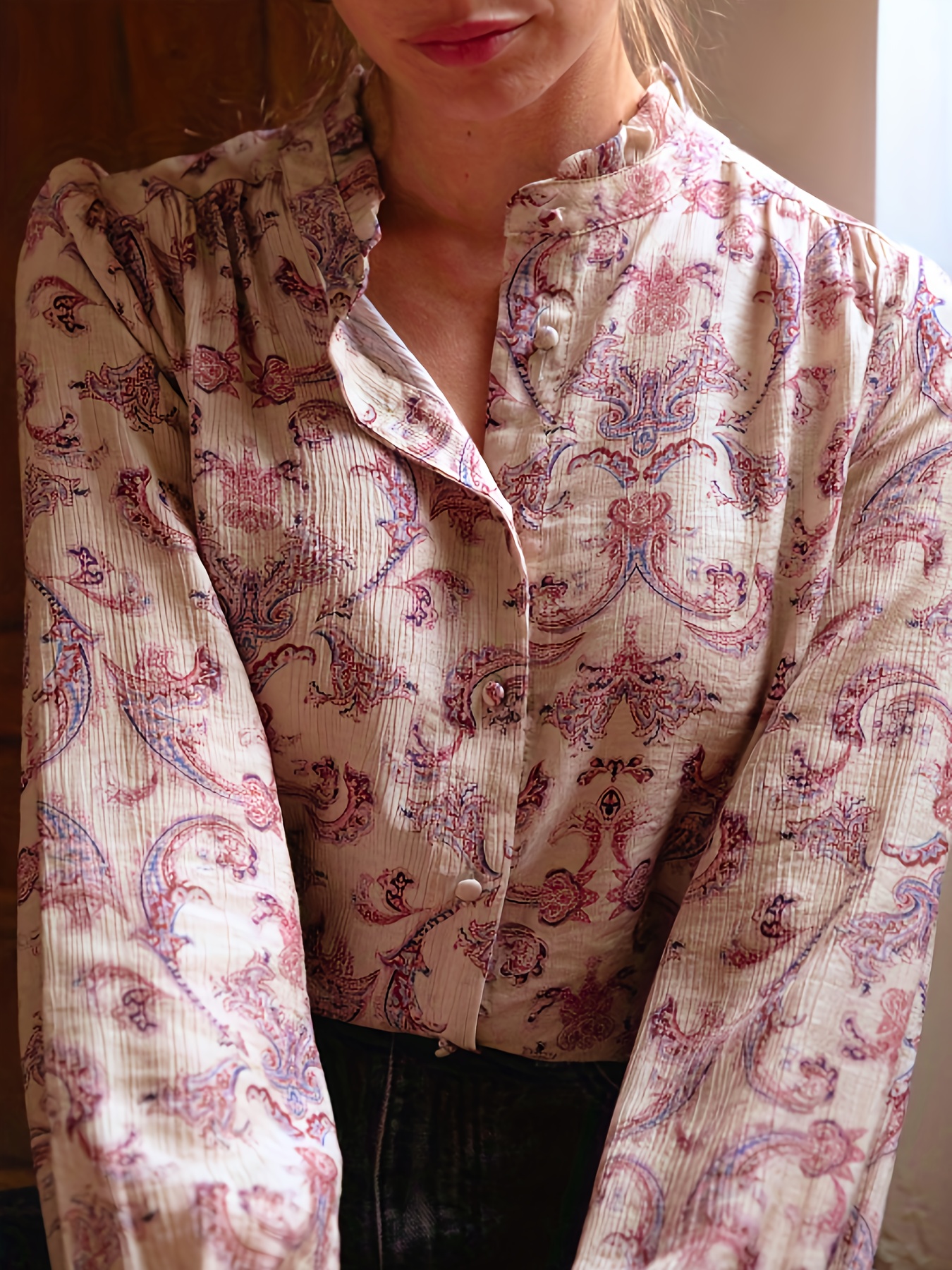 Camicia a maniche lunghe in chiffon jacquard traforato alla moda, con motivo floreale