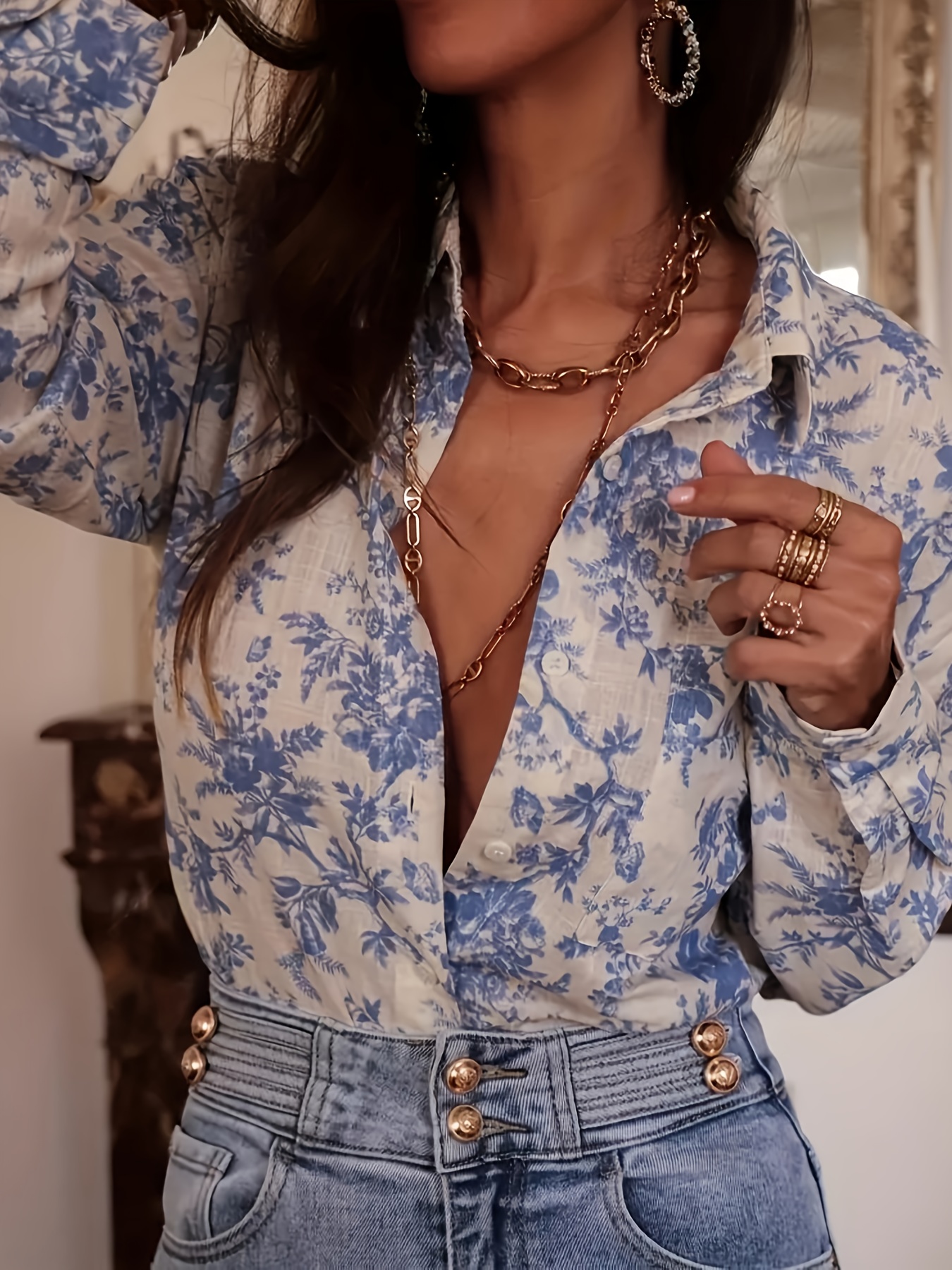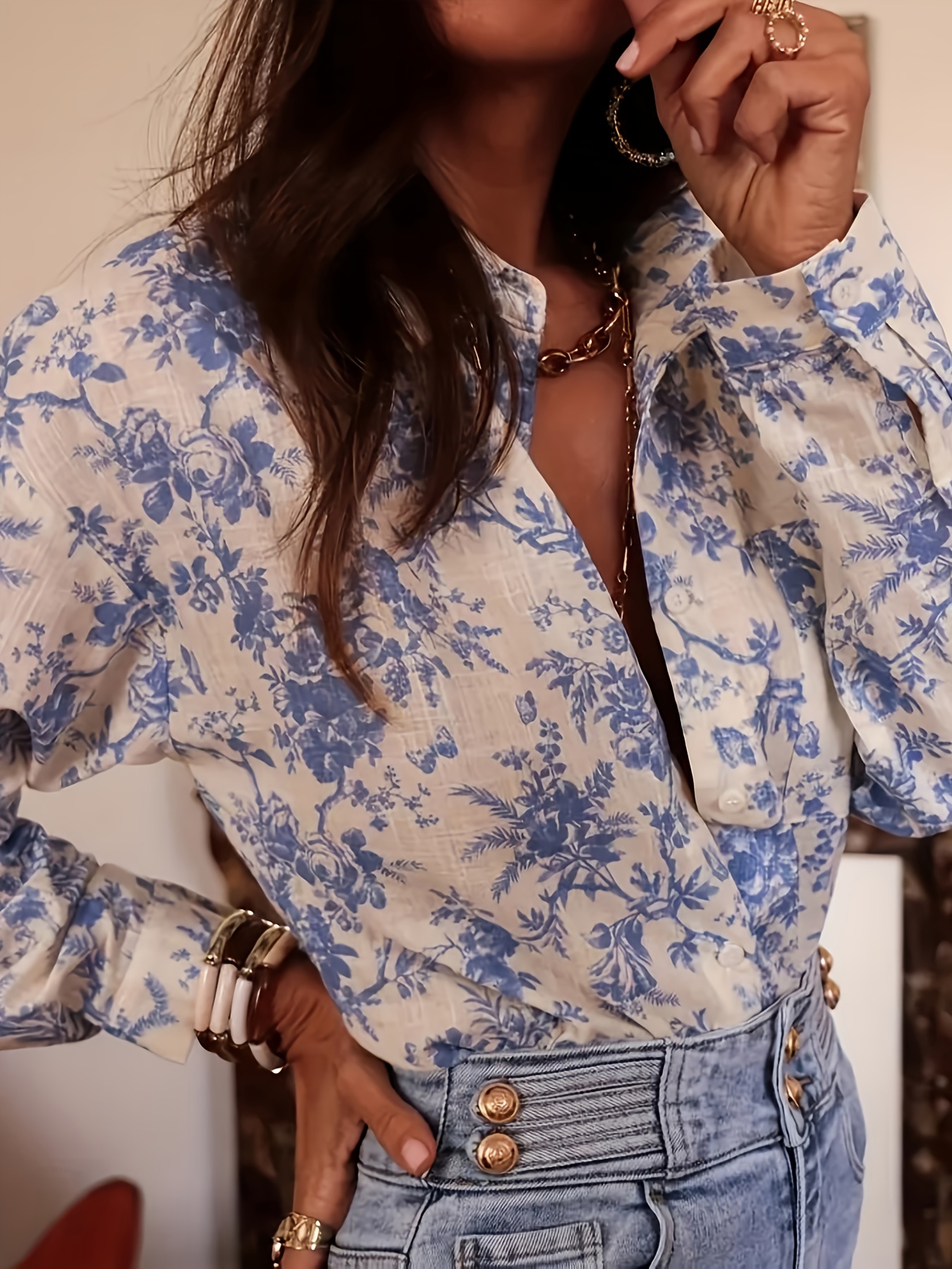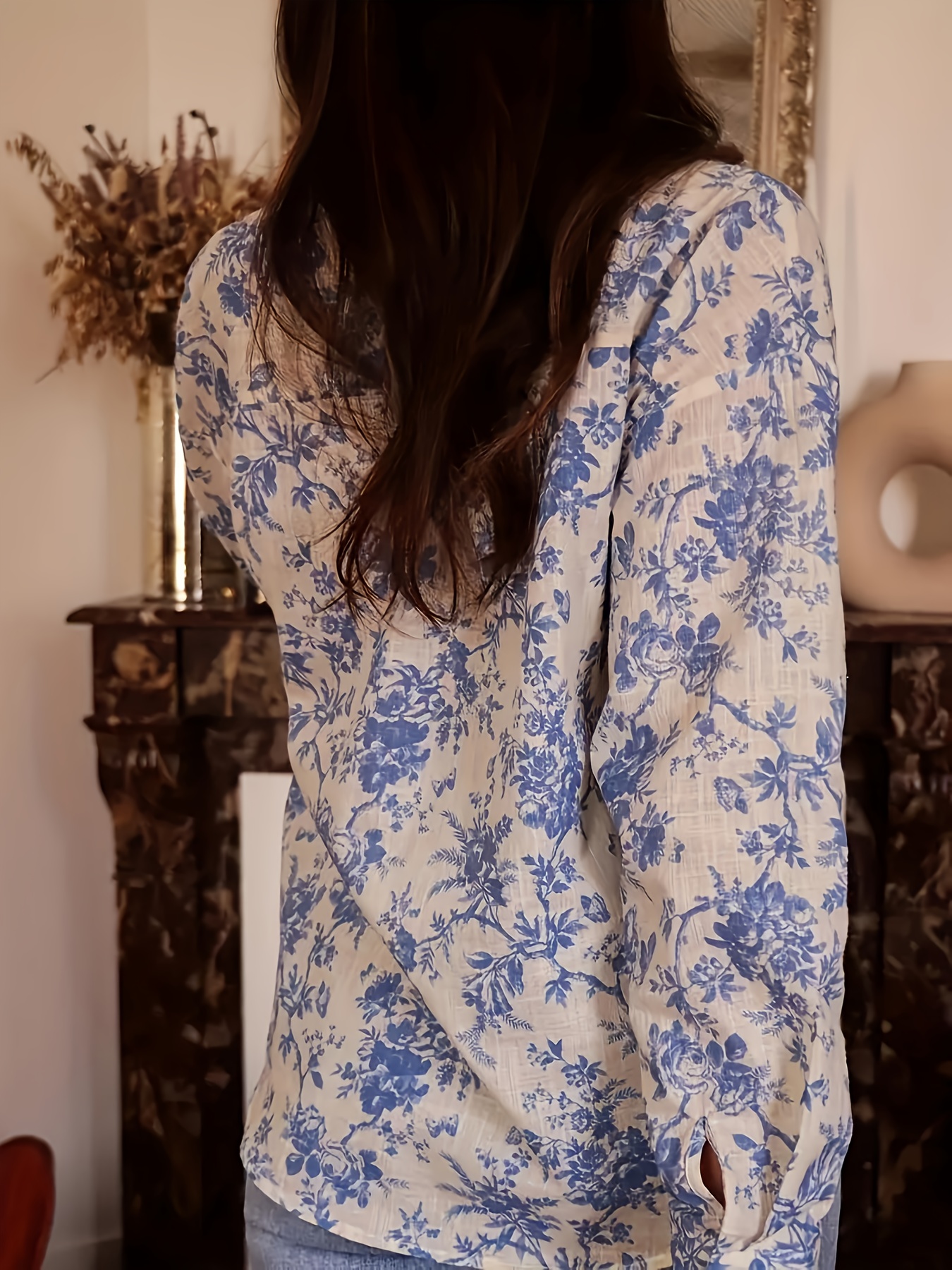 16 Aprile 2026Camicia da donna a maniche lunghe con stampa floreale – Motivo bambù azzurro chiaro, traspirante e morbida – Perfetta per primavera/autunno, lavoro, casual e viaggio