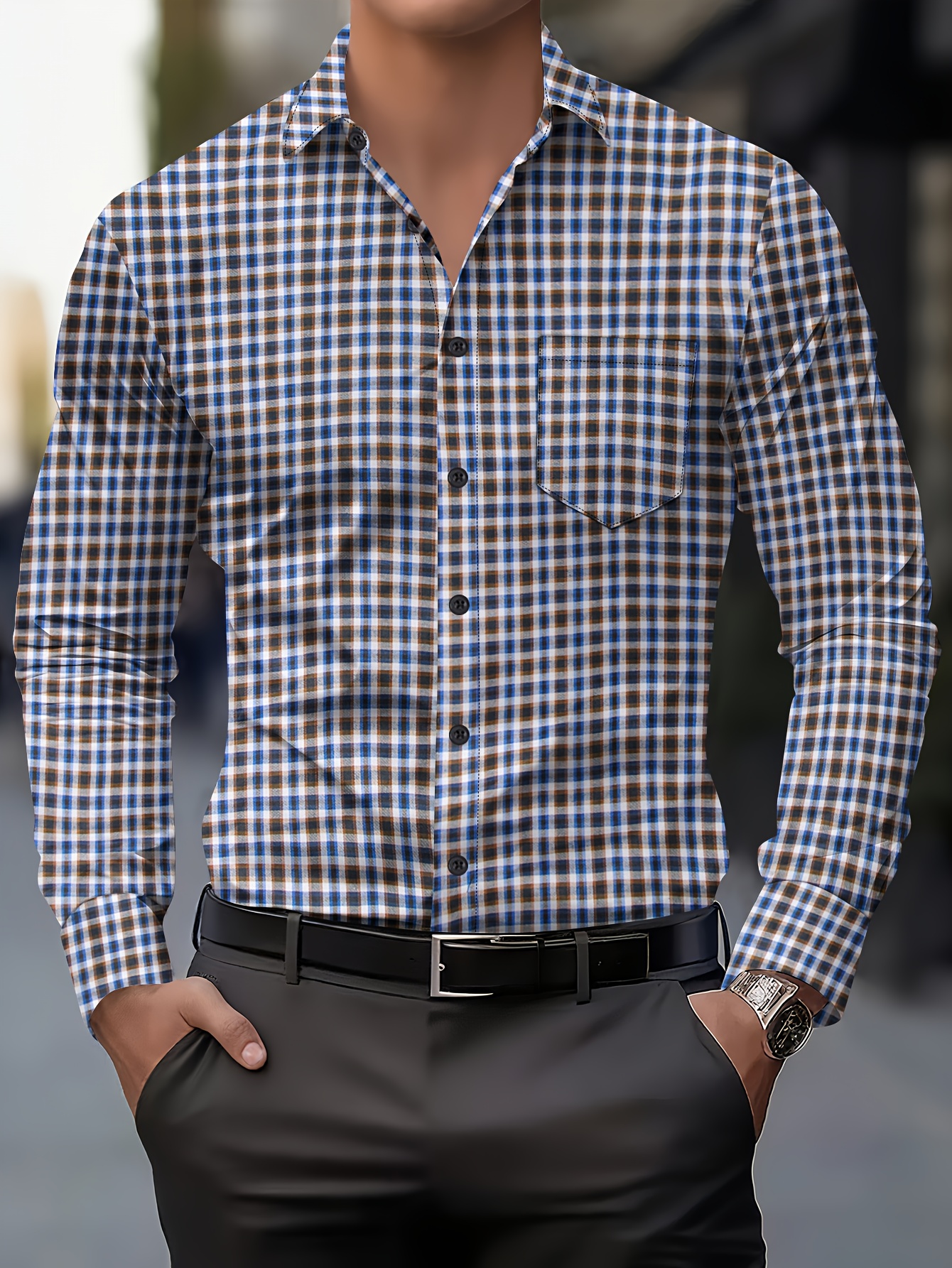 Camicia in Cotone da Uomo con Tasche, Design a Blocchi di Colore a Quadri,