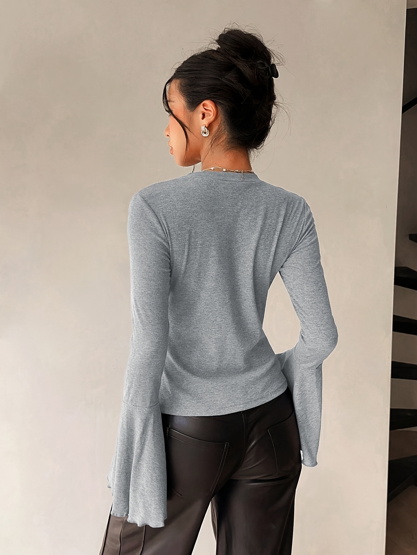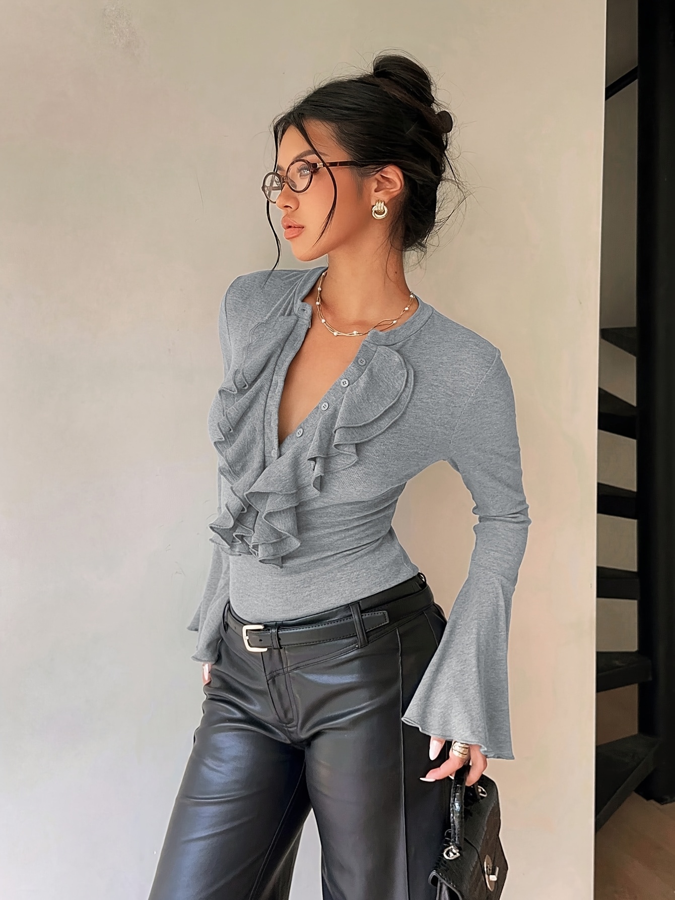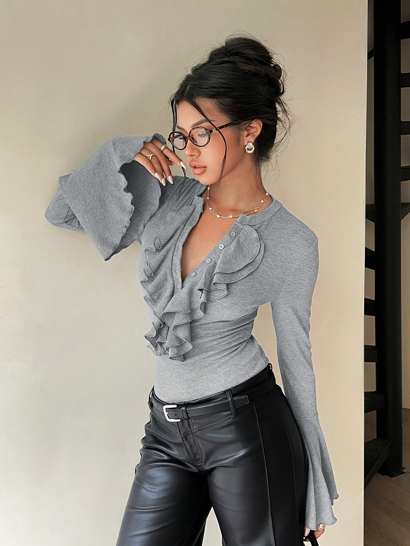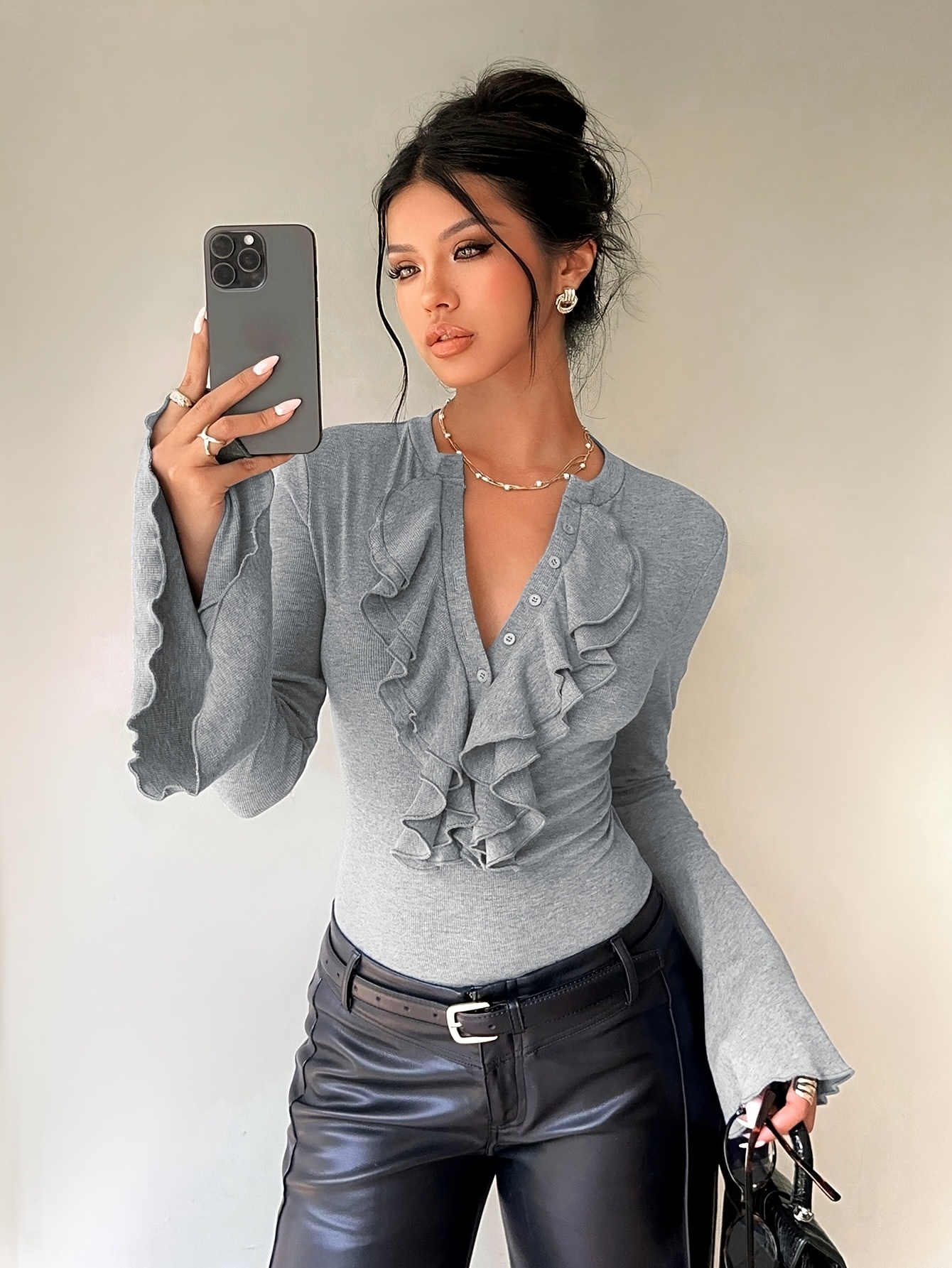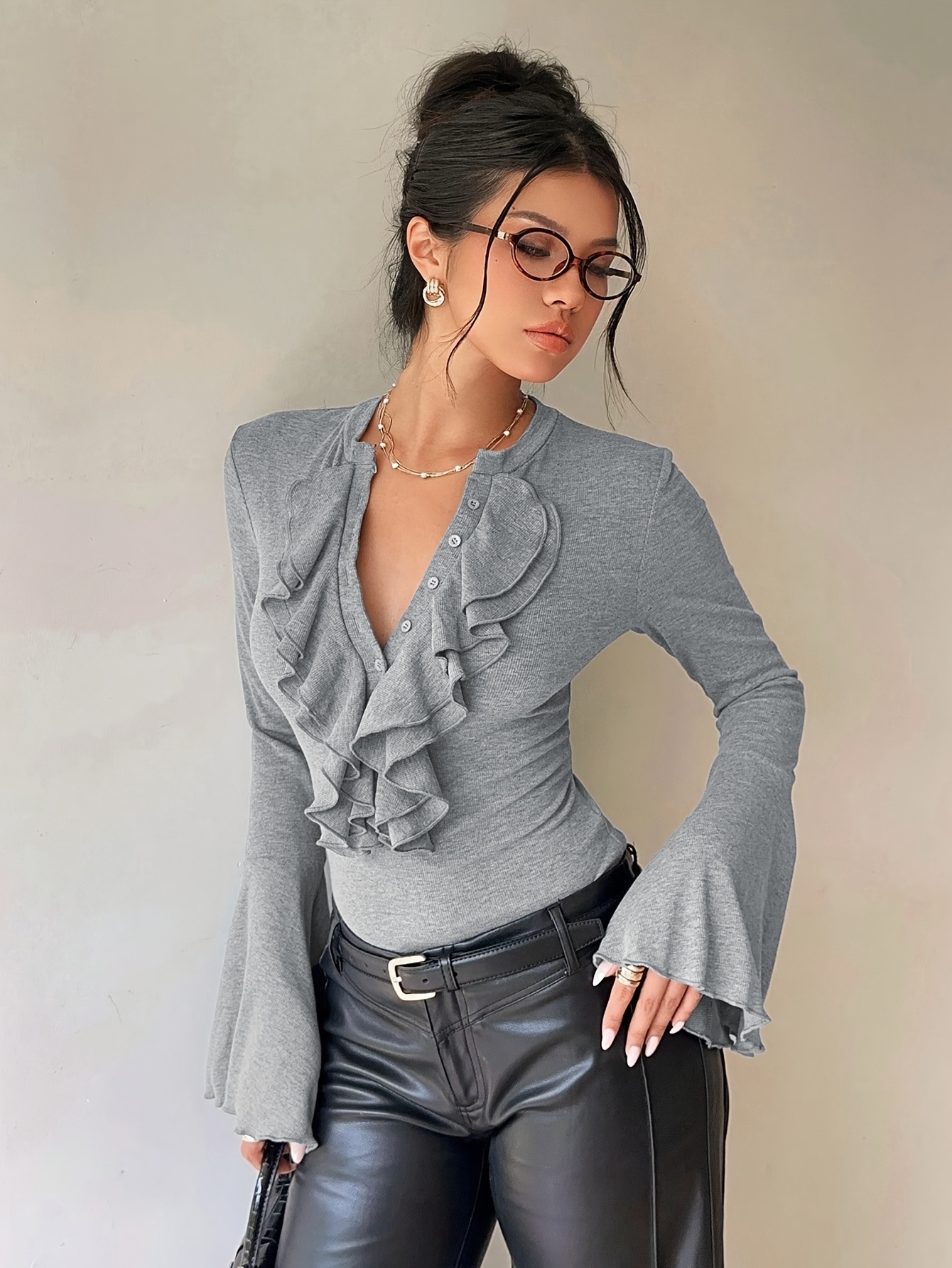16 Aprile 2026Camicia Donna Manica Lunga Slim-Fit con Scollo a Volant, Design Aperto Frontale, Maniche Svasate, Colore Unico, Elegante e Casual, Essenziale per Appuntamenti e Pendolarismo