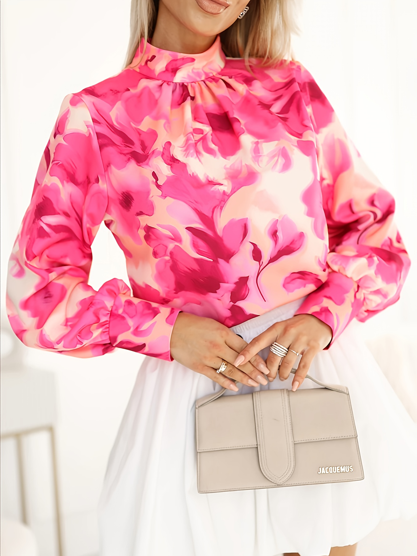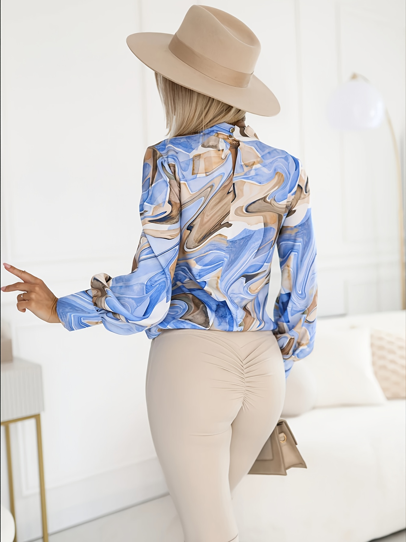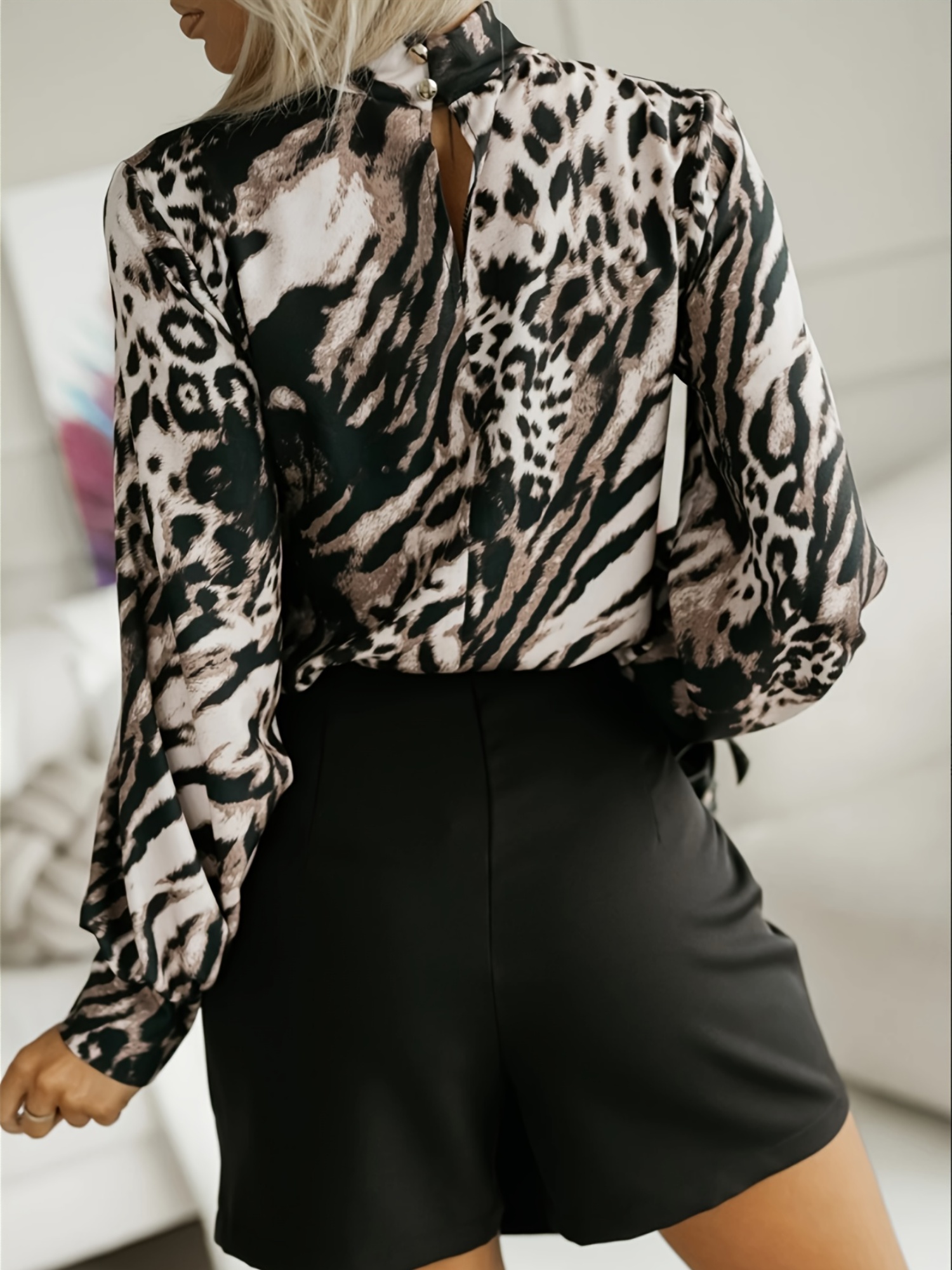16 Aprile 2026Camicia elegante a maniche lunghe con collo alto e stampa animalier, caratterizzata da un scollo arricciato e un design pullover alla moda