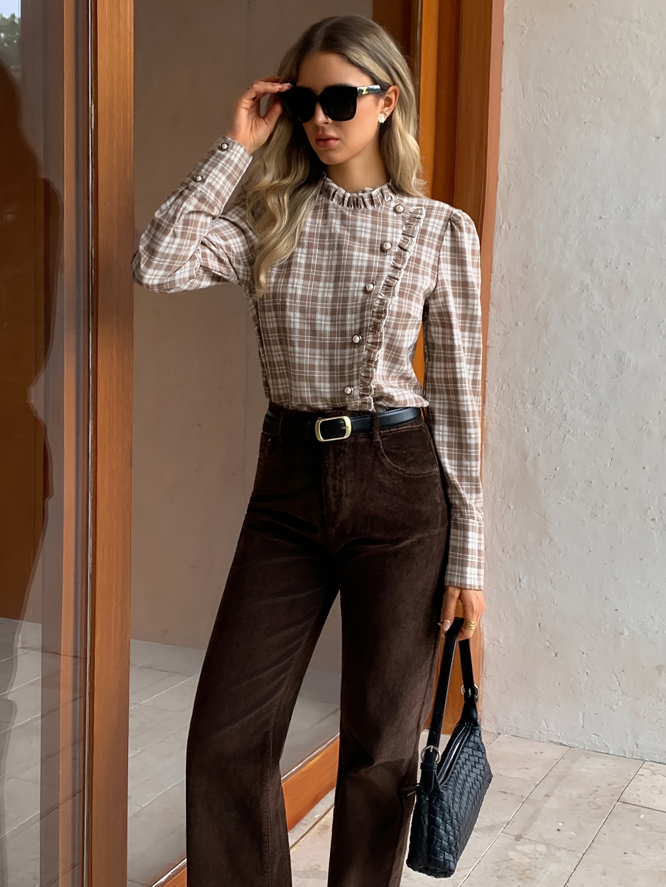 26 Gennaio 2026Camicia elegante a maniche lunghe in velluto di seta a quadri per donna | Stile vintage, marrone, girocollo, dettagli con bottoni, adatta per il Ringraziamento e Capodanno
