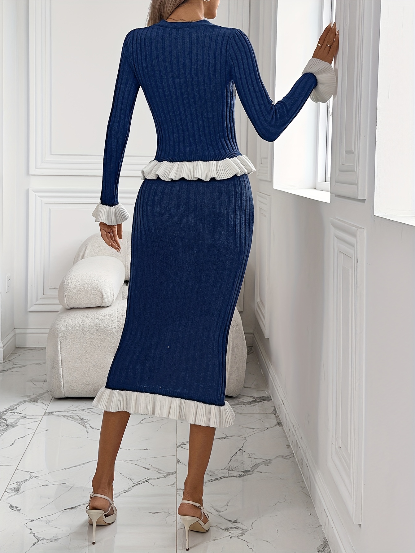 22 Febbraio 2026Cardigan a scollo a V con bordi arricciati e gonna tubino aderente, completo da donna