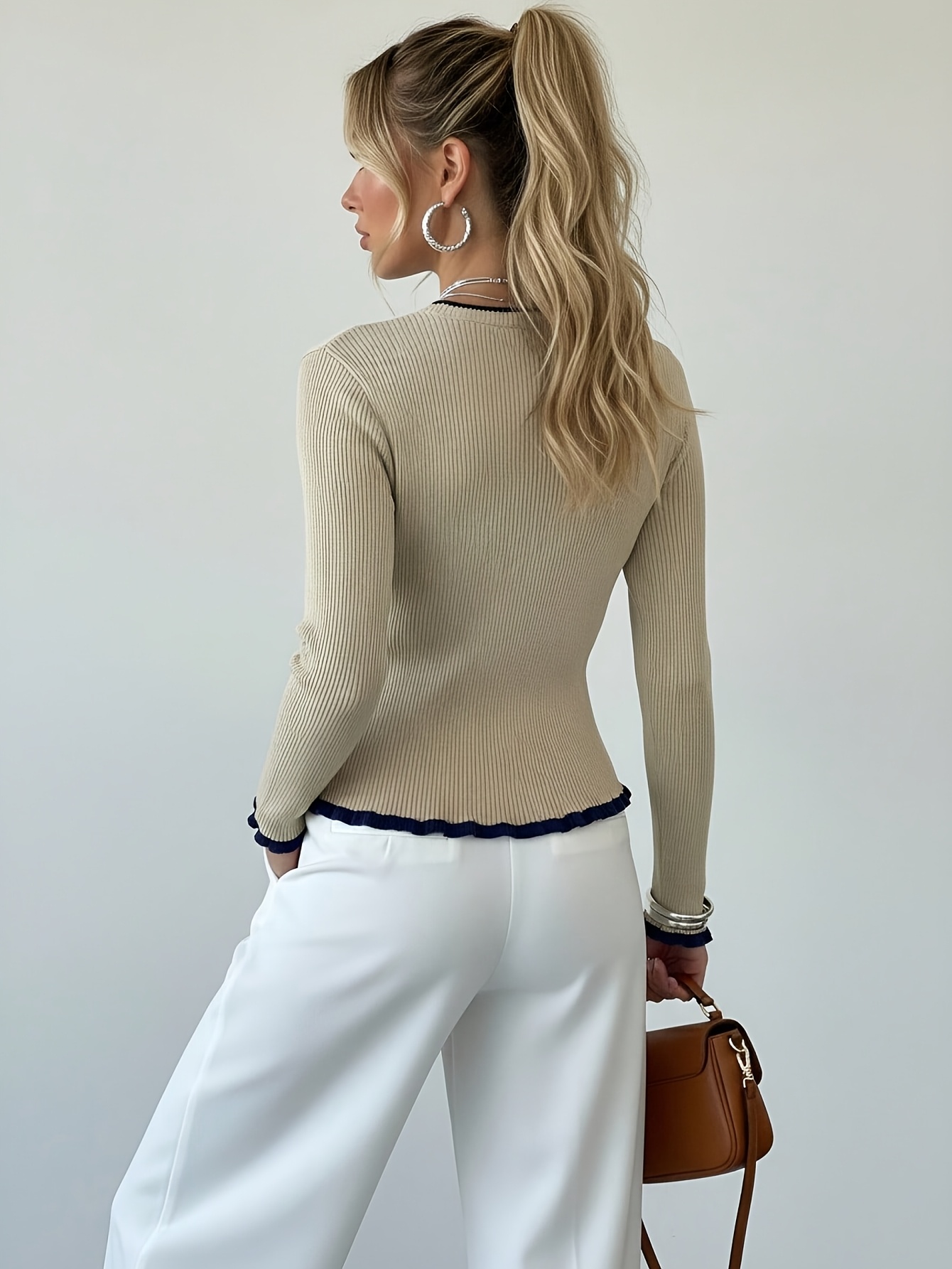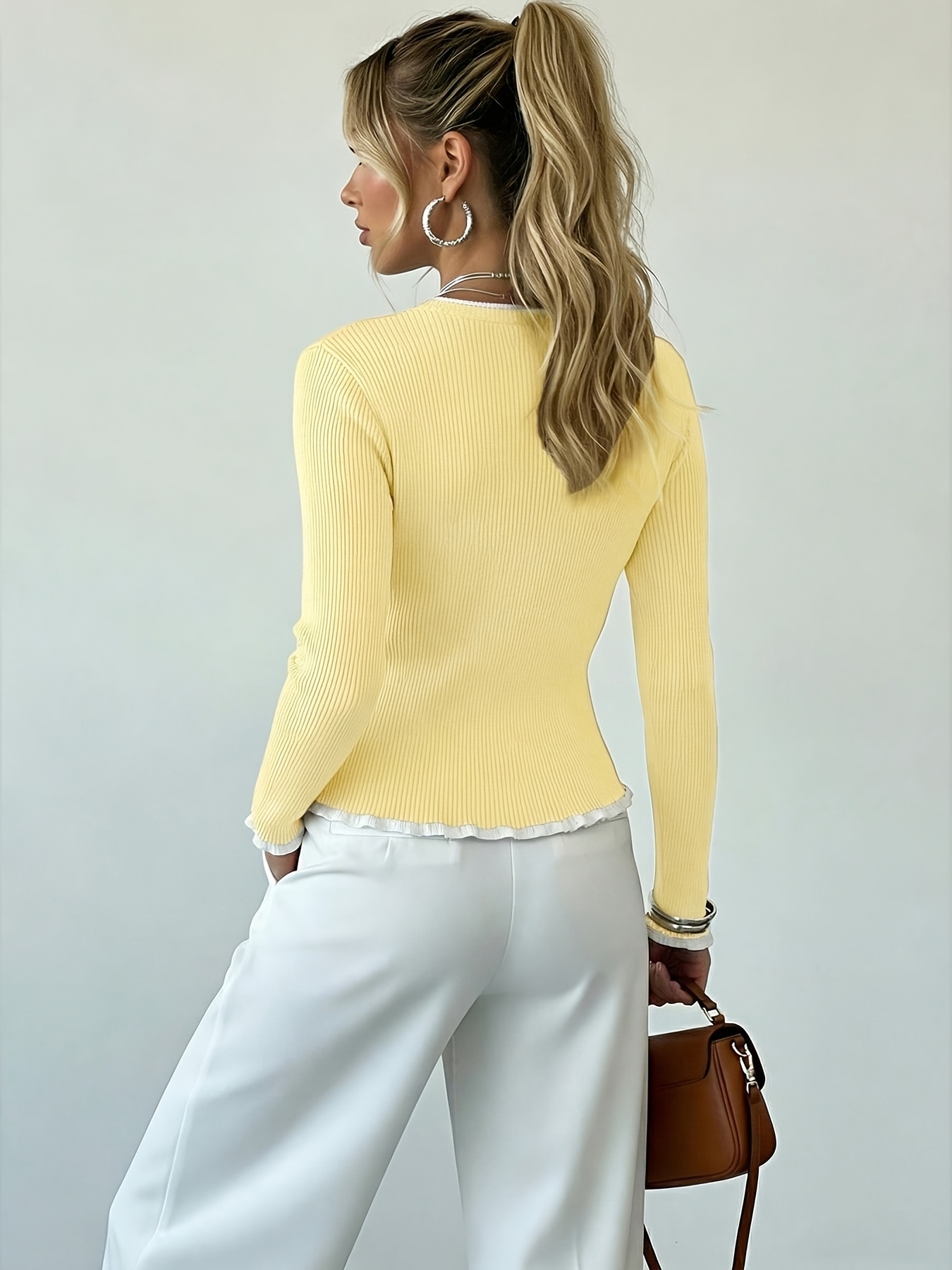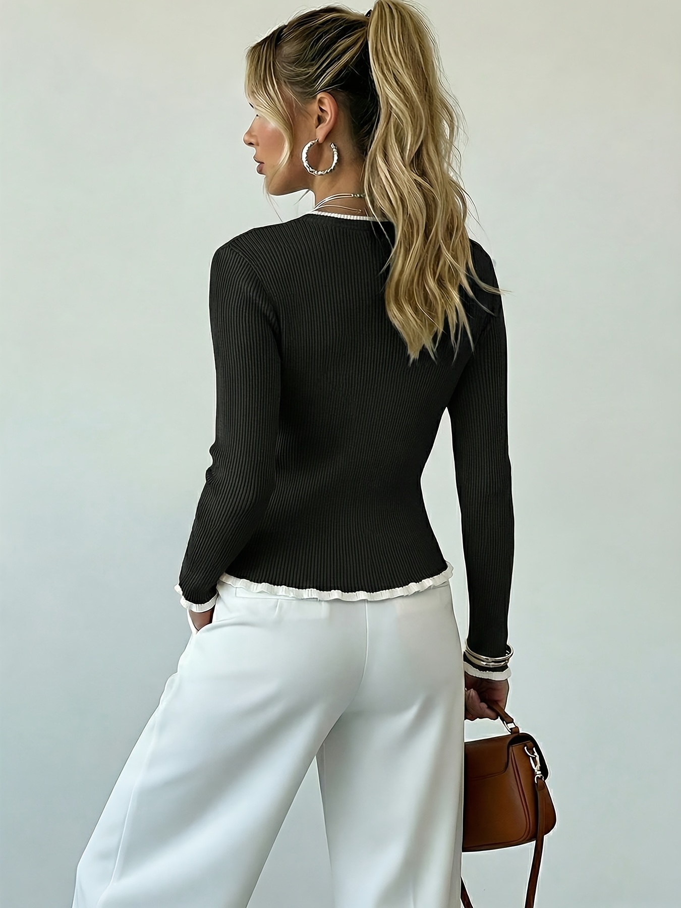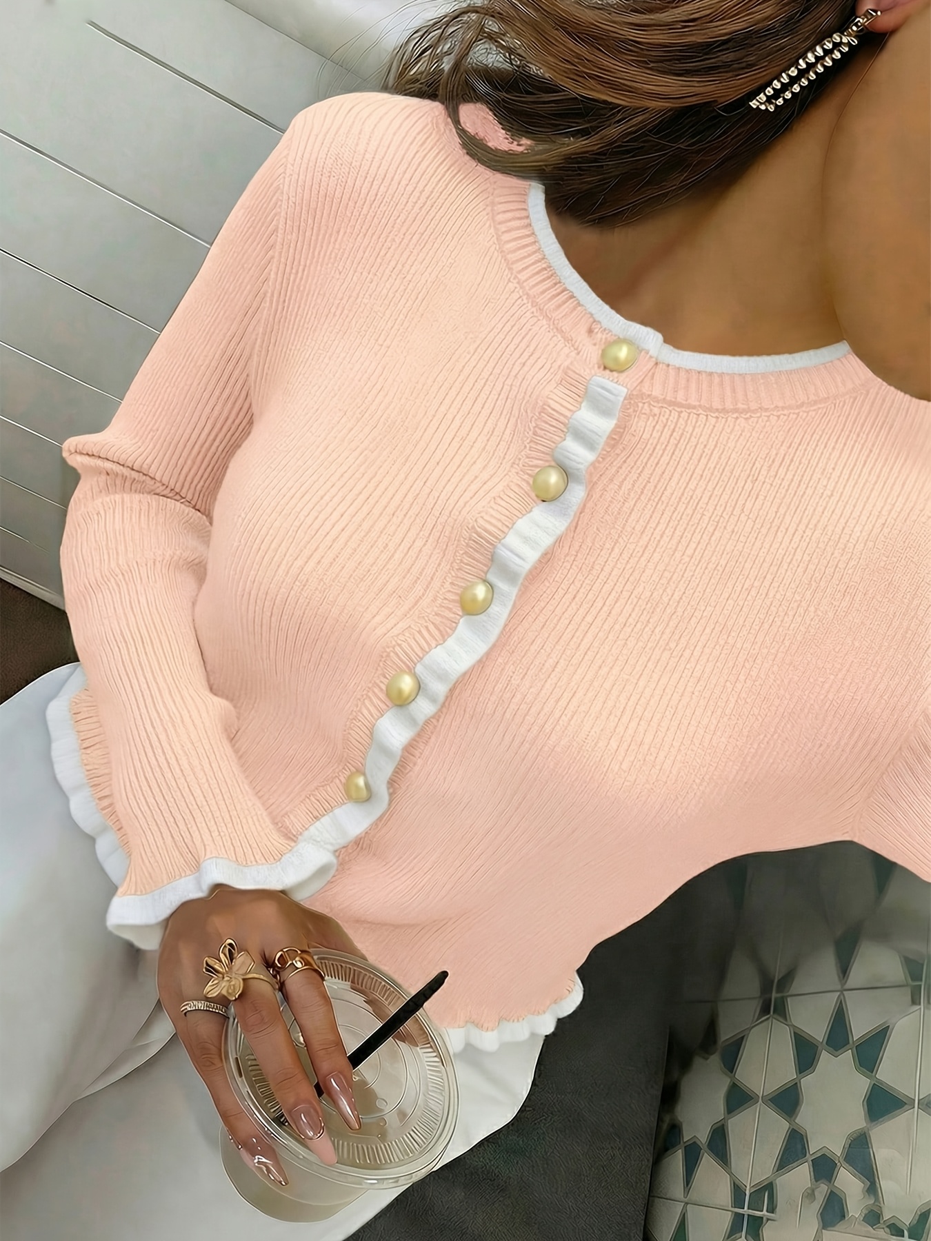 21 Febbraio 2026Cardigan da donna a maniche lunghe con colletto rotondo e abbottonatura singola | Bordo a balze a contrasto e design con bottoni che aggiungono eleganza, perfetto per l’uso quotidiano o per uscite