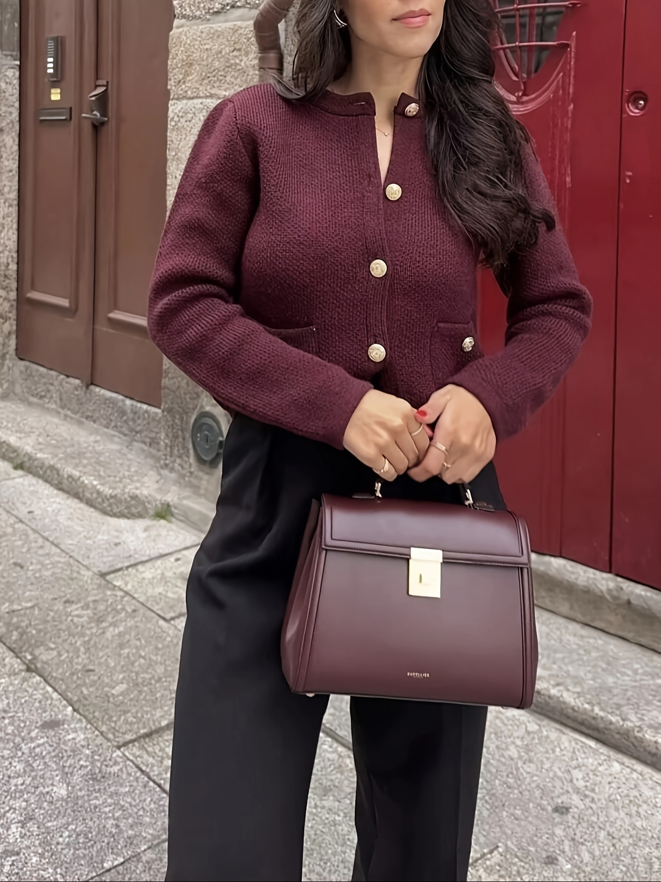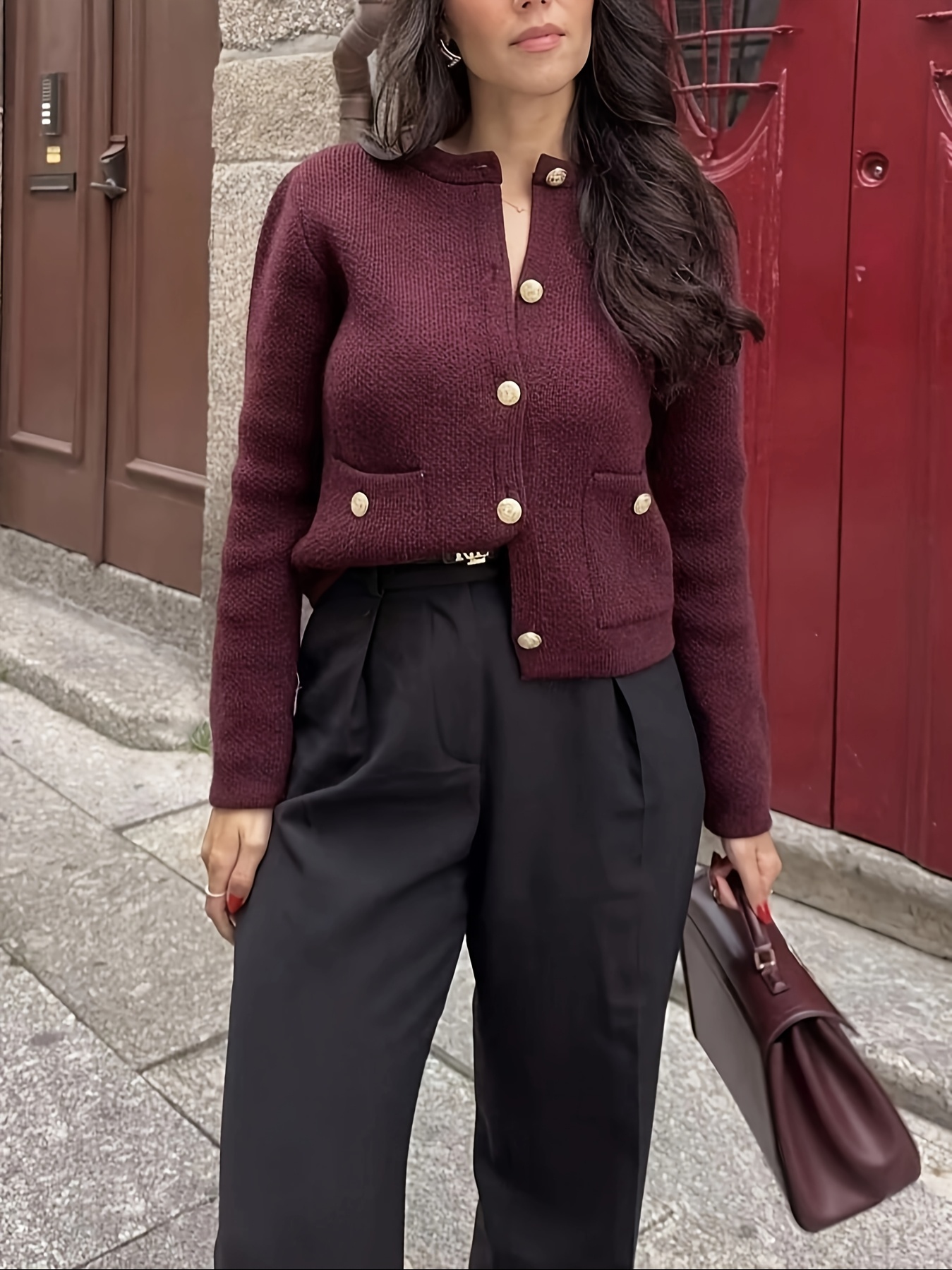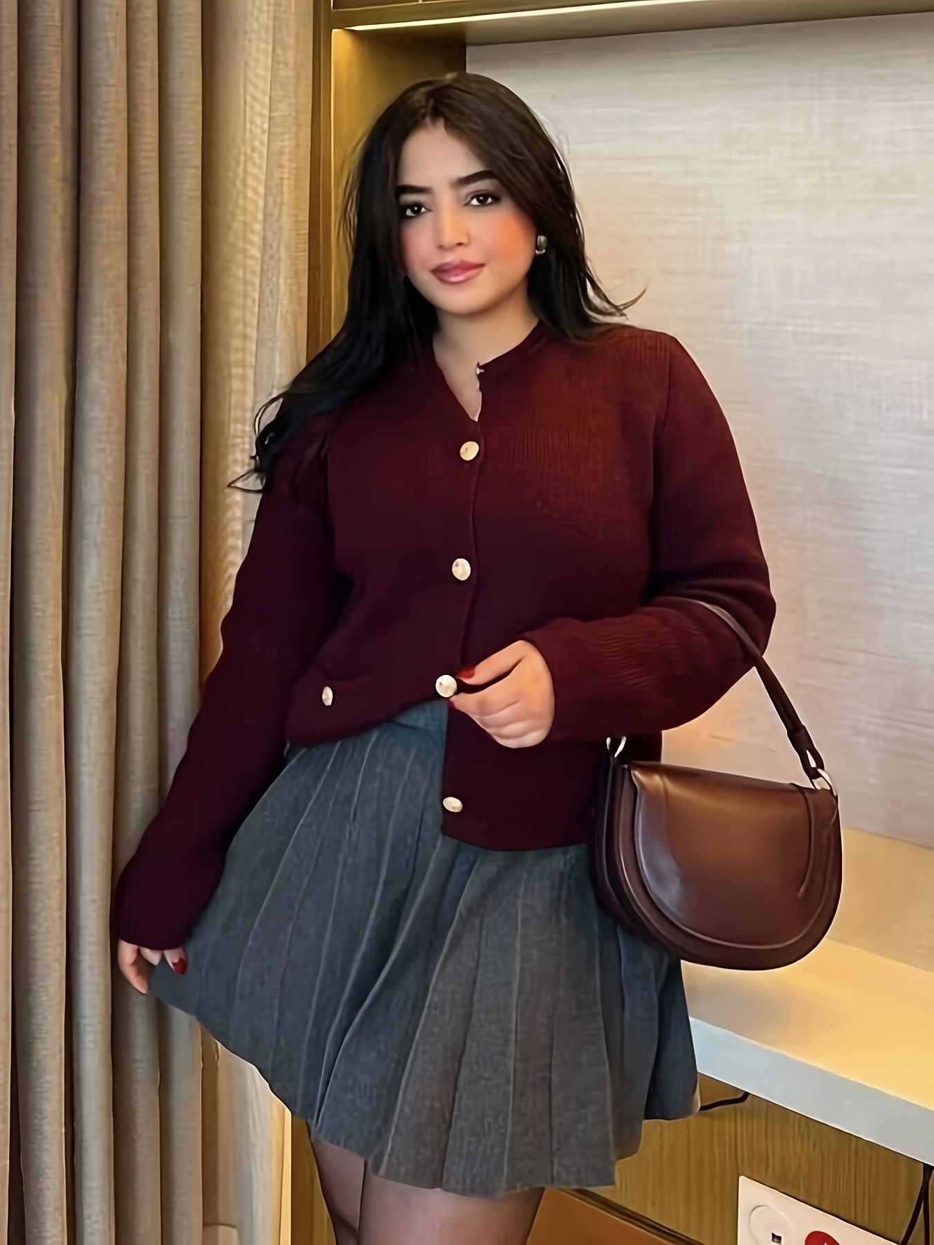 21 Febbraio 2026Cardigan Elegante Donna ZD0415104, Manica Lunga, Scollo Tondo, Colore Borgogna, Tinta Unita, Ideale per Stratificazione Primavera/Autunno, Tessuto Morbido, Con Bottoni, Motivo a Trama Sottile, Casual, Abbigliamento da Ufficio, Lavaggio a Mano o a Secco