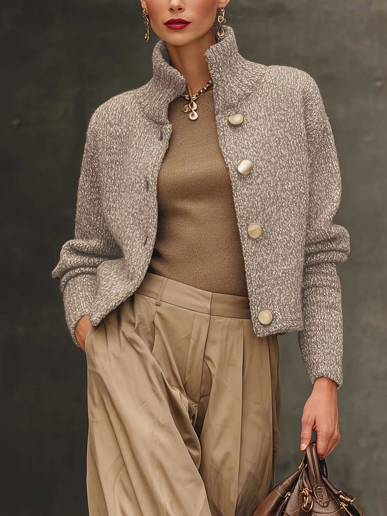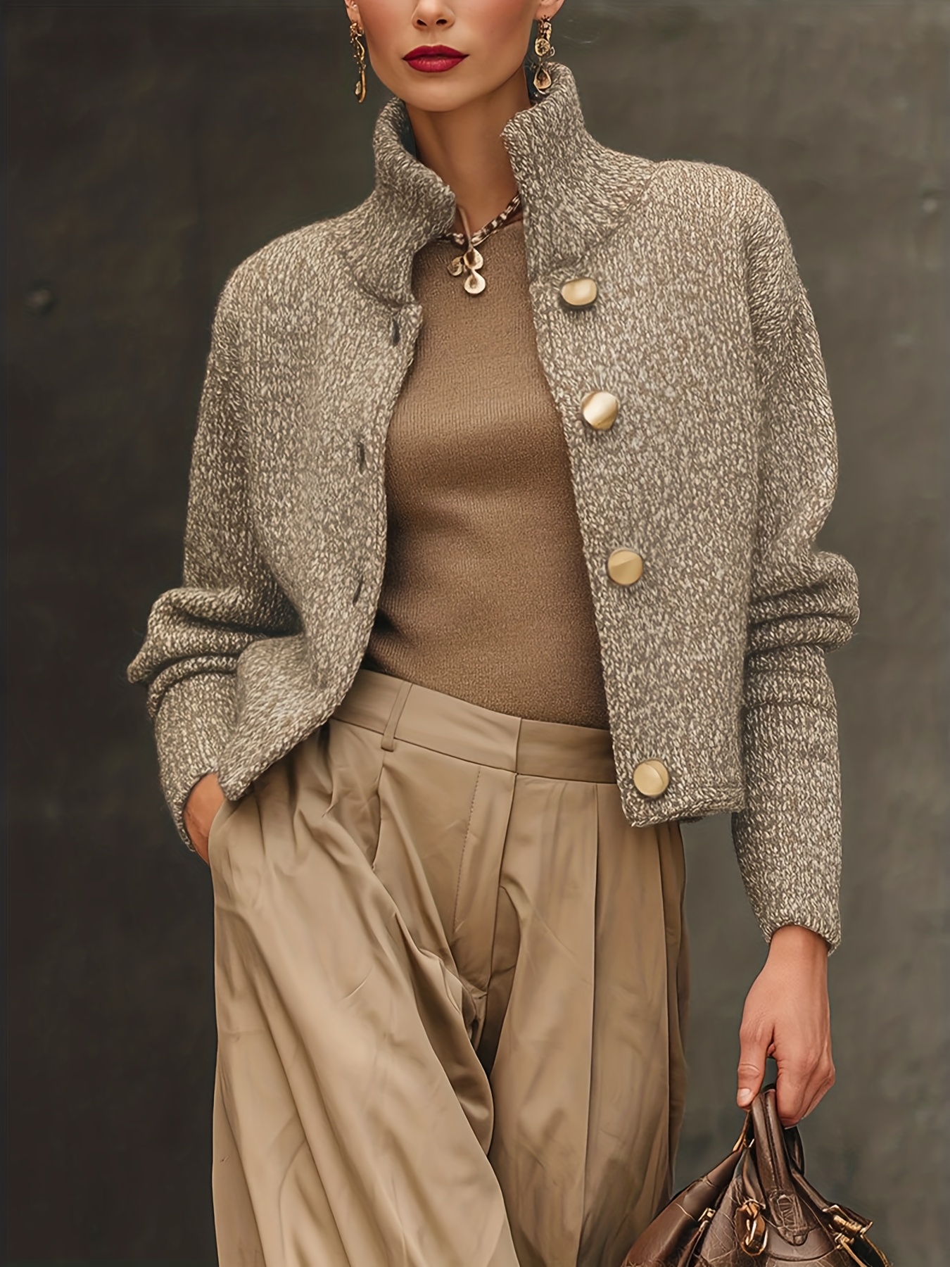 23 Febbraio 2026Giacca corta da donna con motivo vintage, colletto alla coreana e bottoni dorati, cardigan elegante e ampio alla moda autunno inverno
