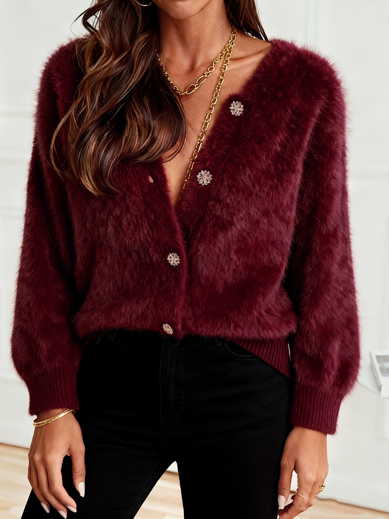 21 Febbraio 2026Nuova collezione autunno-inverno di Cardigan unici da donna, con un design a collo rotondo color vin rosso. Questo capispalla casual ma elegante è perfetto per l’autunno e l’inverno.