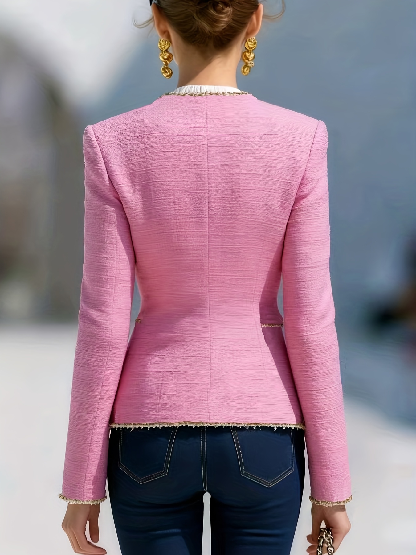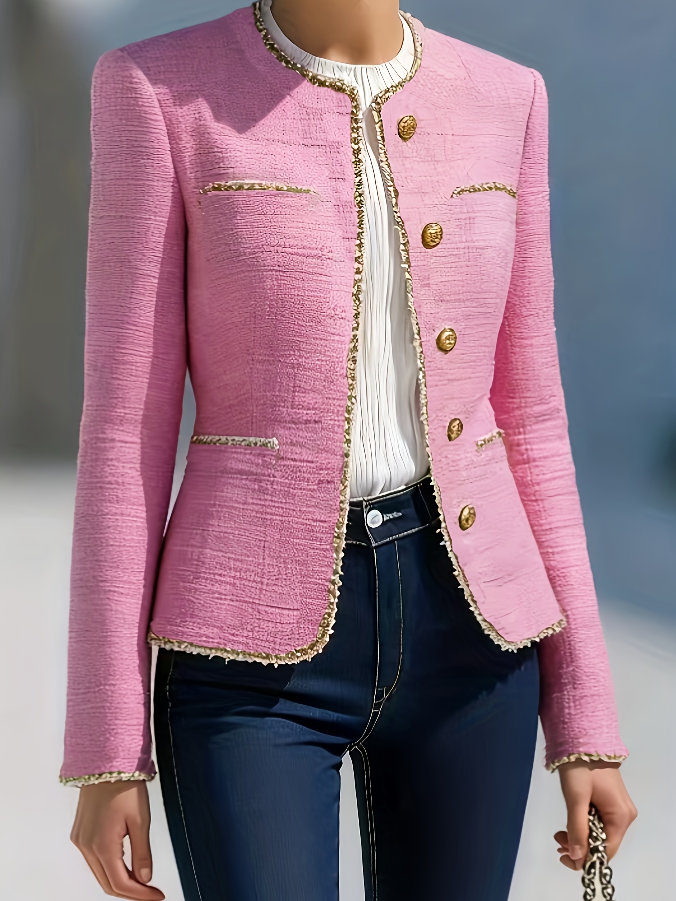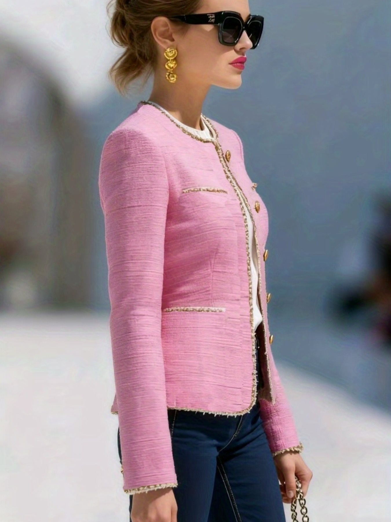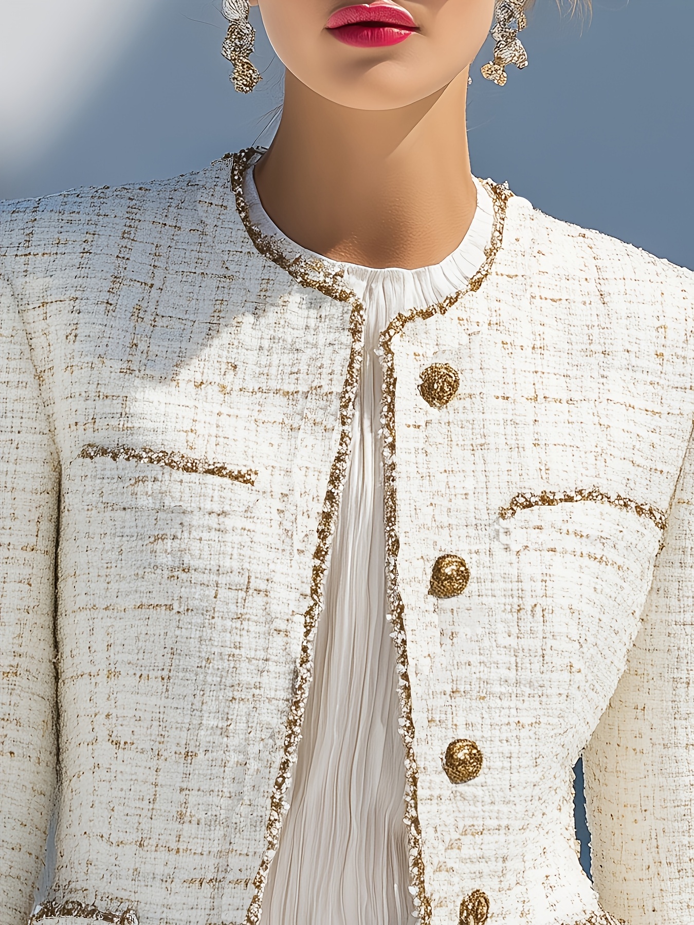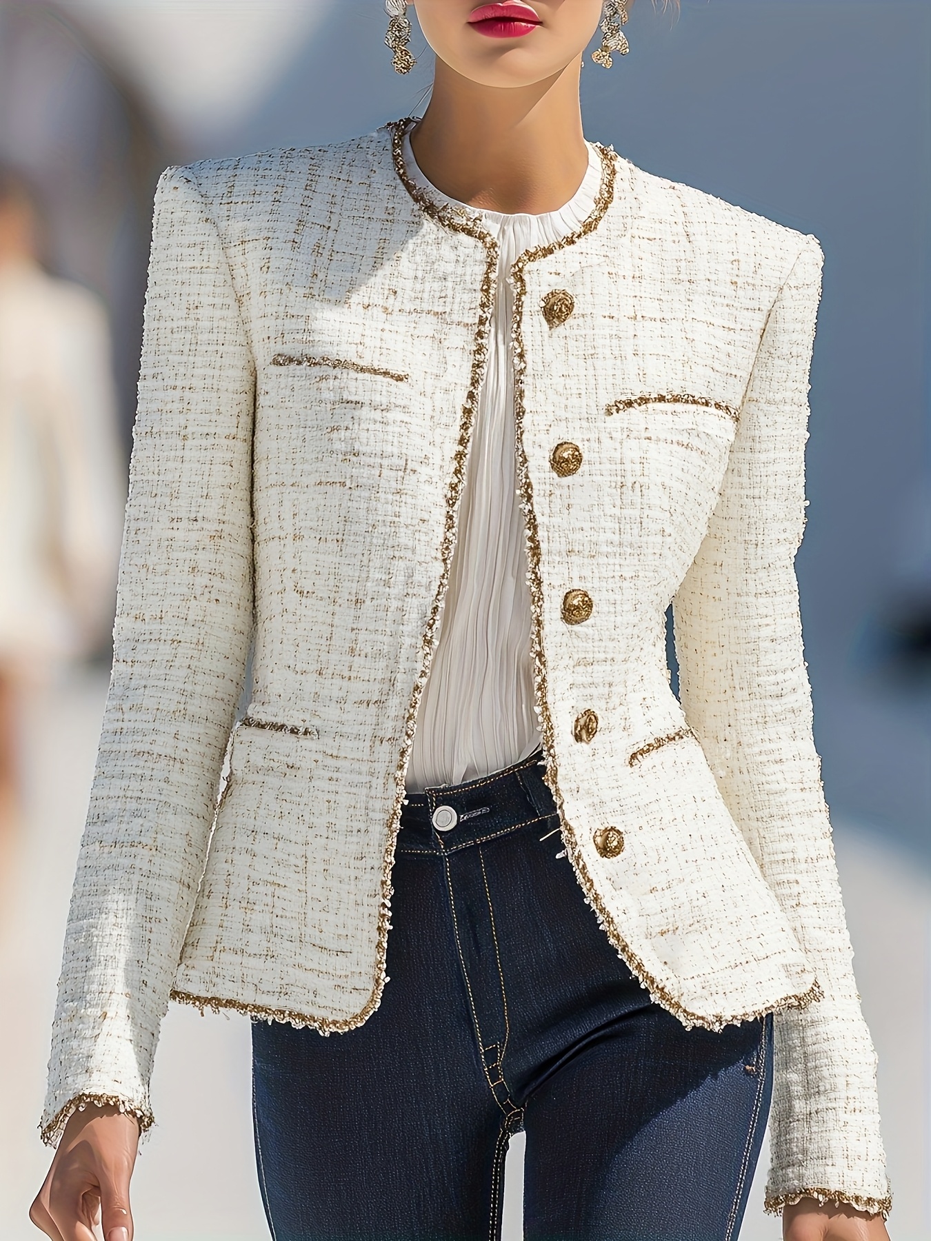 26 Gennaio 2026Giacca Elegante Classico in Tweed con Bottoni Dorati e Finitura Cristallo Bianco