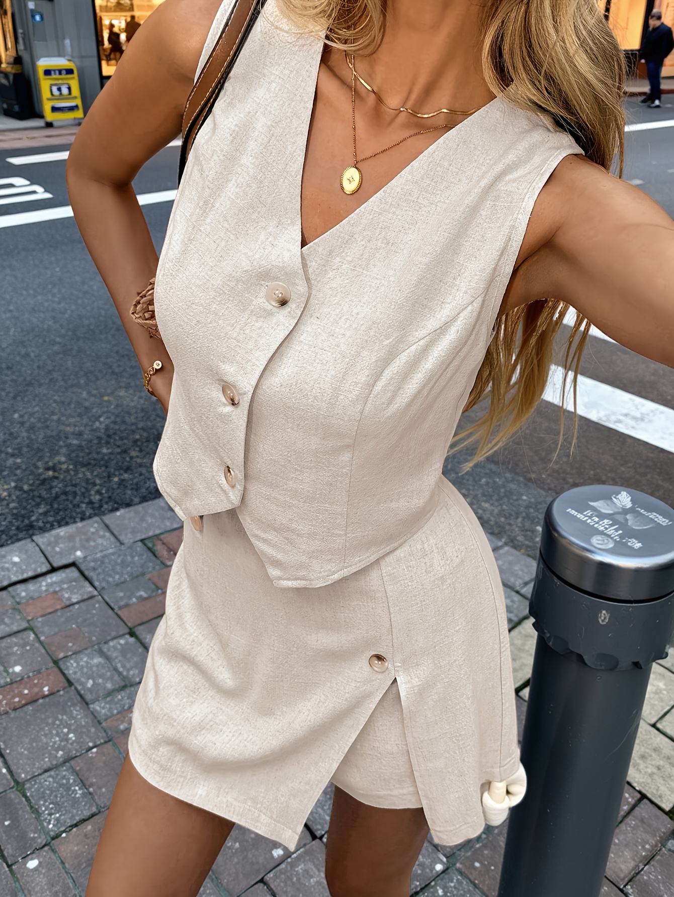 2 Marzo 2026Gonna Completo da donna senza maniche in stile vestito, ideale per la primavera e l’estate, caratterizzato da una texture in lino bianco, una design stringitutto in vita e una gonna divisa. Perfetto per il pendolarismo, gli appuntamenti e come strato versatile.
