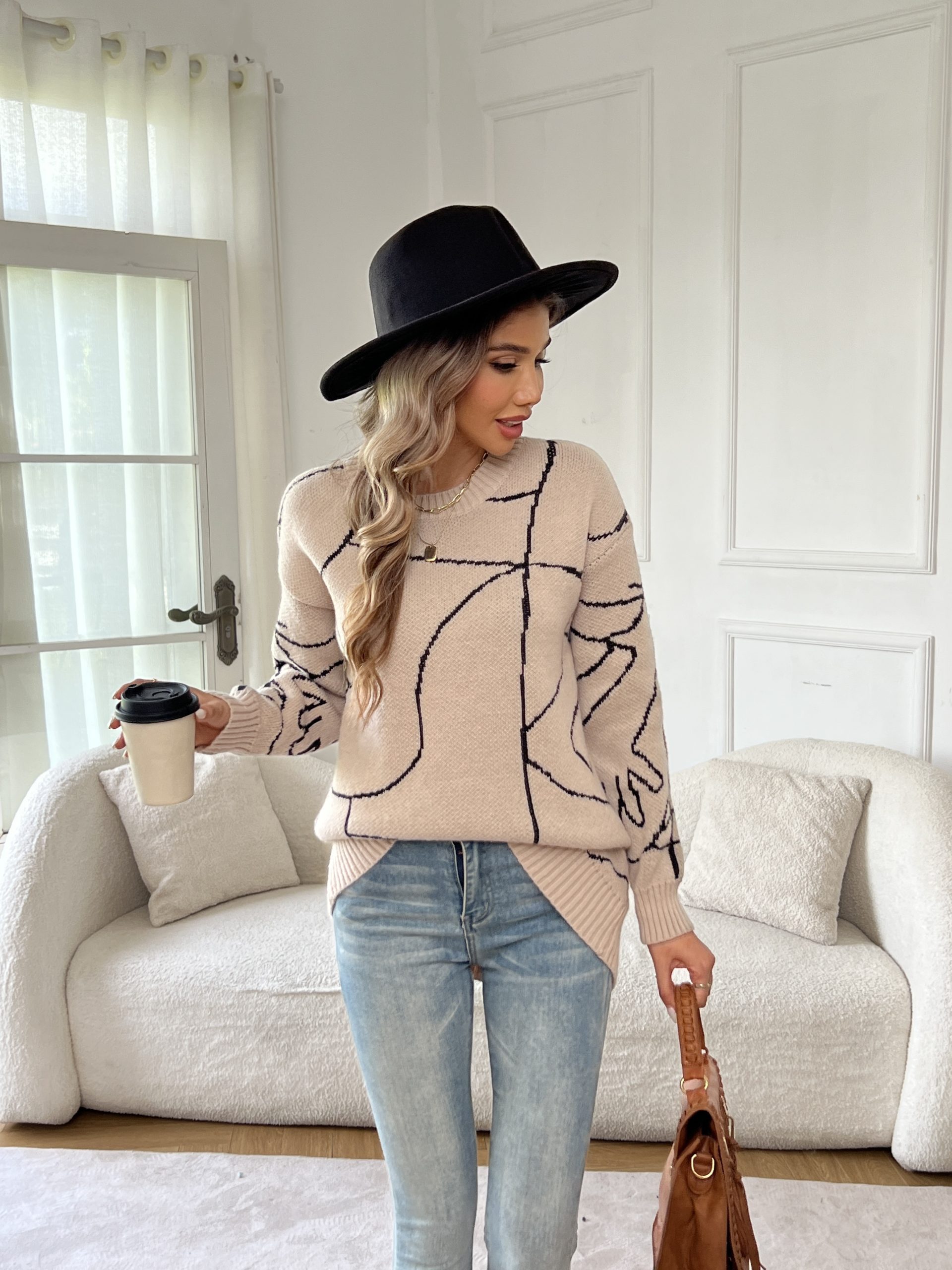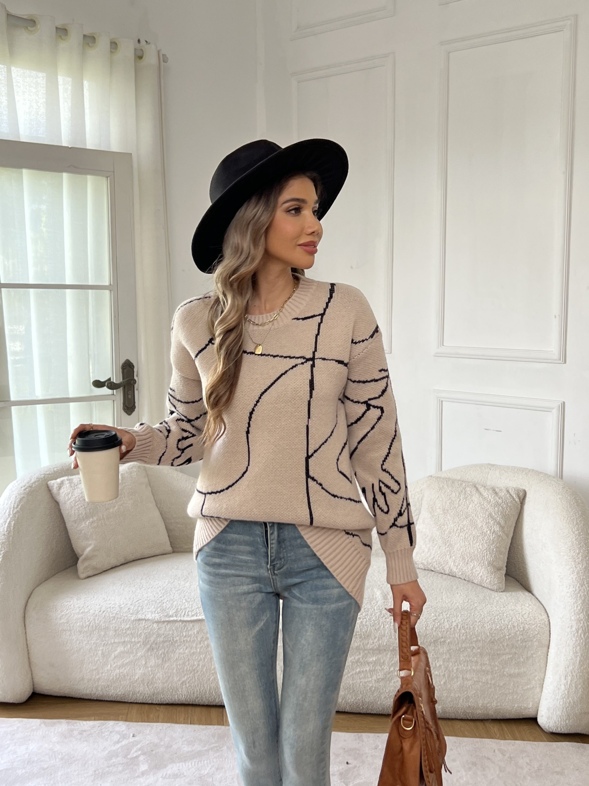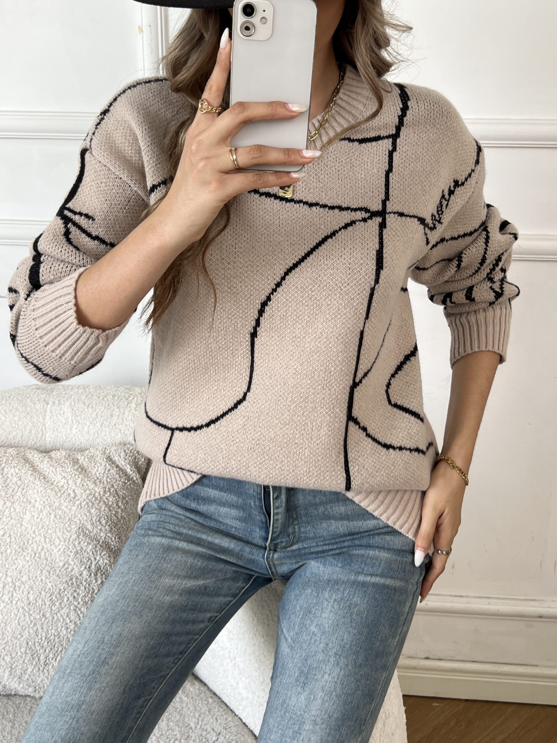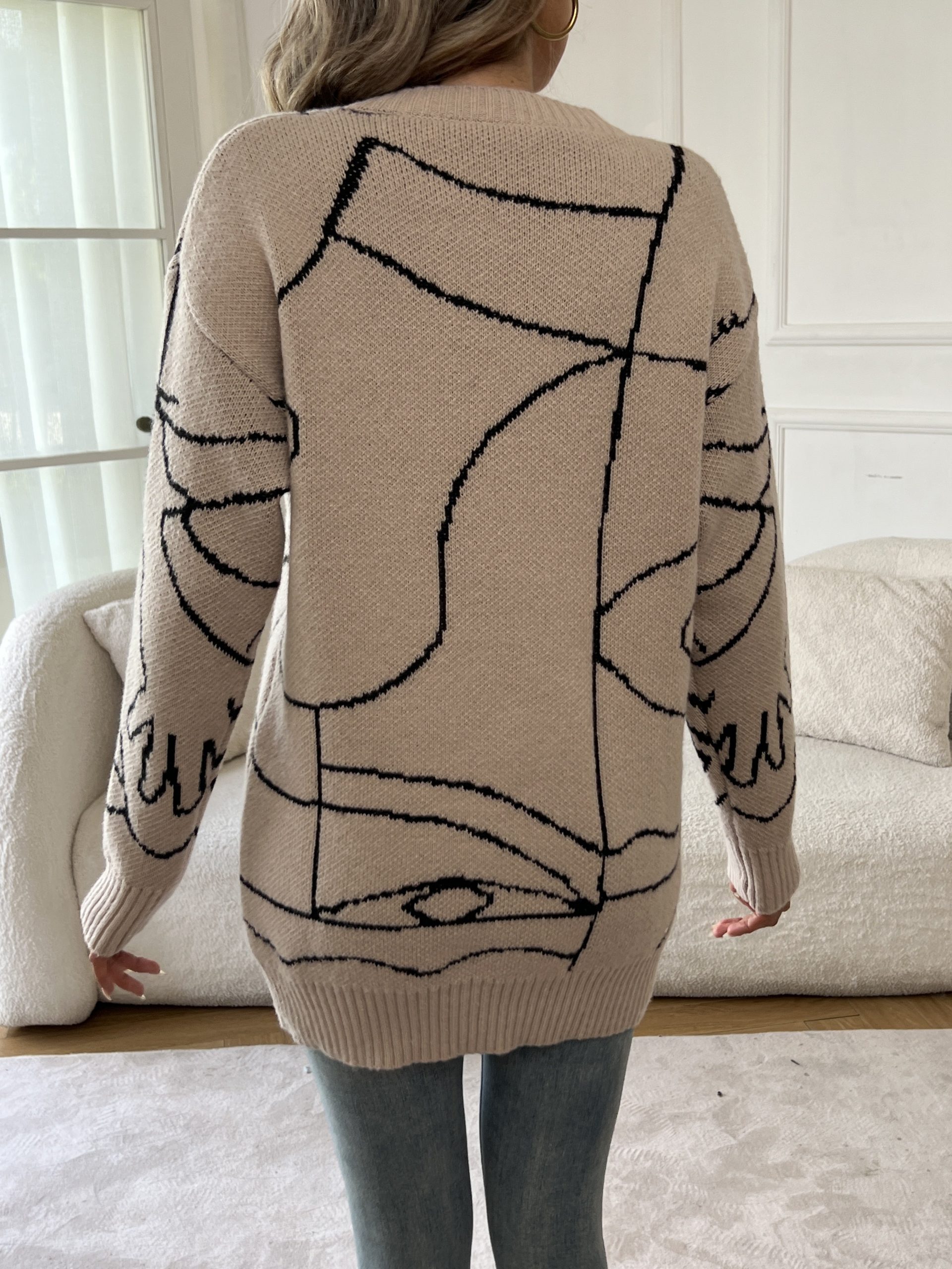 18 Gennaio 2026Maglia a Crew Neck con Motivo Abstract, Maglia Casual con Maniche Lunghe e Shoulder Drop, per Autunno e Inverno, Abbigliamento da Donna