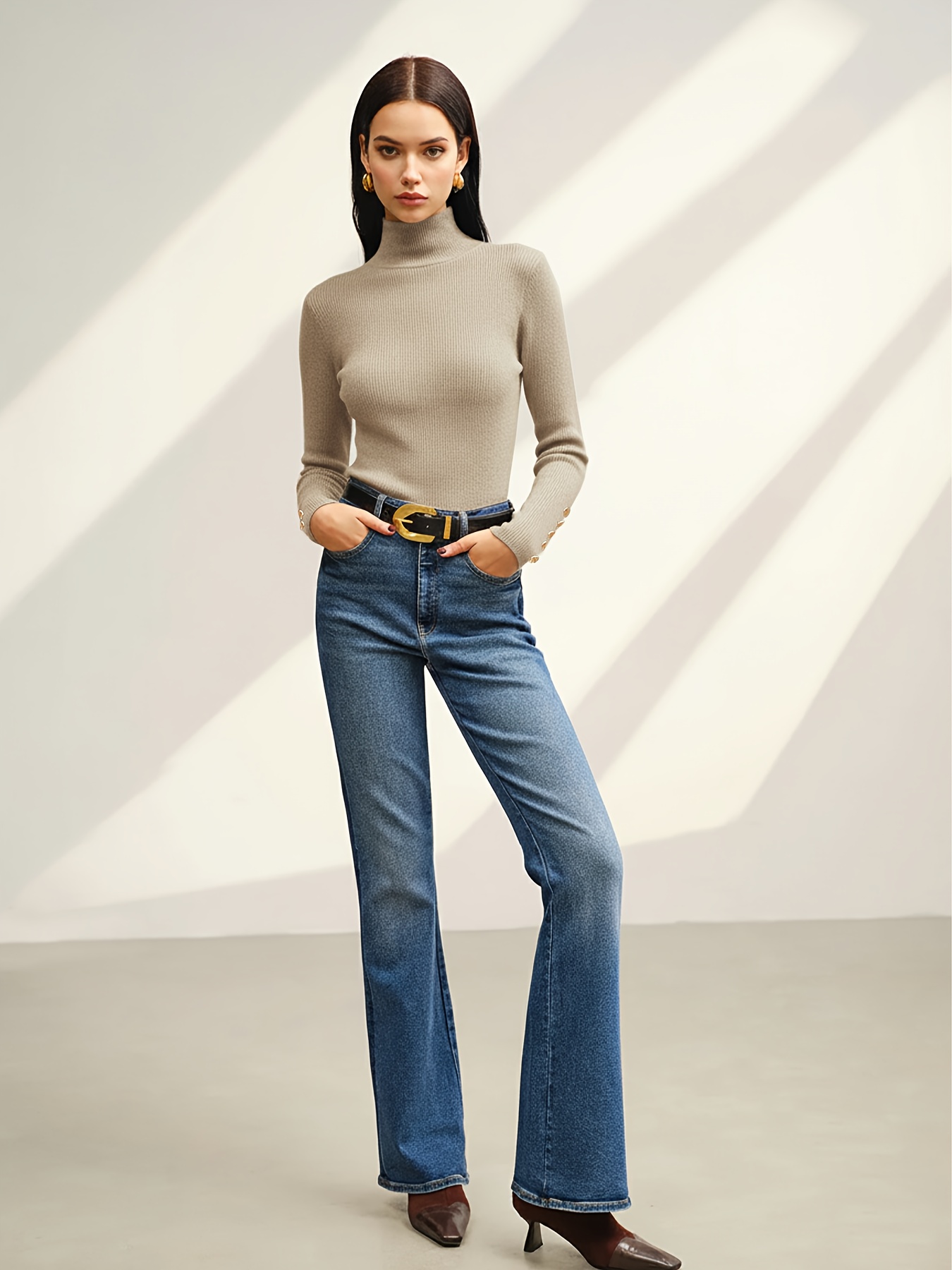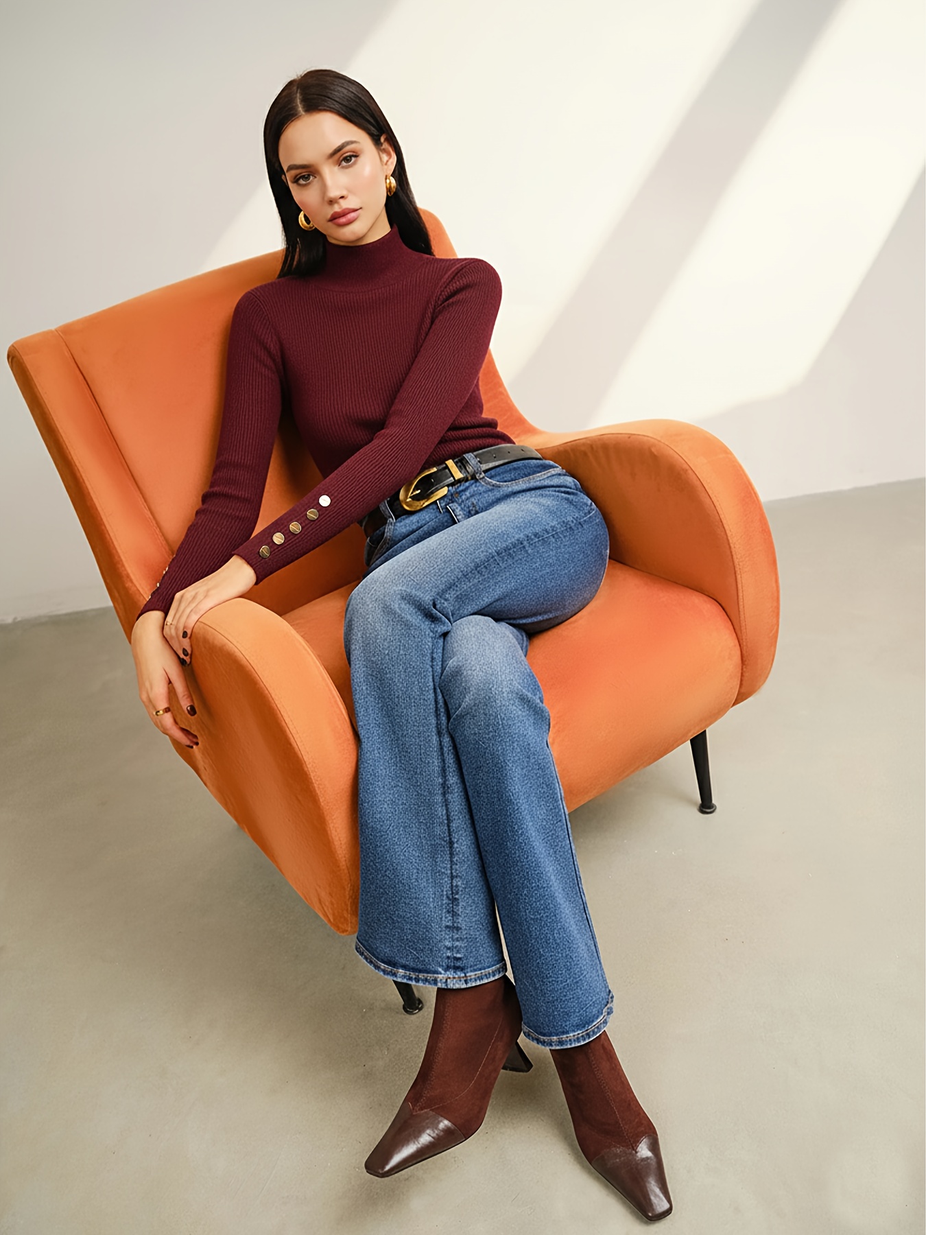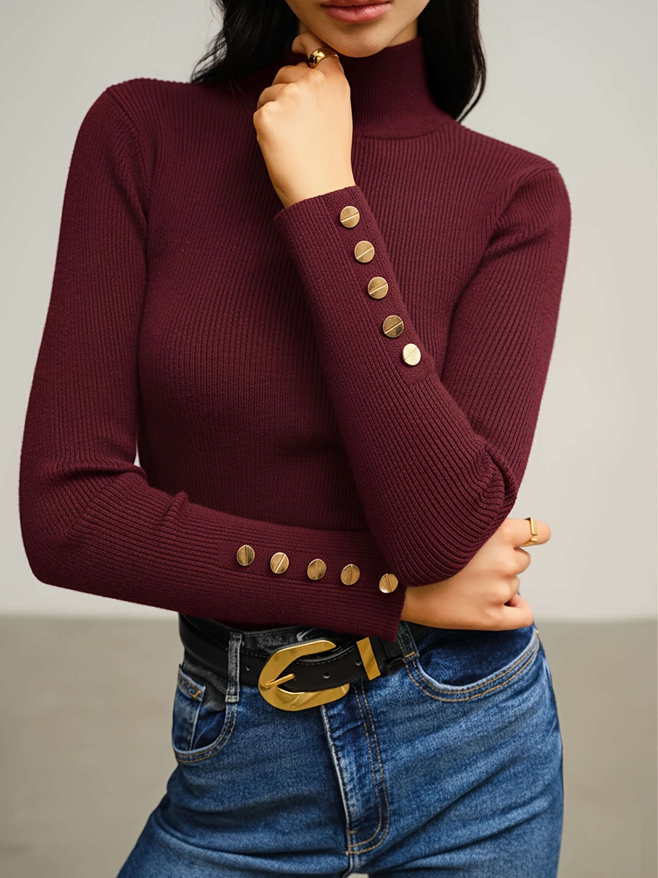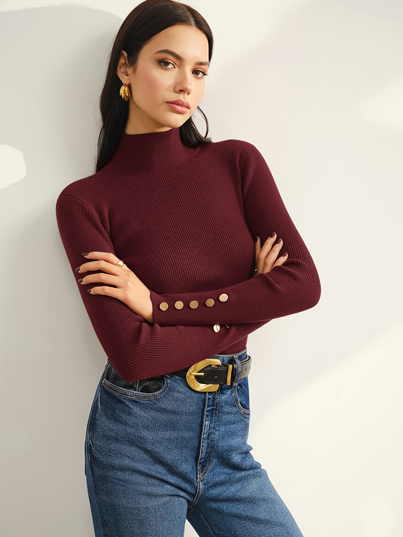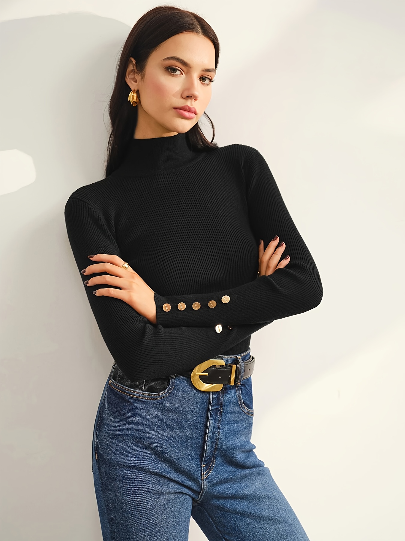 21 Febbraio 2026Maglia da donna autunno/inverno con colletto alto, top slim fit con eleganti bottoni decorativi, per un look sofisticato