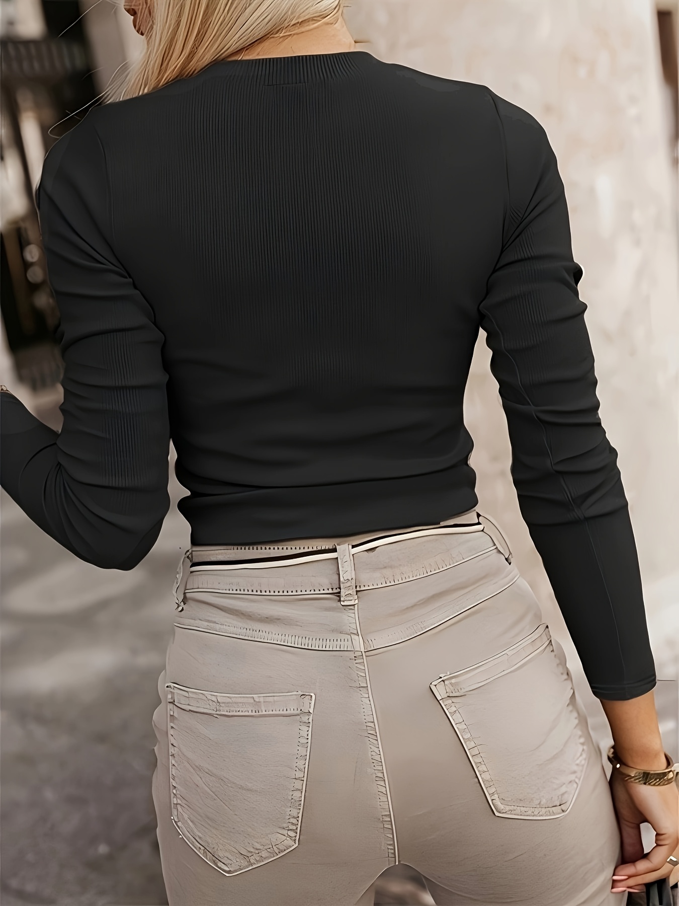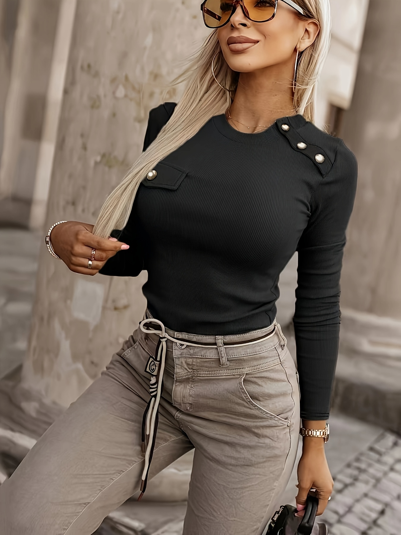 20 Febbraio 2026Maglia Nuovo Top Autunnale da Donna Nero con Scollo Rotondo, Decorazione con Bottoni in Metallo Bronzo e Texture a Righe Verticali, Maglia a Maniche Lunghe Aderente da Indossare Sopra o da Solo per il Lavoro