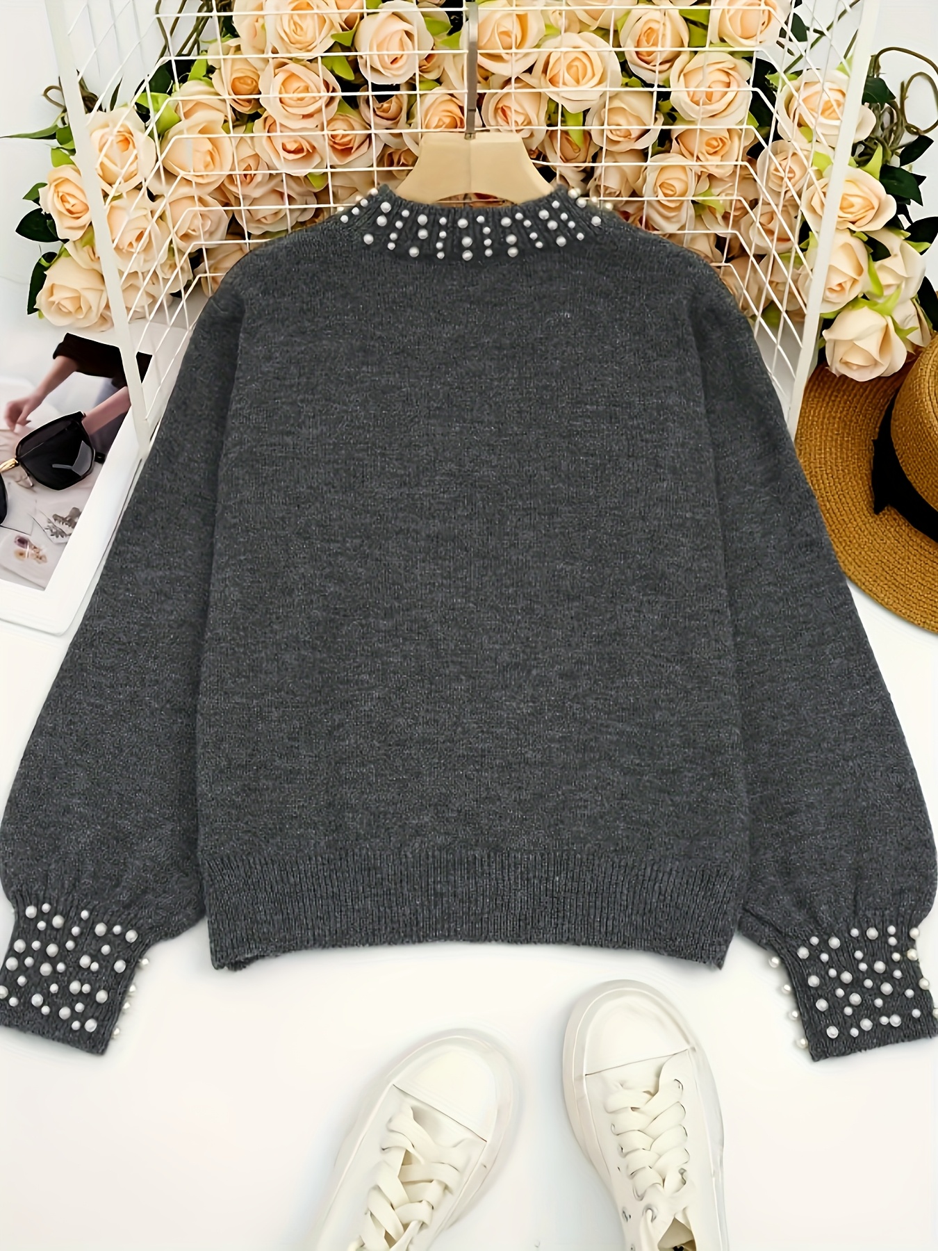 Maglione pullover da donna a tinta unita con decorazioni di perle, perfetto per l’abbigliamento autunnale e invernale.