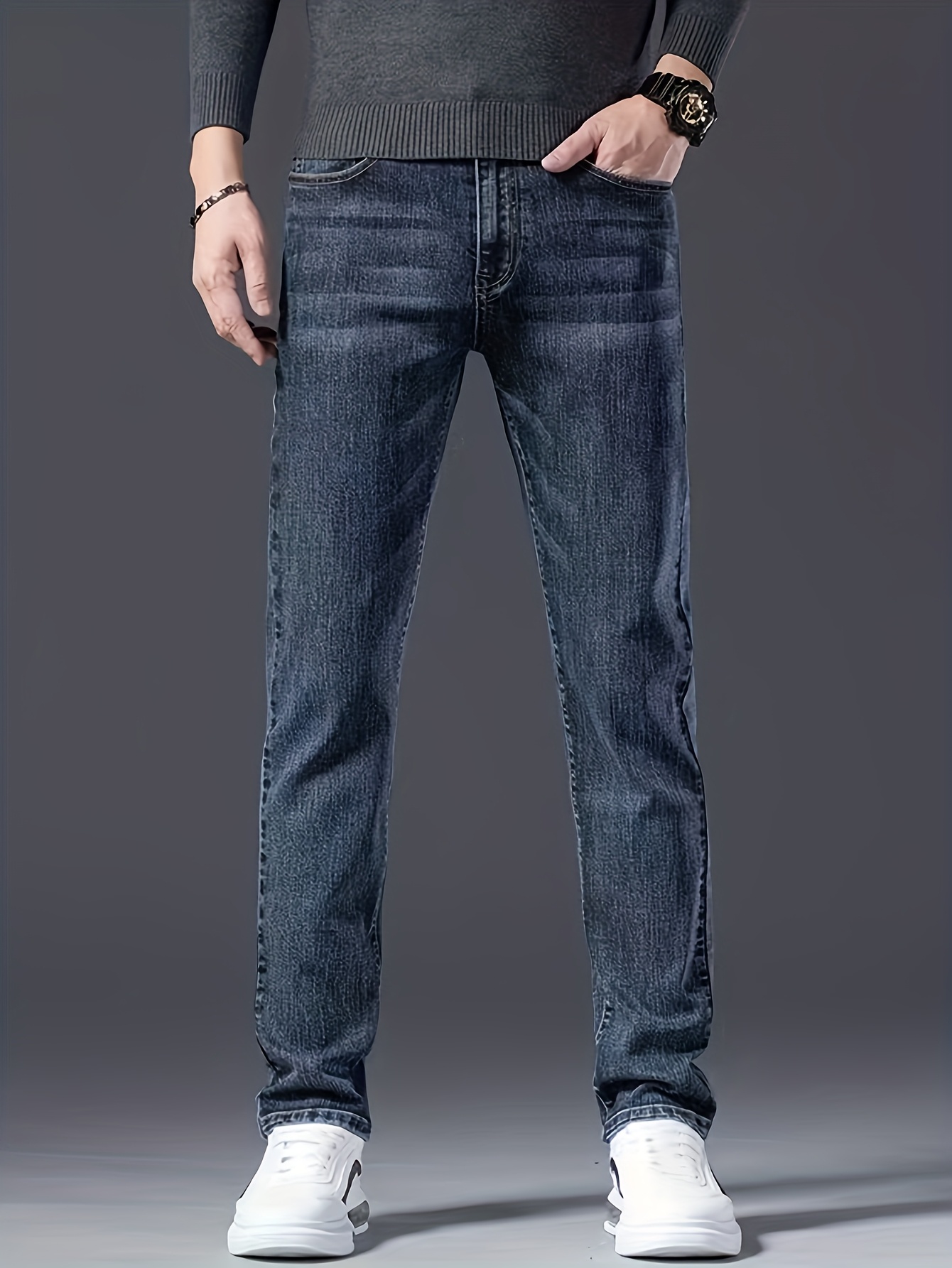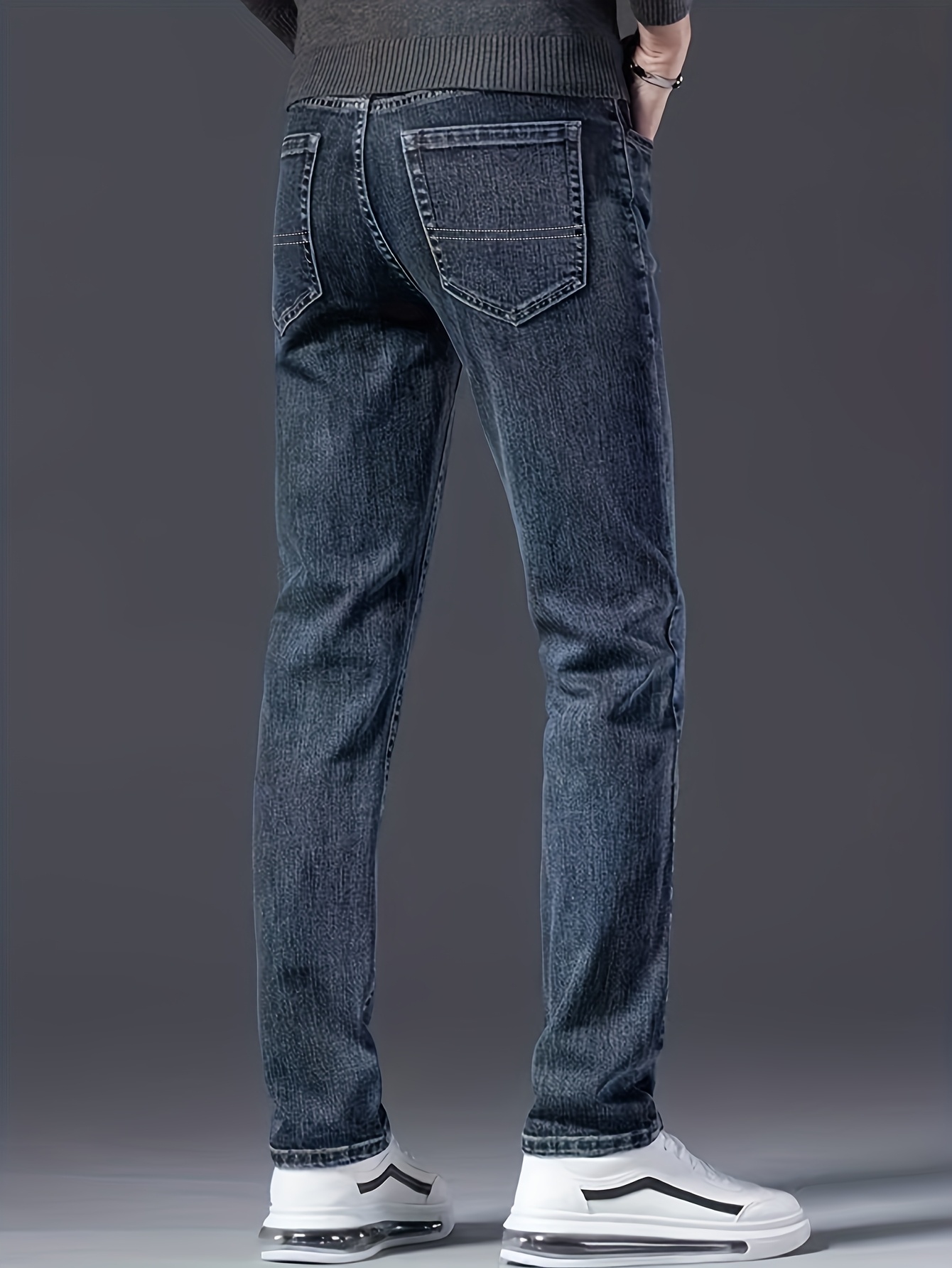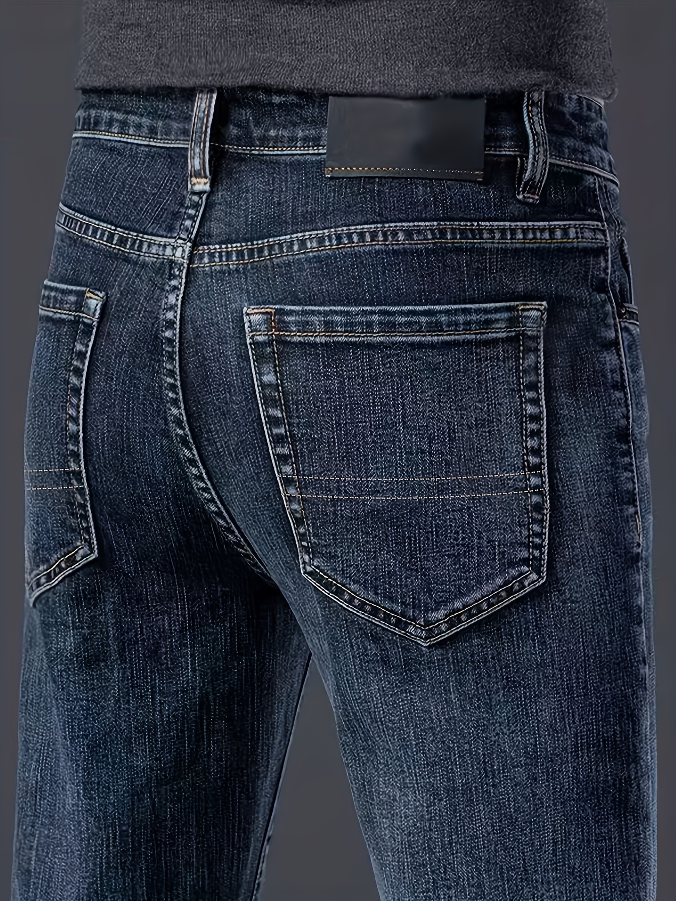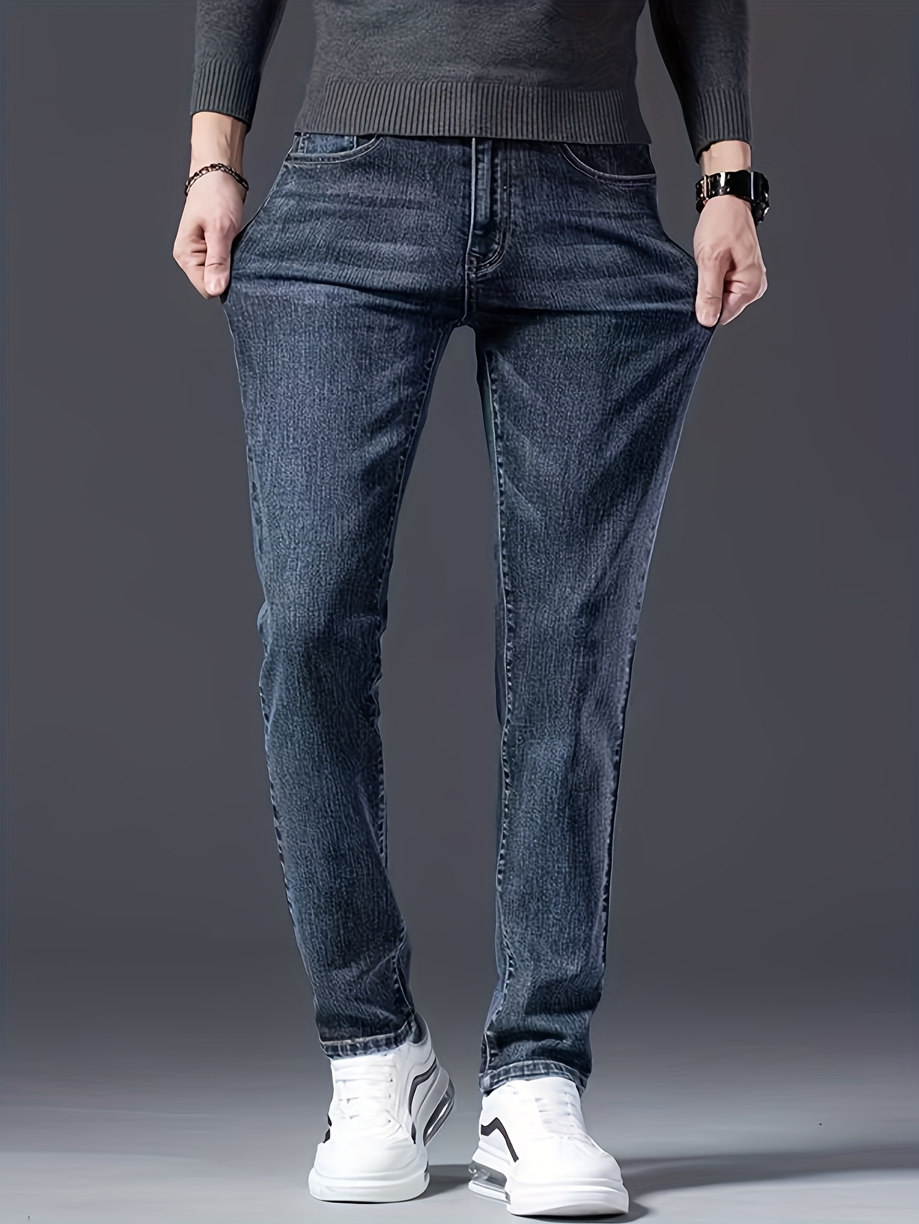 28 Gennaio 2026Pantalone Jeans da uomo slim-fit elasticizzati in denim blu scuro, adatti a tutte le stagioni