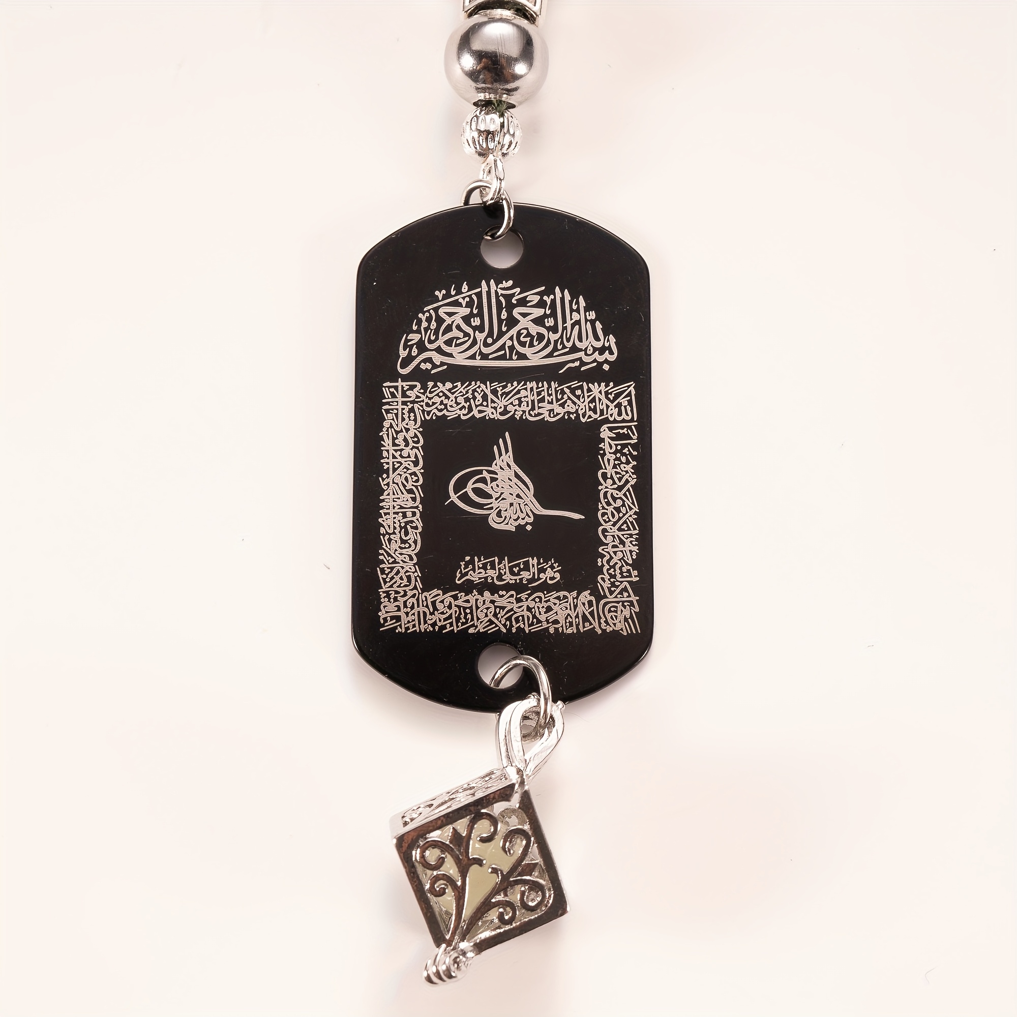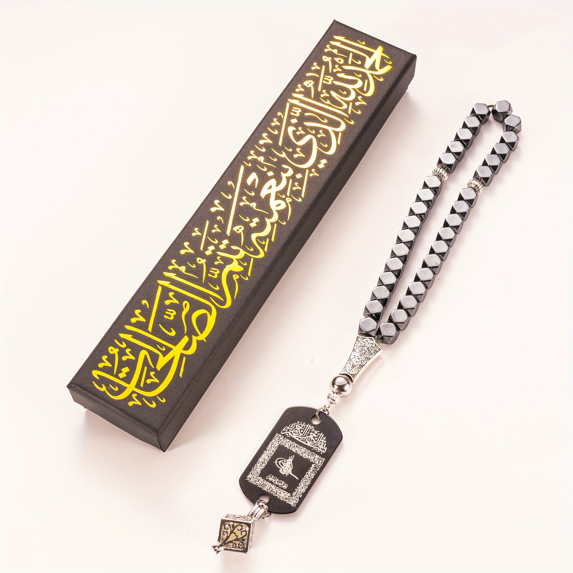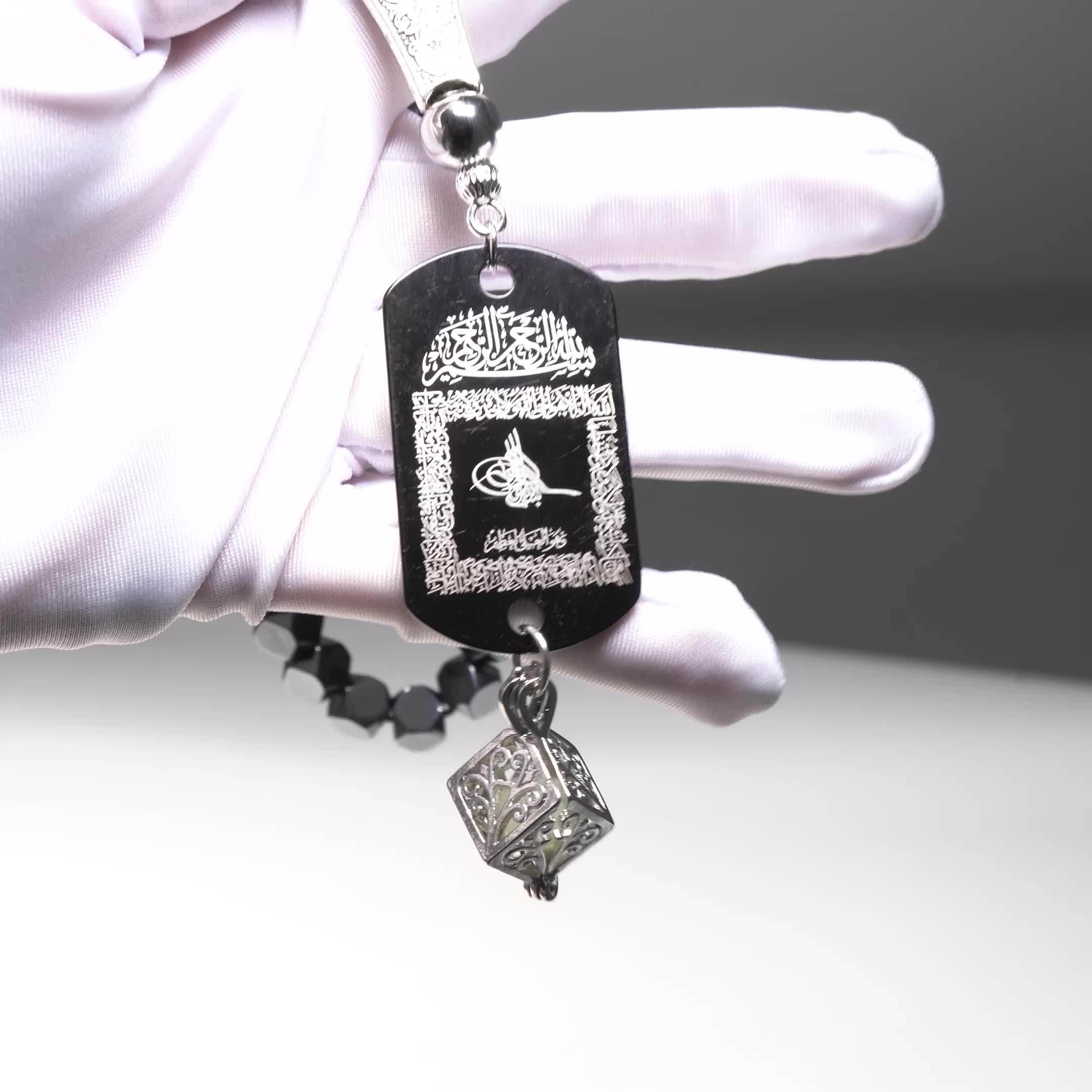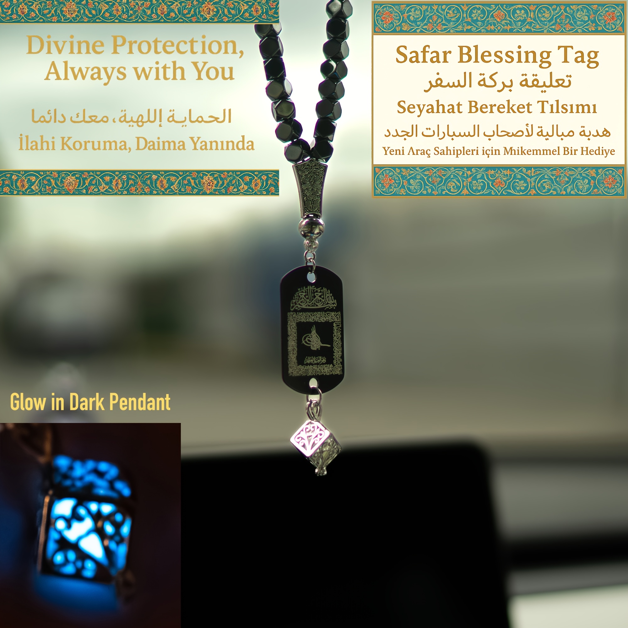 28 Febbraio 2026Set Accessorio per auto in pietra di ematite con tasbih a 33 perline, completo di ciondolo fosforescente e confezione regalo. Questo ciondolo a doppia faccia presenta l’Ayat Al-Kursi e una Dua da viaggio
