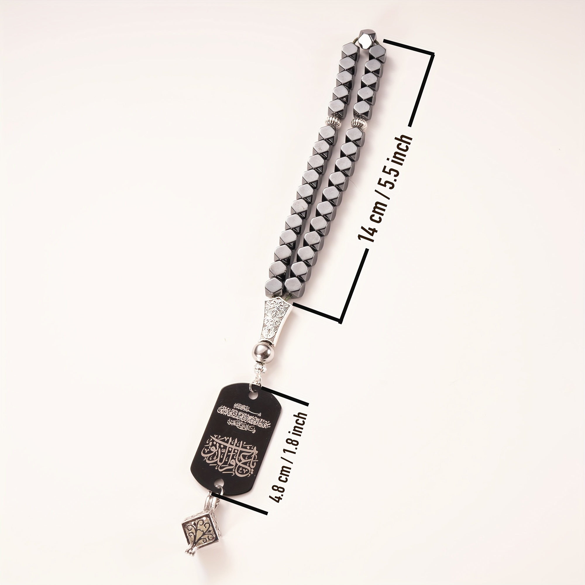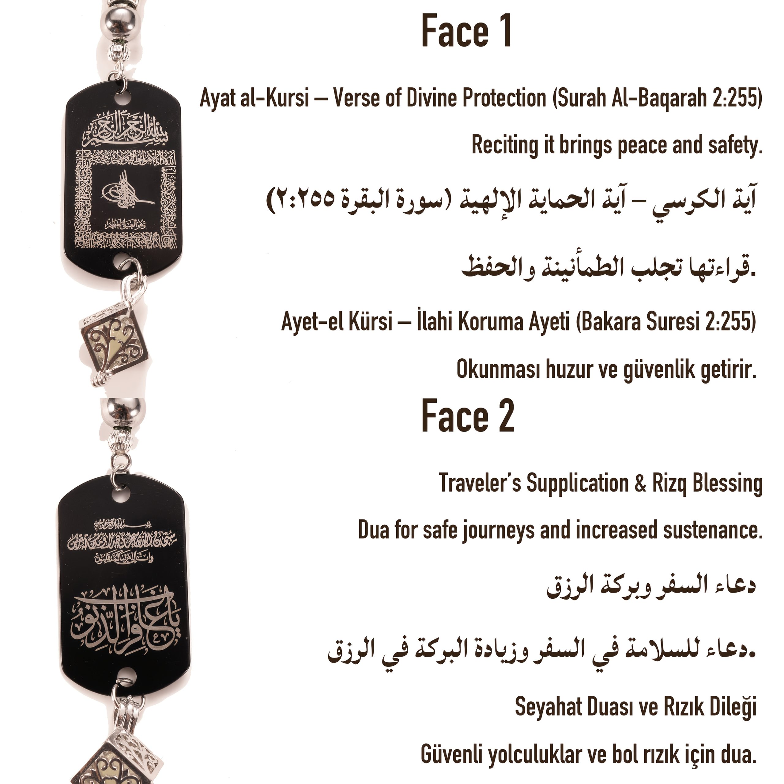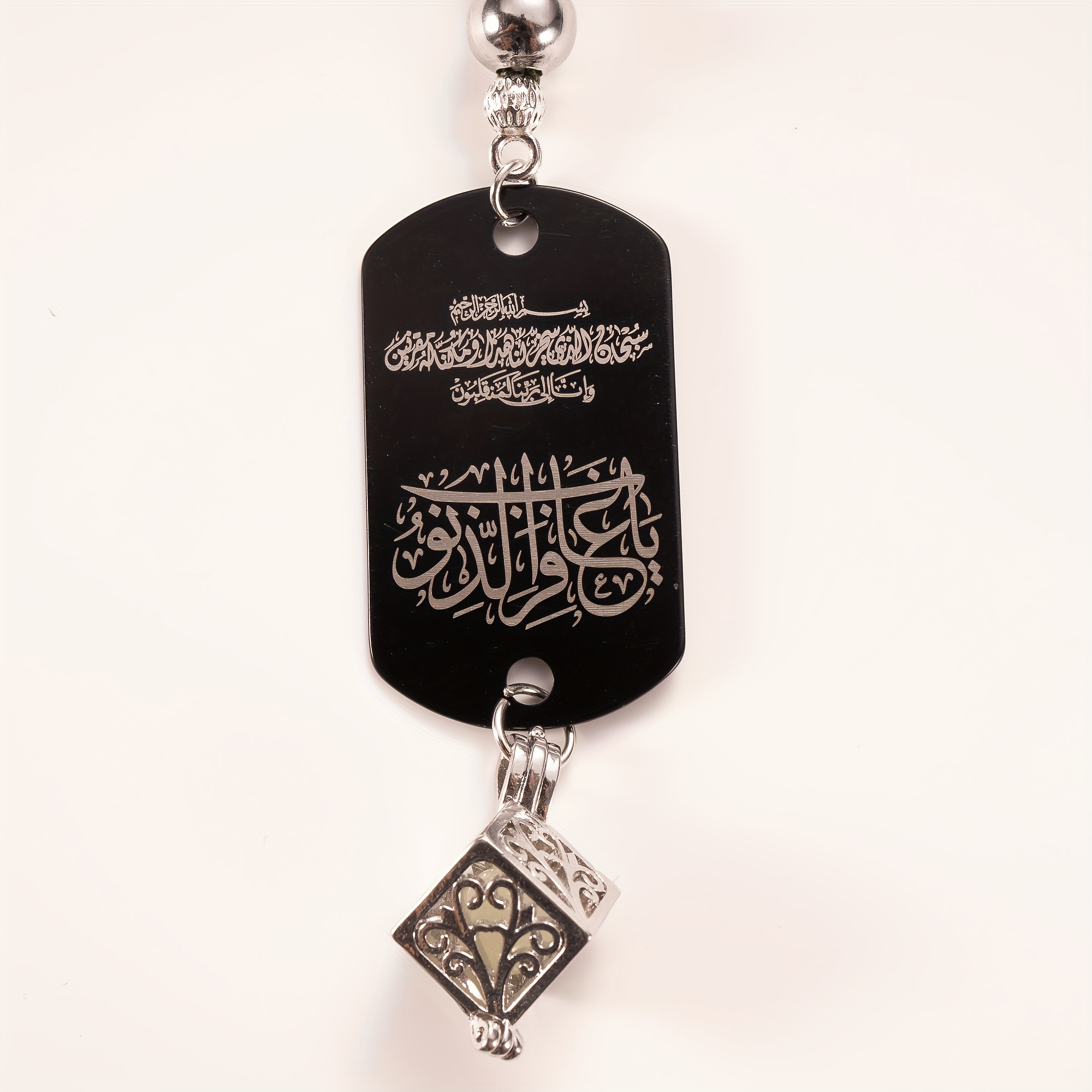 28 Febbraio 2026Set Accessorio per auto in pietra di ematite con tasbih a 33 perline, completo di ciondolo fosforescente e confezione regalo. Questo ciondolo a doppia faccia presenta l’Ayat Al-Kursi e una Dua da viaggio
