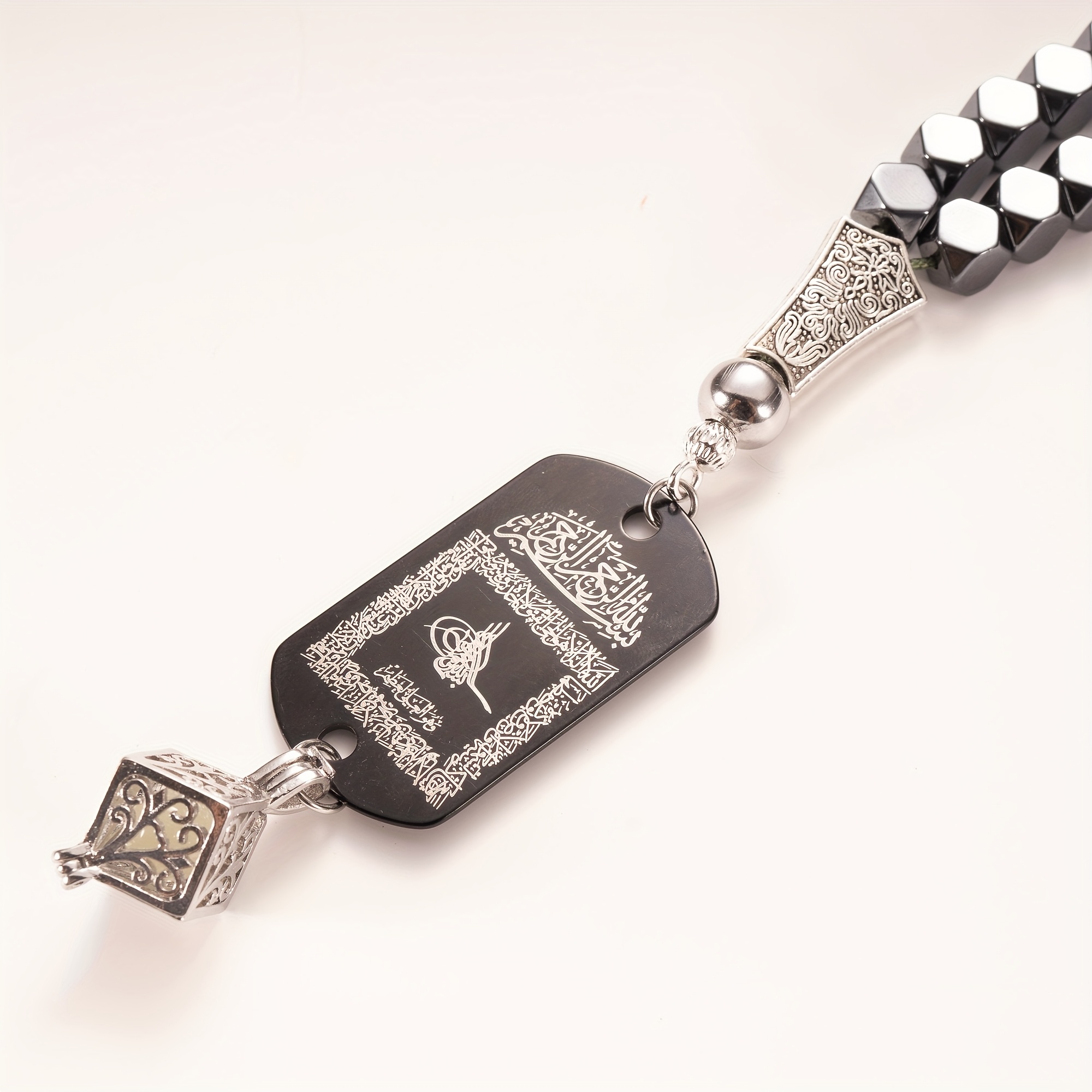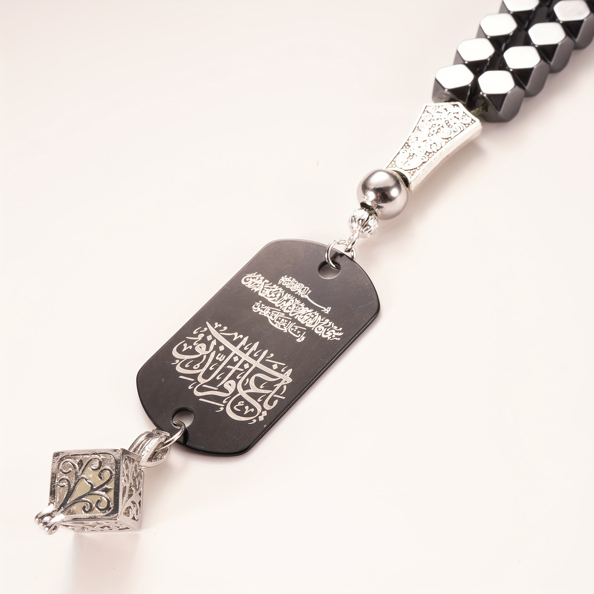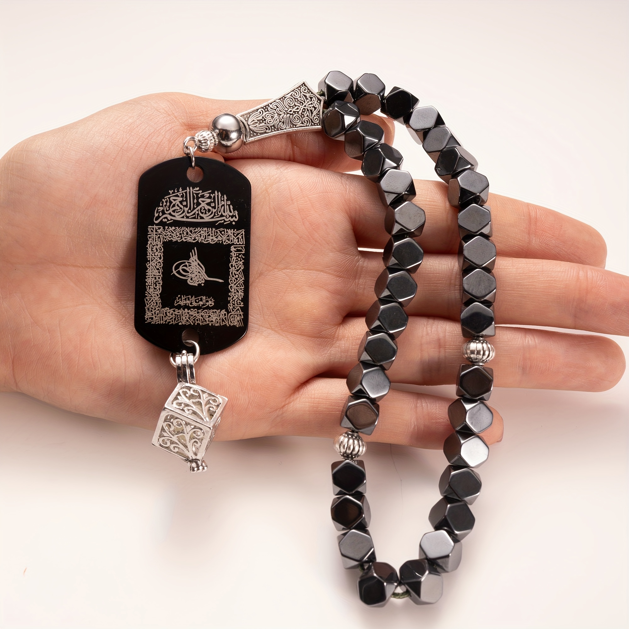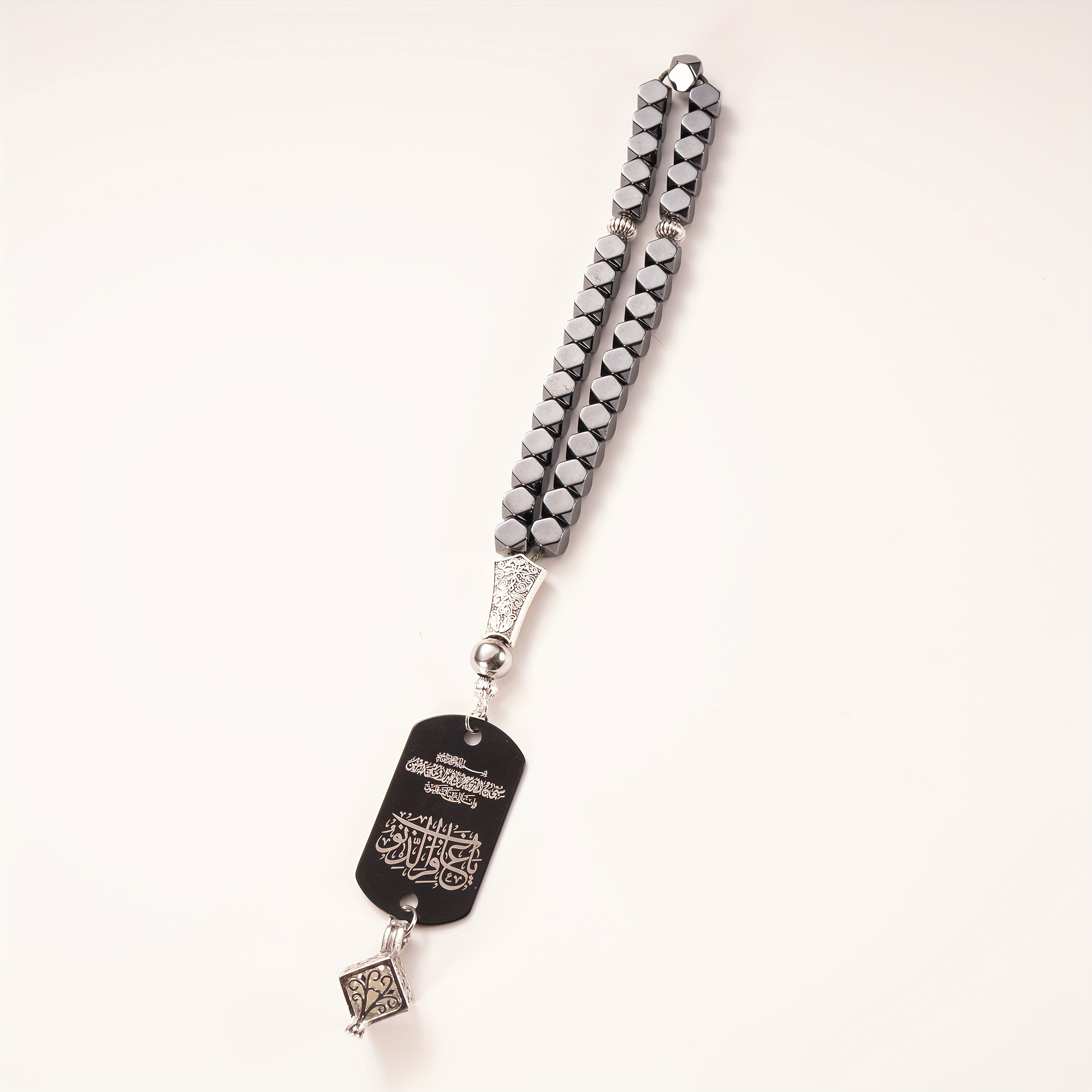 28 Febbraio 2026Set Accessorio per auto in pietra di ematite con tasbih a 33 perline, completo di ciondolo fosforescente e confezione regalo. Questo ciondolo a doppia faccia presenta l’Ayat Al-Kursi e una Dua da viaggio