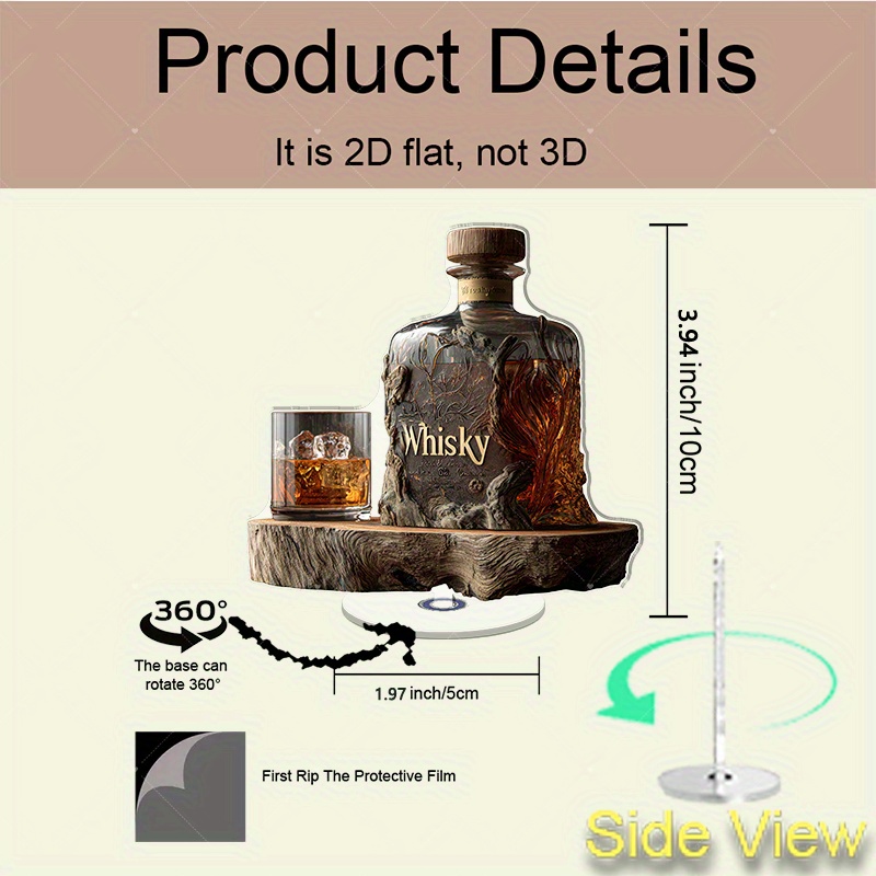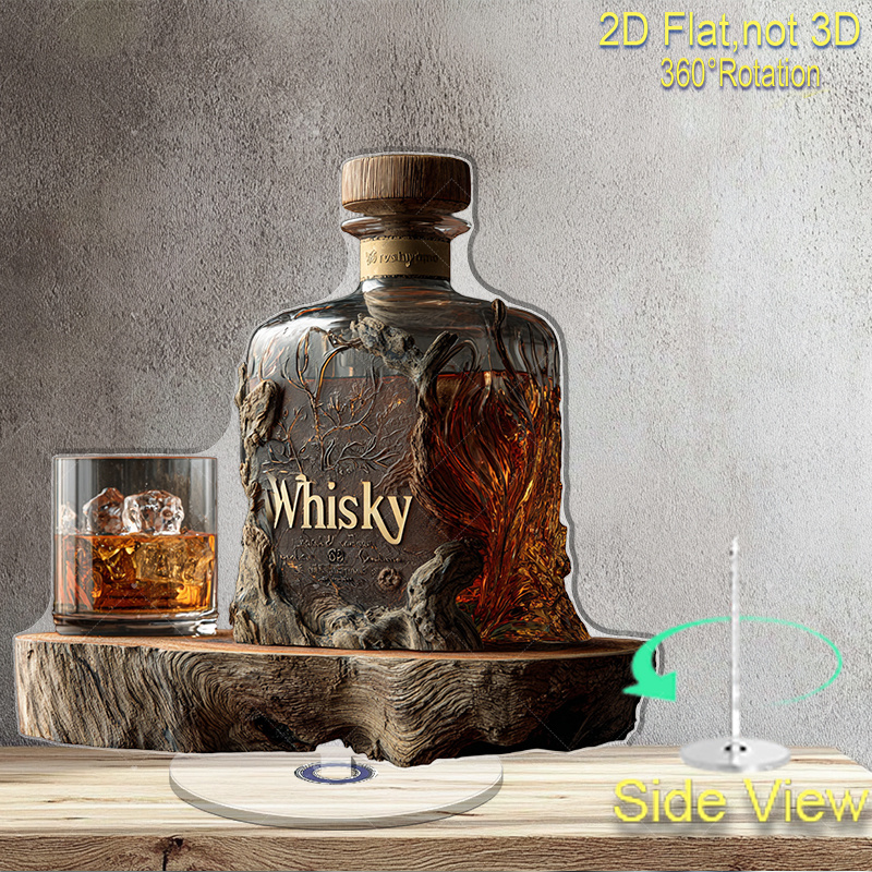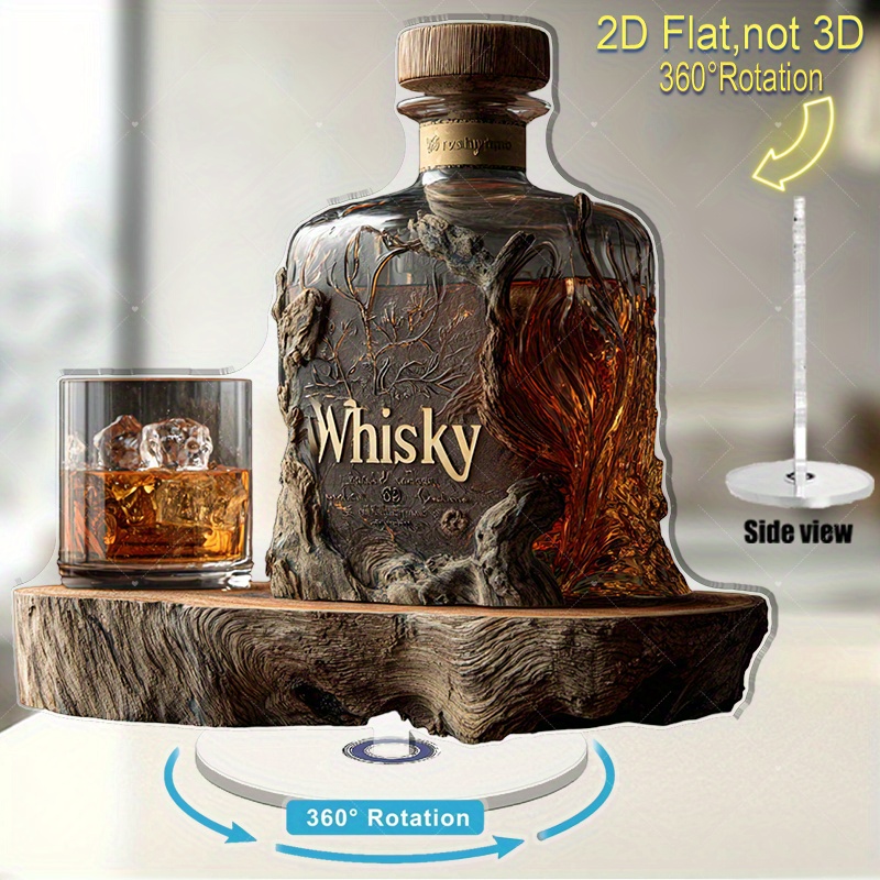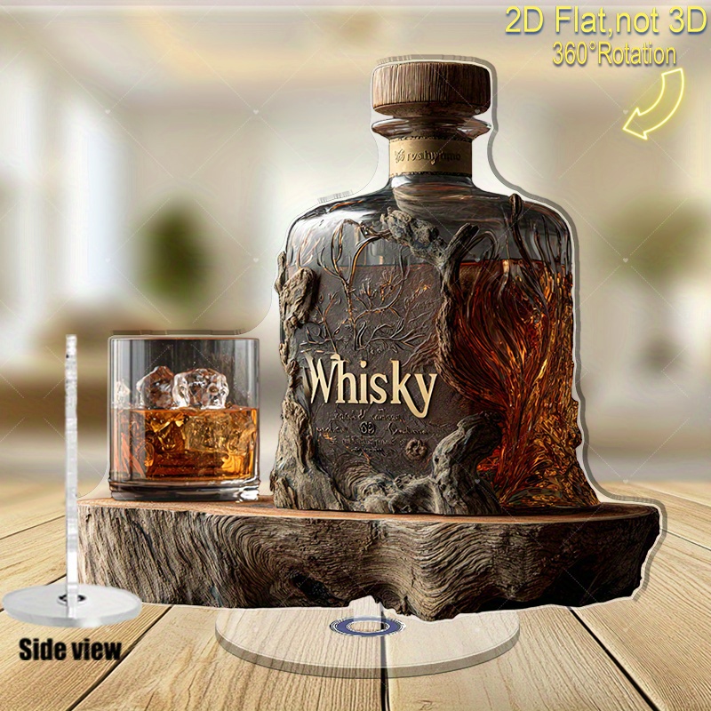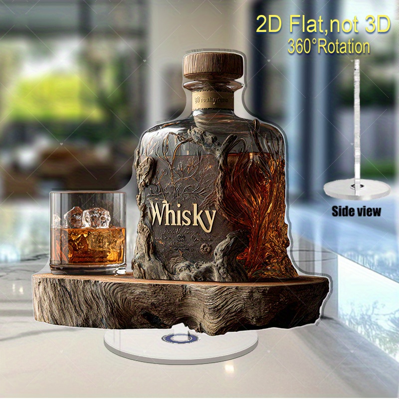 Set Bottiglia da Whisky in Acrilico Piatto 2D con Coperchio in Legno e Bicchiere – Bicchiere da Whisky Rotante Adatto per Decorazione Ufficio o Cave – Regalo Unico per Marito, Amanti del Whisky (Ornamento Stampato Piatto 2D), Piatto 2D