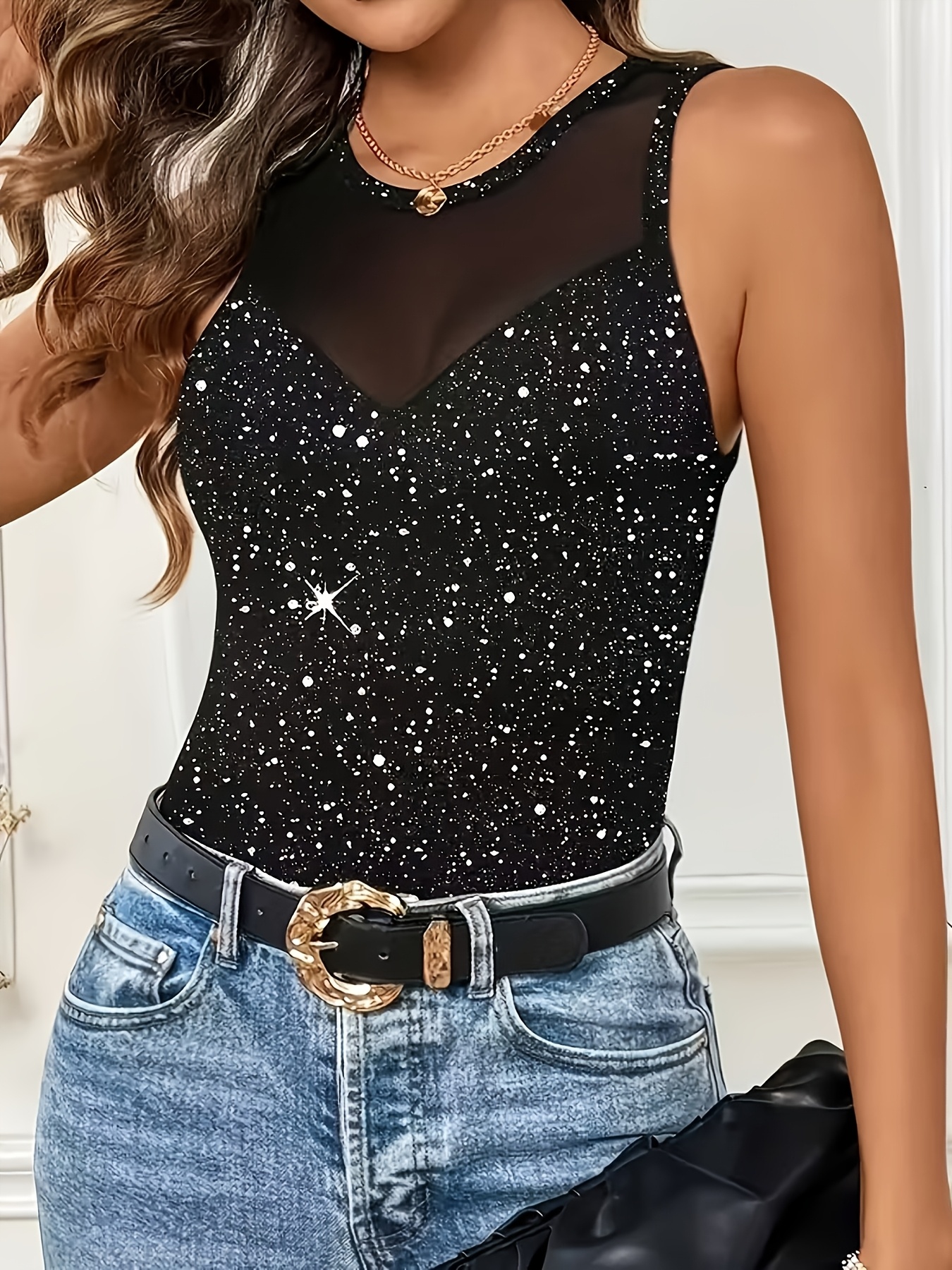16 Aprile 2026T-shirt da Donna alla Moda Elegante Scintillante Senza Maniche per Feste e Riunioni Serali