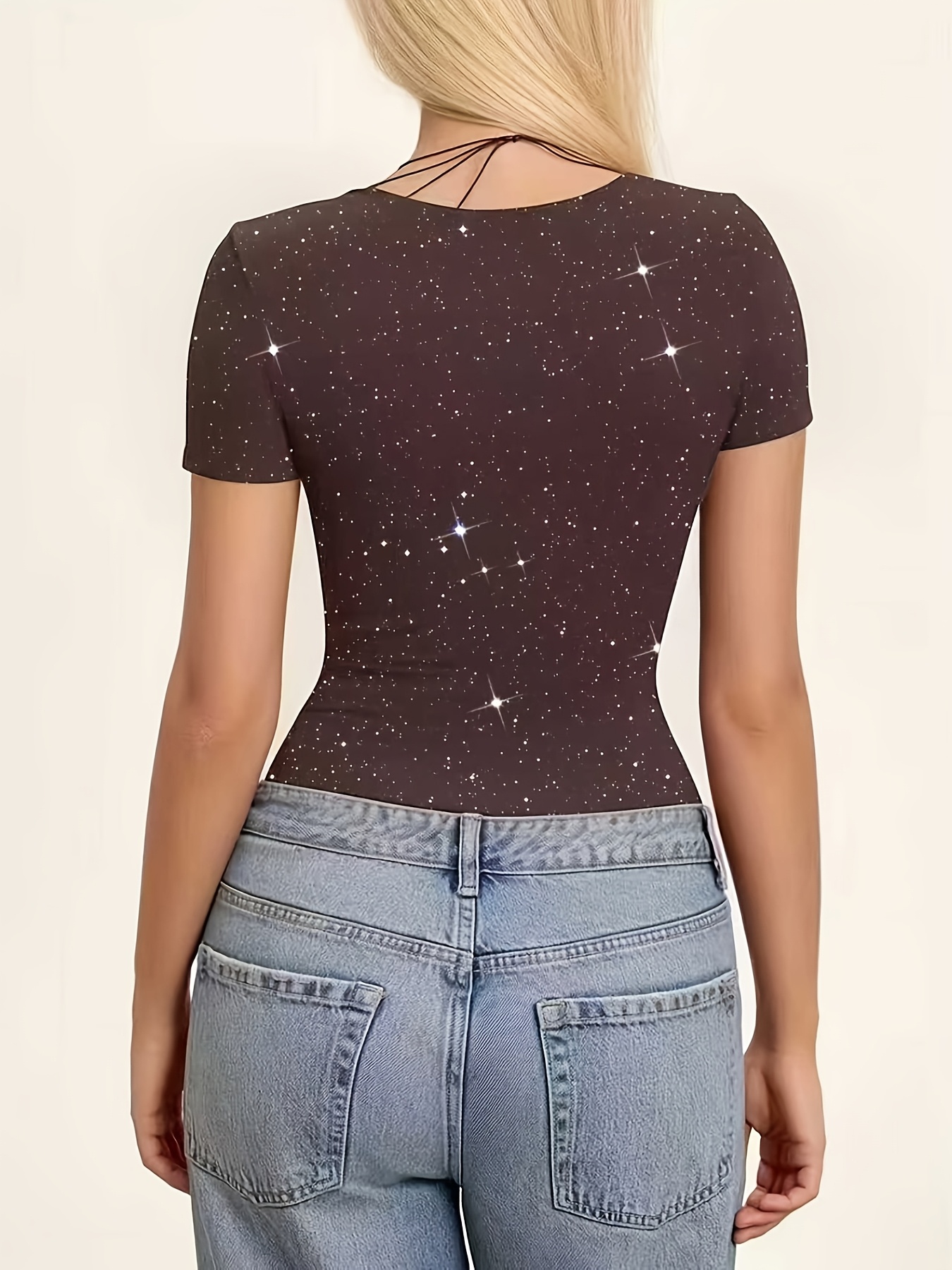16 Aprile 2026T-shirt da donna marrone caffè scintillante con scollo a V profondo, pannelli incrociati sul davanti, plissettata e aderente – Elegante maglia a maniche corte per primavera, estate e autunno, lavabile in lavatrice, stile stagionale alla moda, taglio aderente, design minimalista