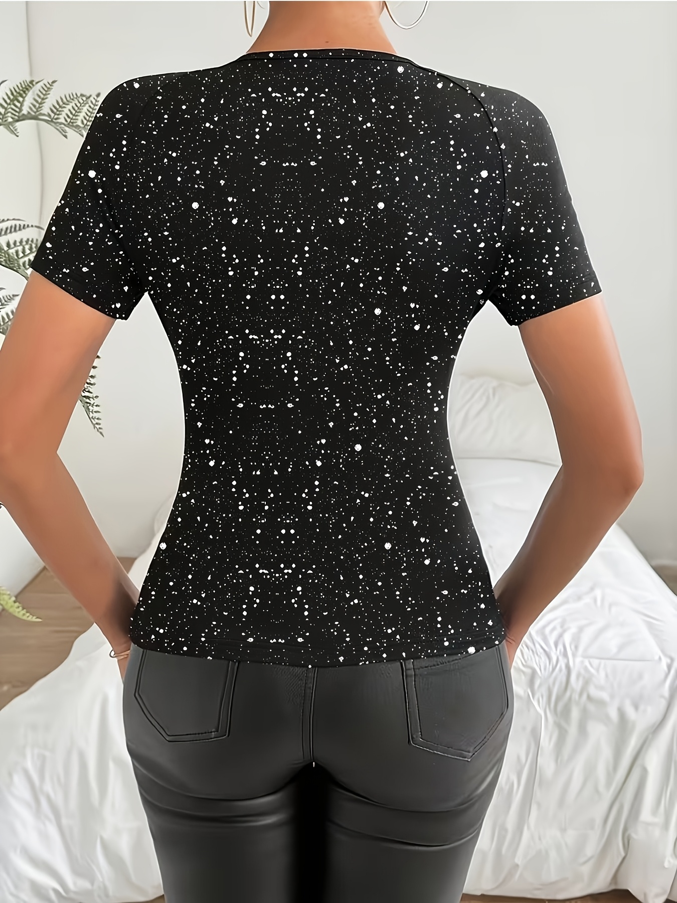 T-shirt elegante a maniche corte con paillettes, tinta unita, girocollo e scollo a V
