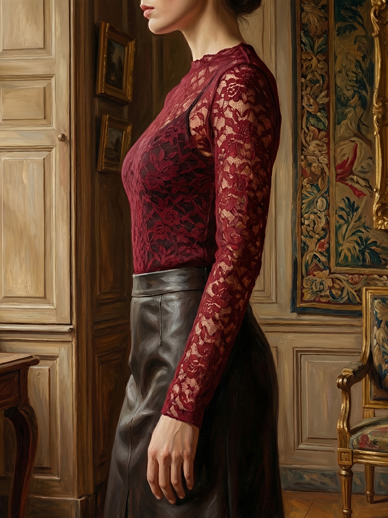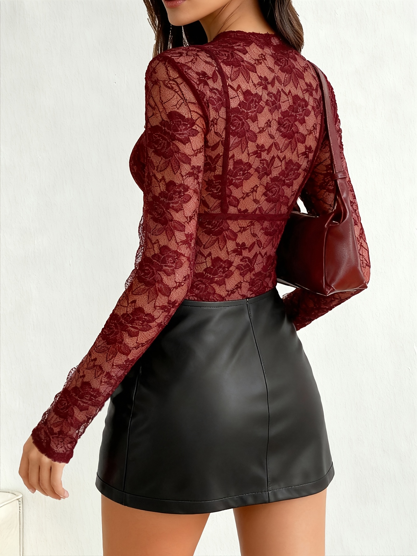 16 Aprile 2026Top aderente stile maturo con girocollo e volant trasparente a fiori di peonia, taglio casuale,