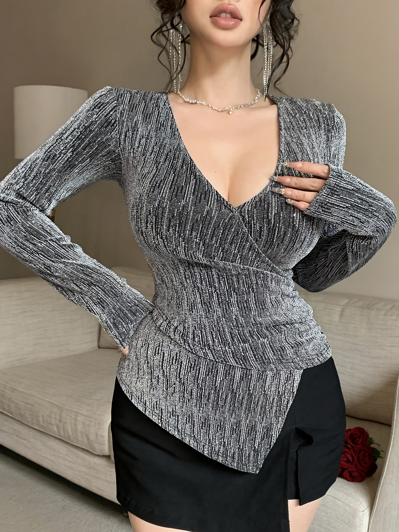16 Aprile 2026Top argentato con scintillii e texture a scollo a V che stringe in vita, maglia a maniche lunghe con orlo irregolare alla moda, top lucido a scollo a V incrociato stile Pure Desire, strato di base a maniche lunghe irregolari aderente che stringe in vita, top lucido con scollo a V