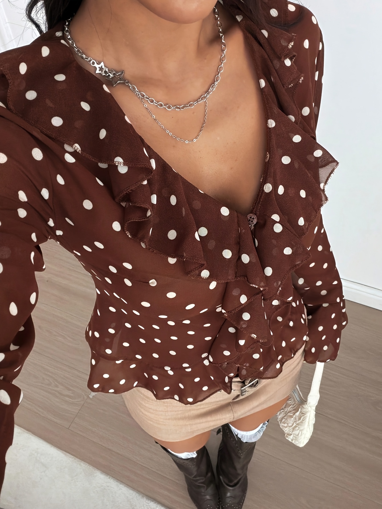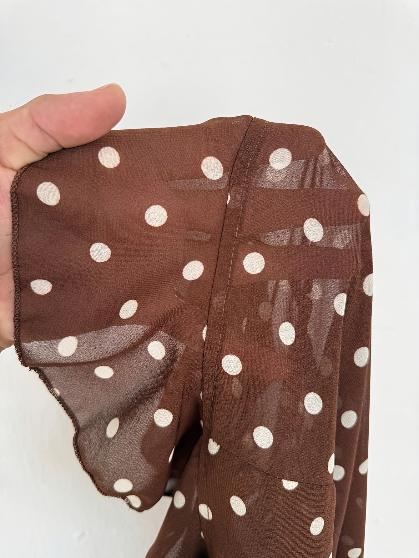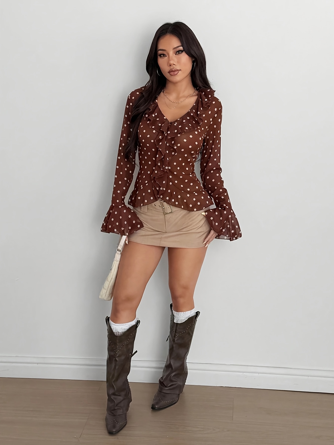 16 Aprile 2026Nuovo Top da Donna alla Moda Marrone a Pois in Chiffon Trasparente a Maniche Lunghe con Volant, Perfetto per Uscite e Street Style
