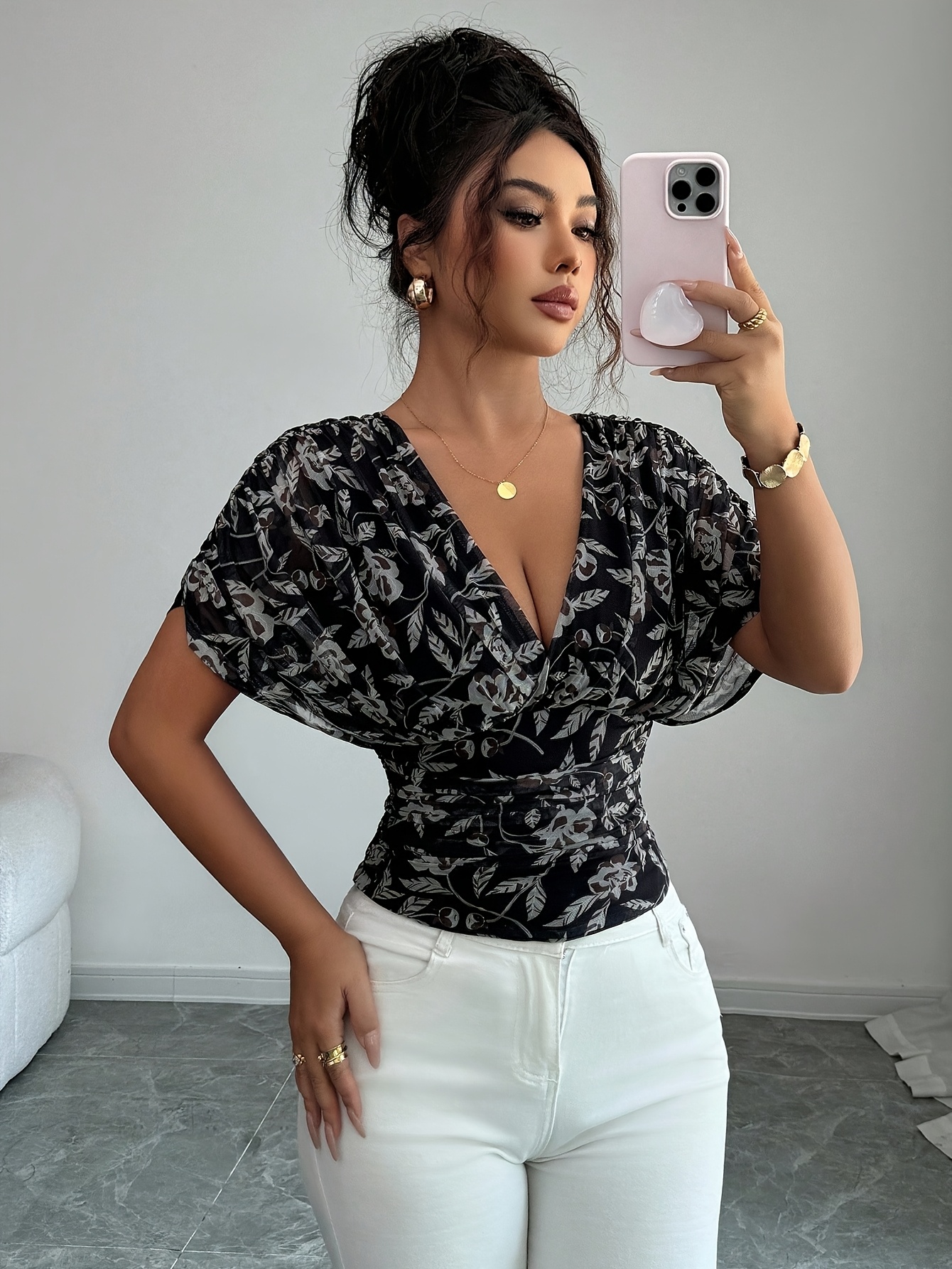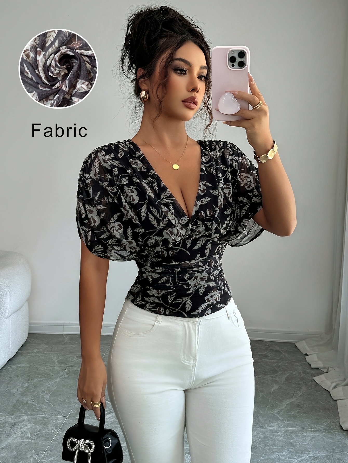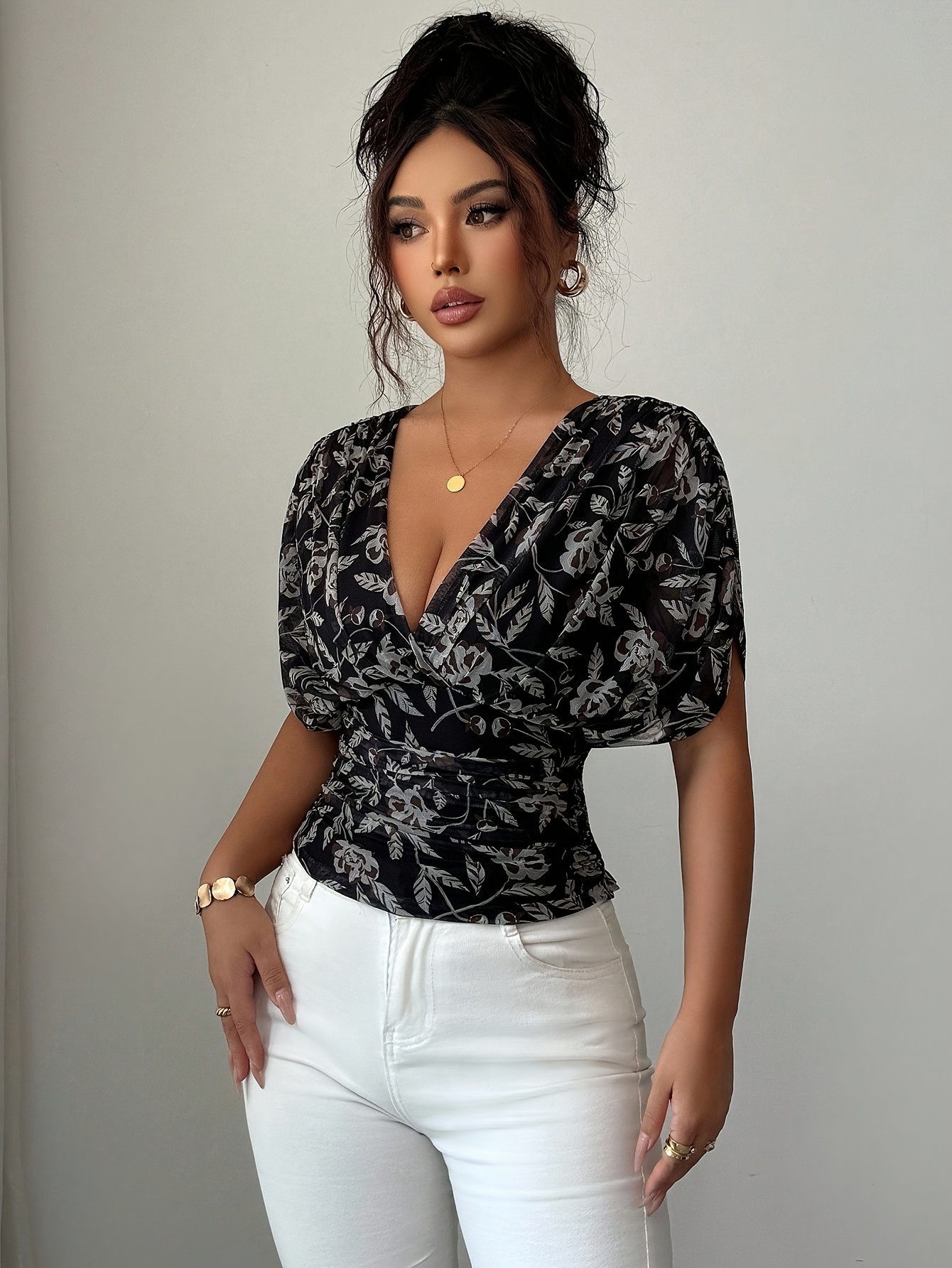 16 Aprile 2026Top da donna nero con stampa floreale a inchiostro, scollo a V e vita stretta, un capo in stile vintage maturo-casual per occasioni sociali leggere