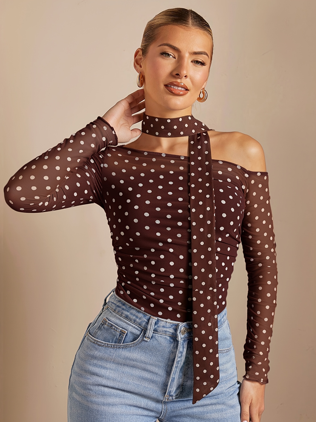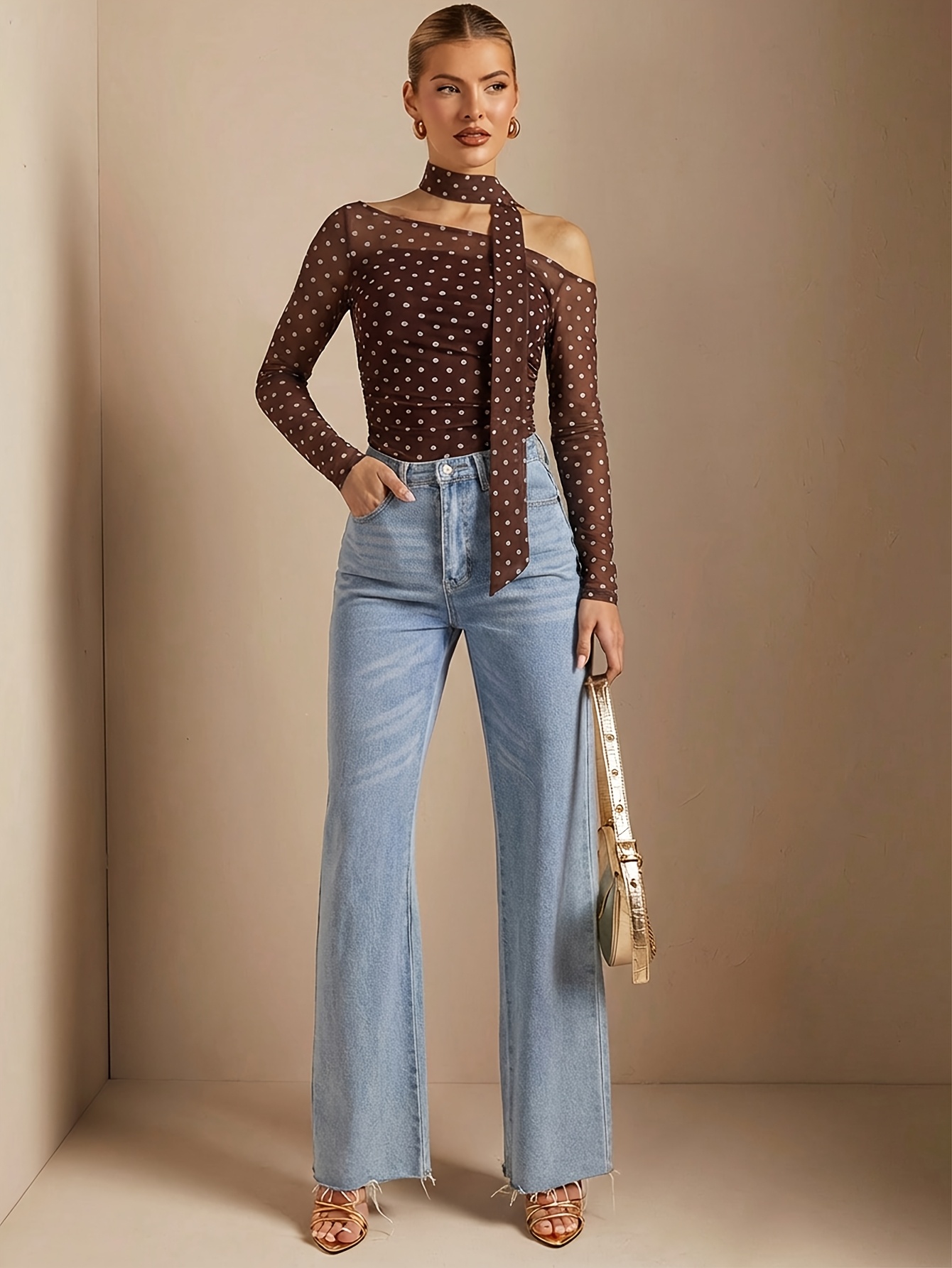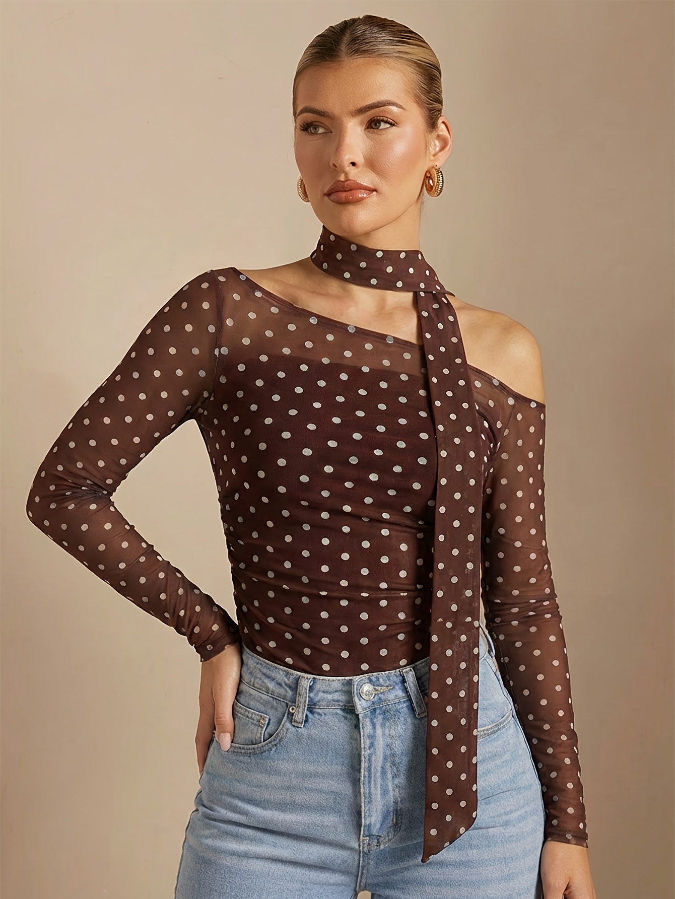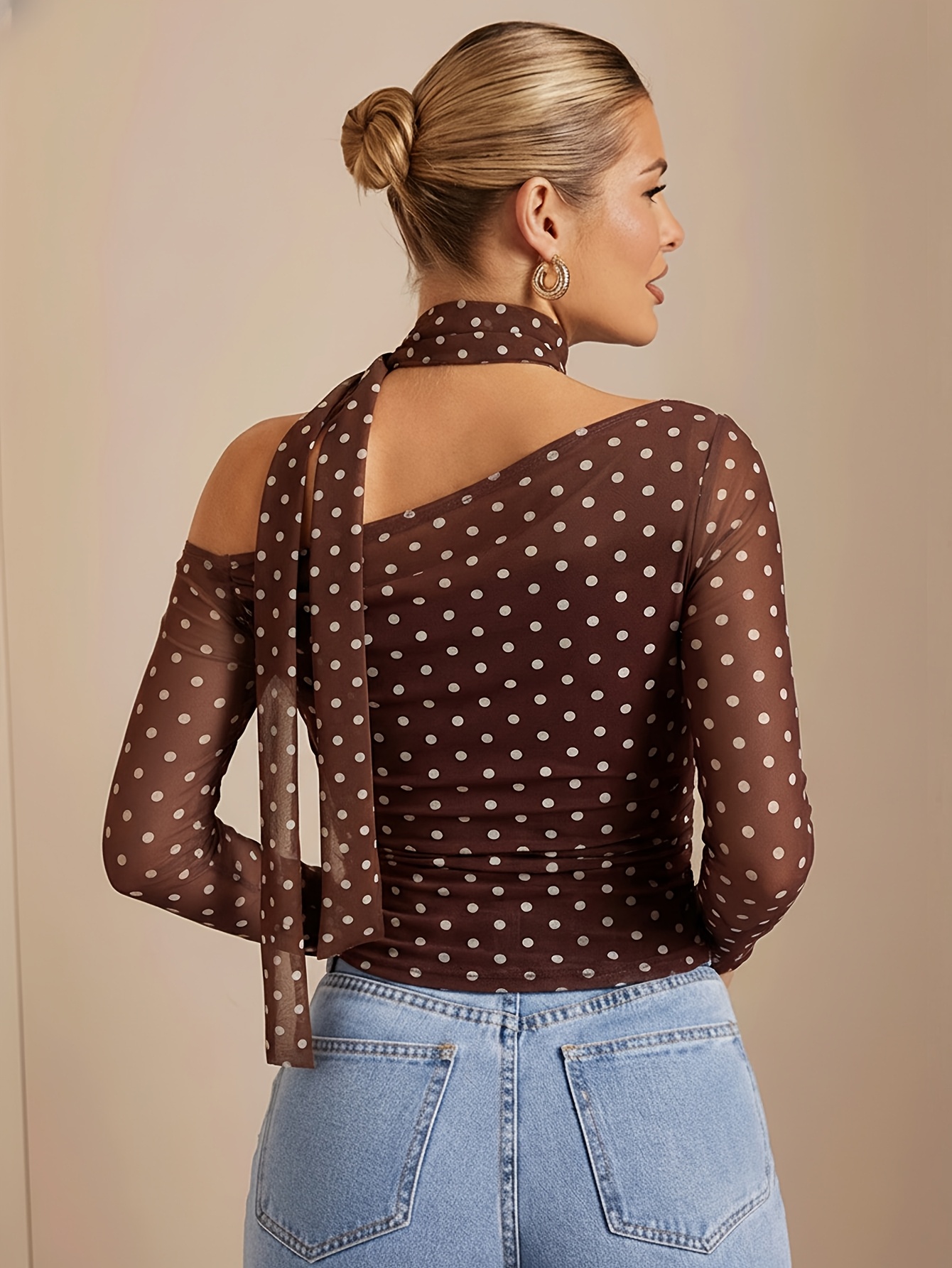 16 Aprile 2026Top Donna a Pois Marrone – Scollo Asimmetrico con Pizzo Trasparente a Pois e T-Shirt Aderente, Ideale per Diverse Occasioni come Streetwear, Pendolarismo, Uscite Casual, Appuntamenti, Riunioni con Amici e Vacanze