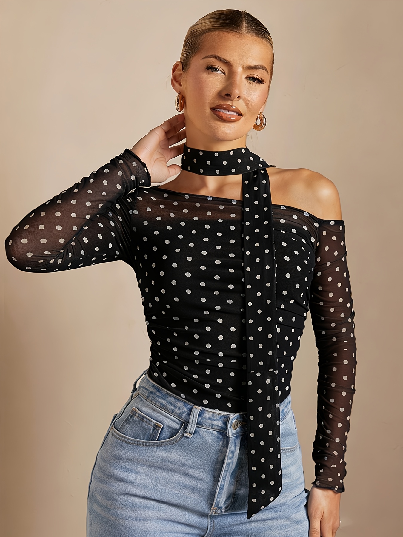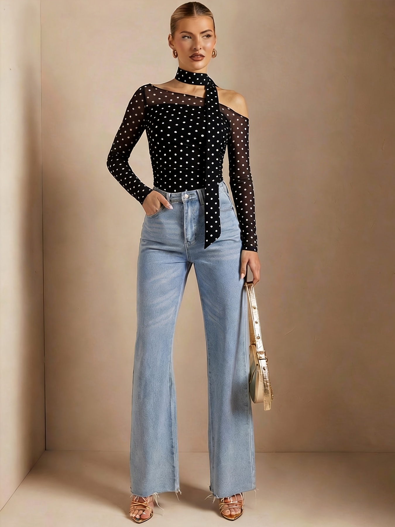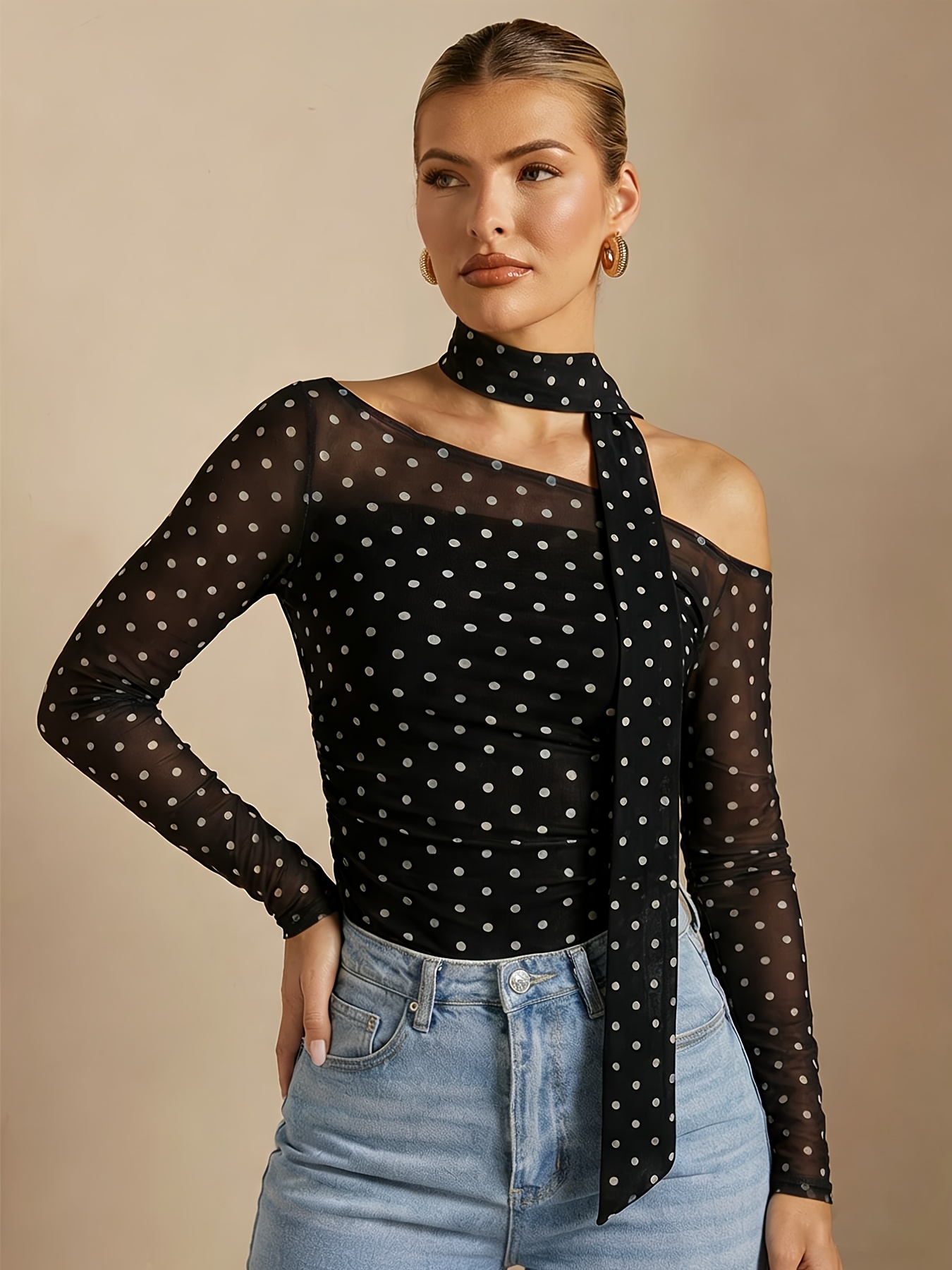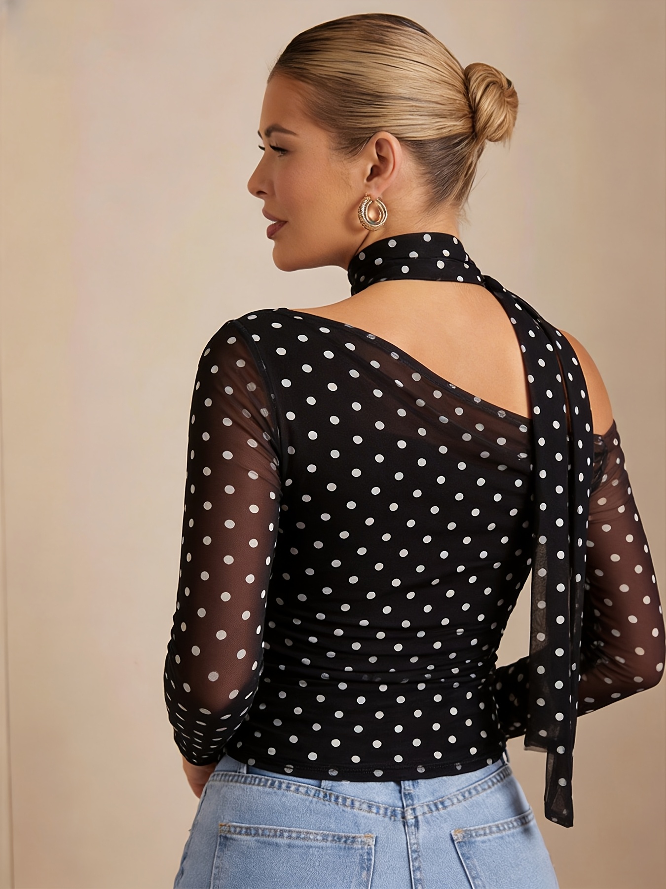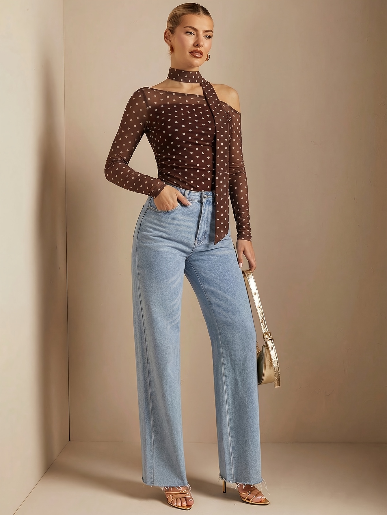 16 Aprile 2026Top Donna a Pois Marrone – Scollo Asimmetrico con Pizzo Trasparente a Pois e T-Shirt Aderente, Ideale per Diverse Occasioni come Streetwear, Pendolarismo, Uscite Casual, Appuntamenti, Riunioni con Amici e Vacanze