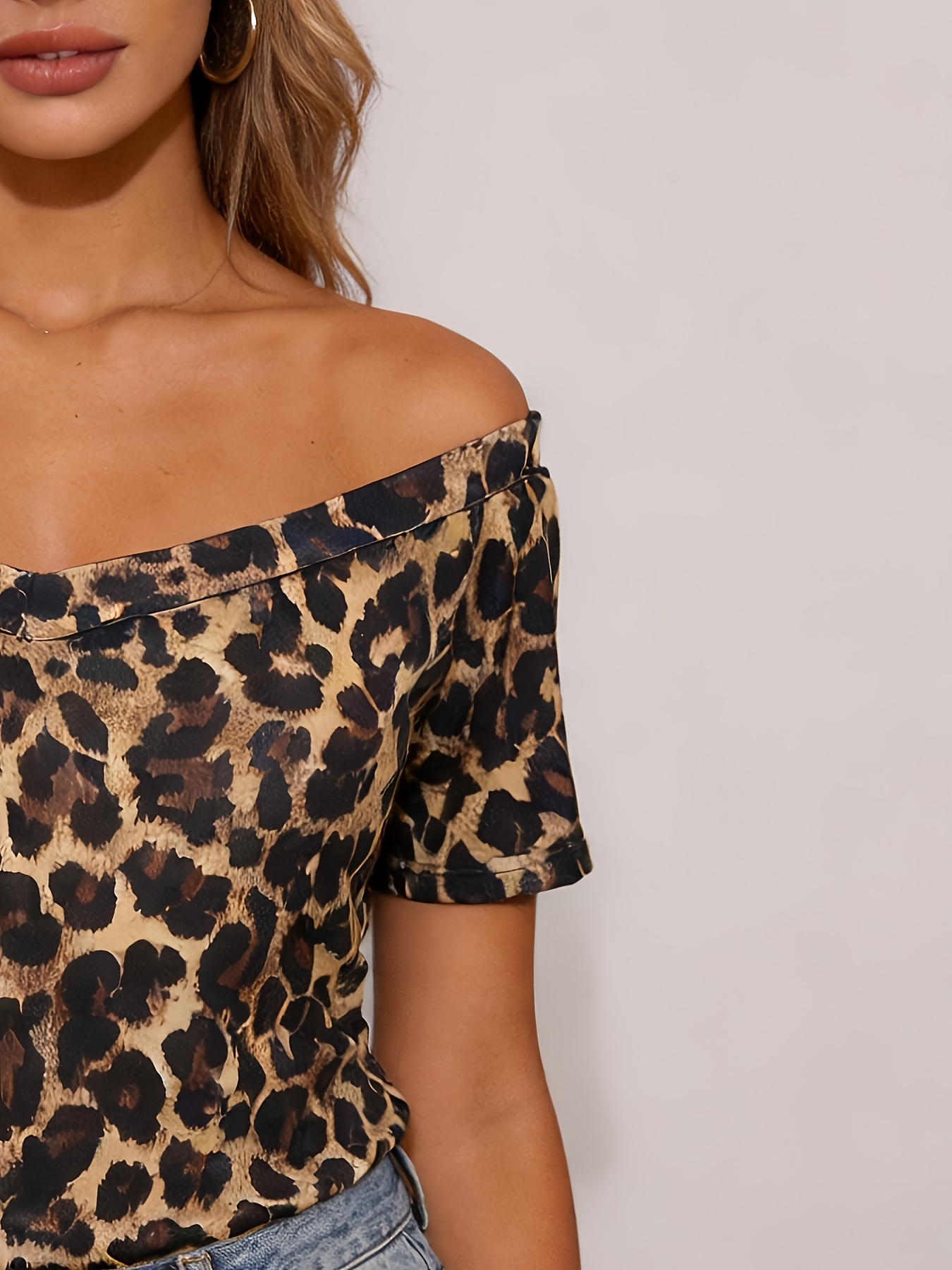 16 Aprile 2026Top estivo da donna a maniche corte con scollo a V doppio, stampa leopardata, aderente, con spalle scoperte